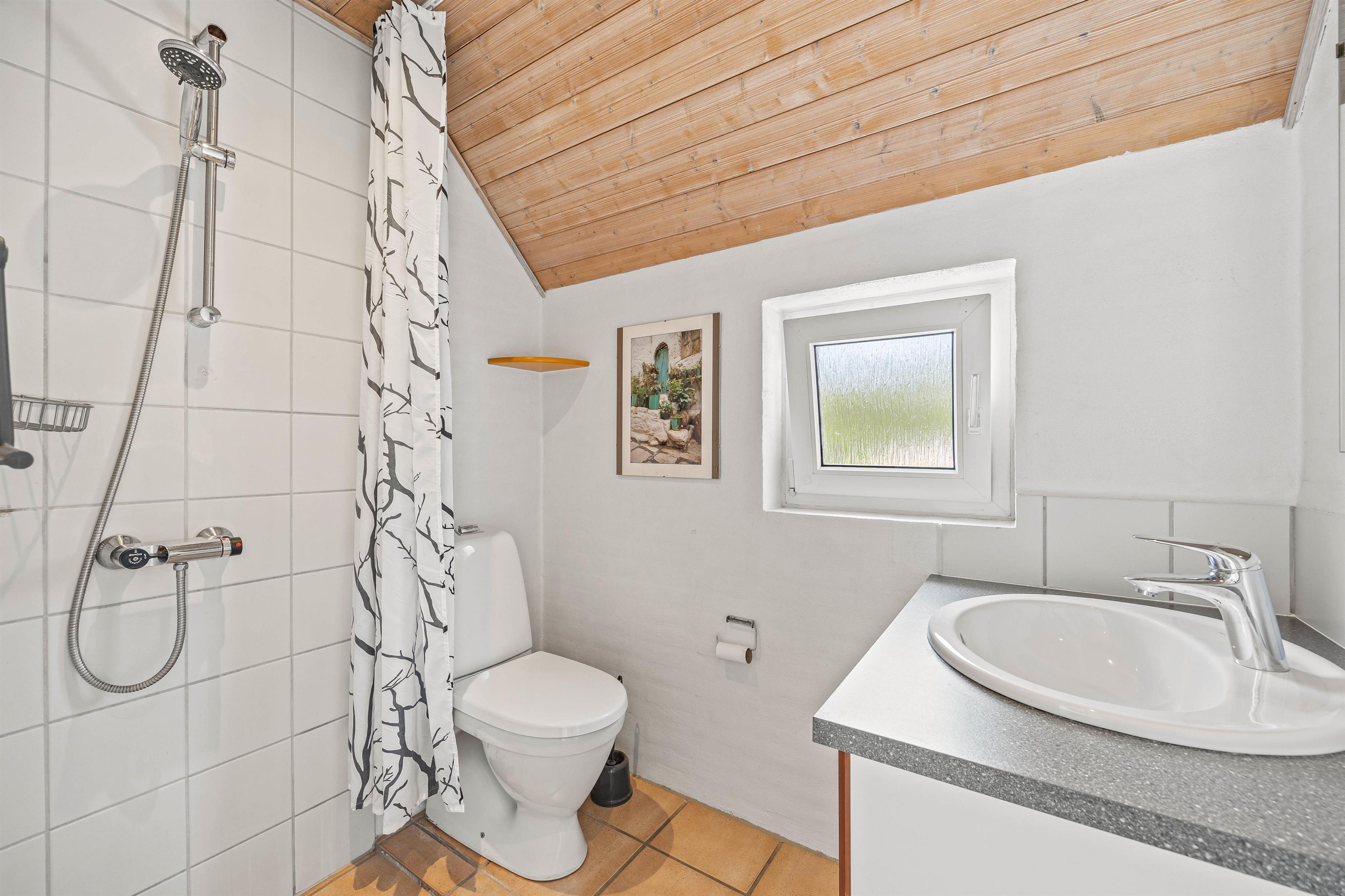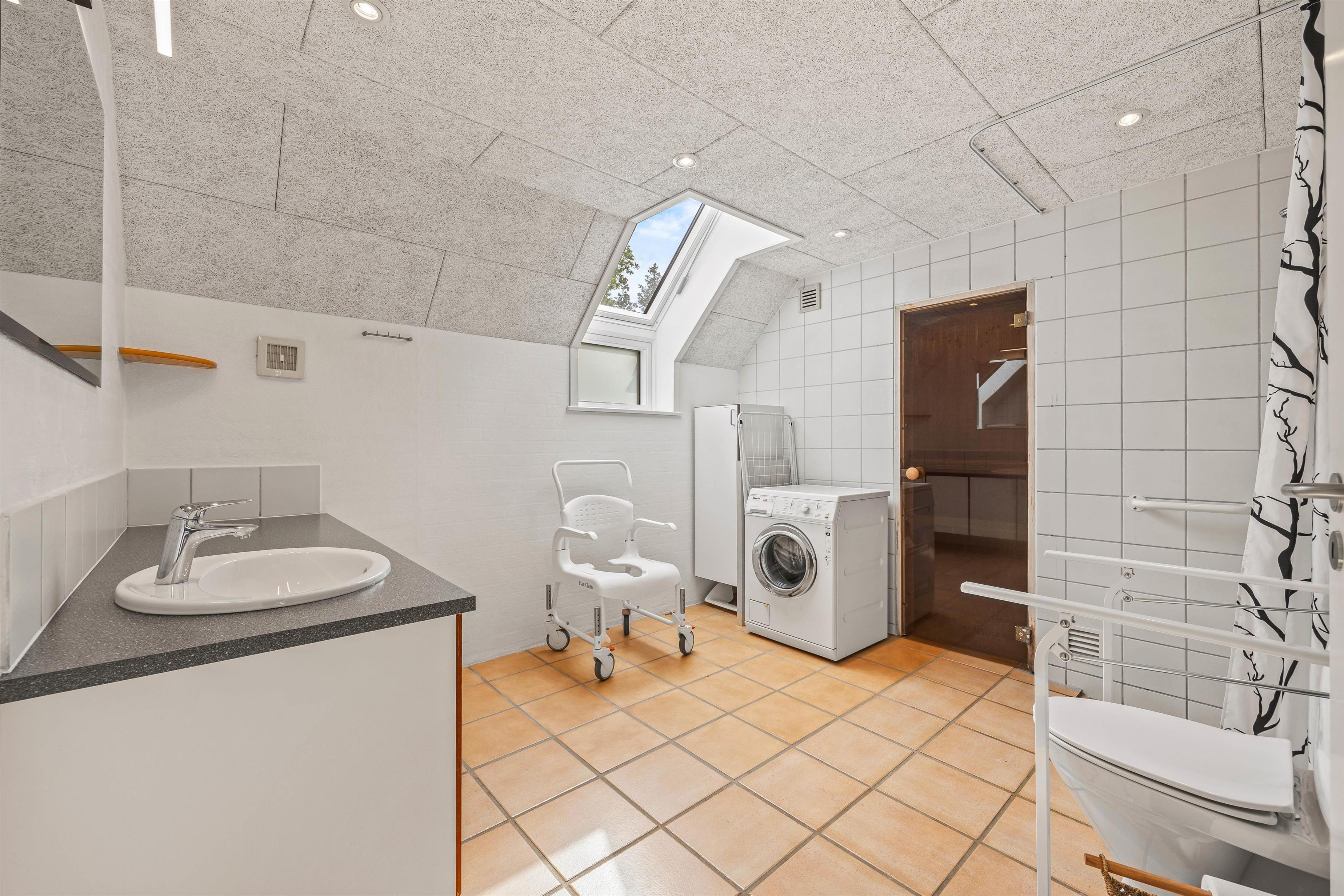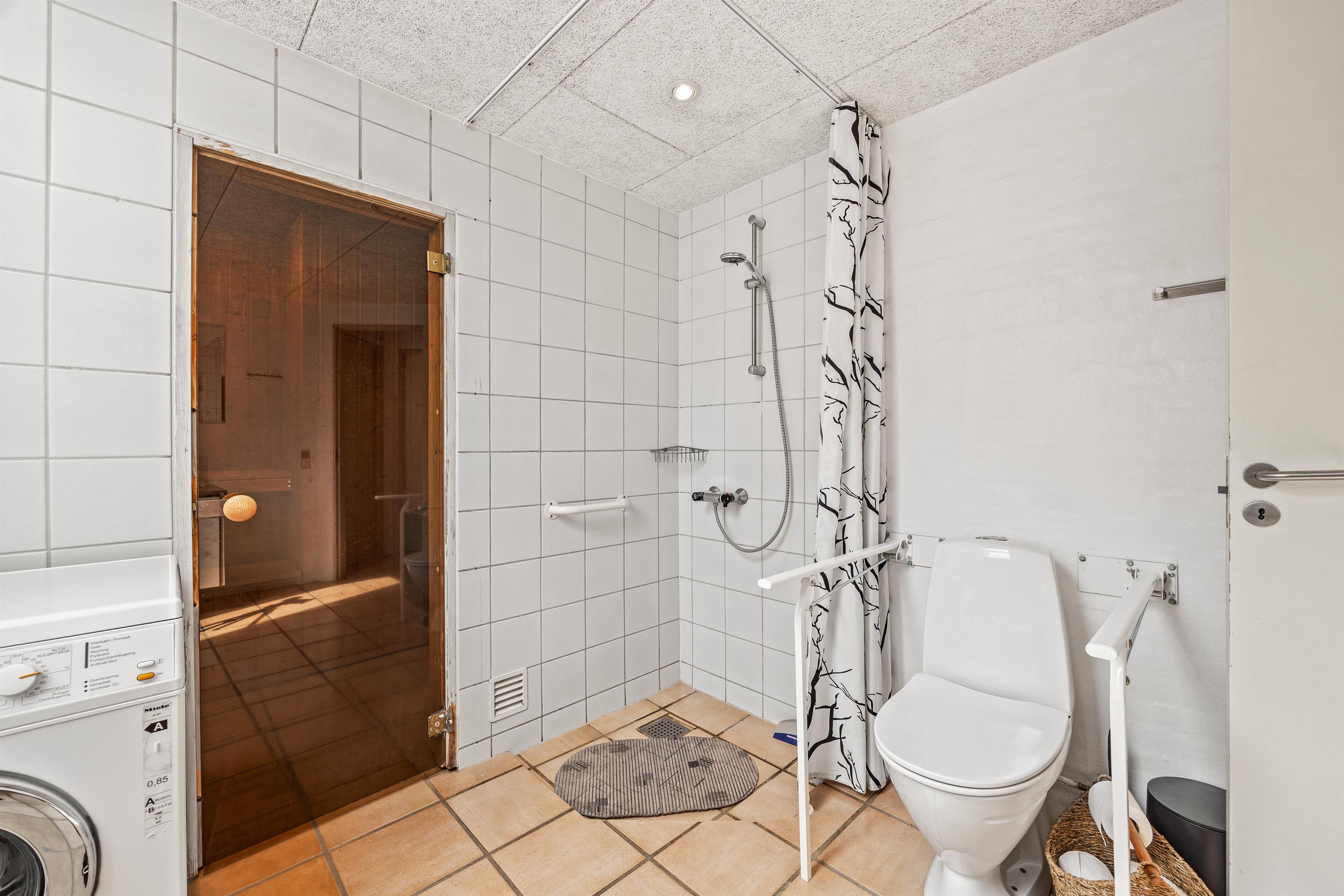I feriehuset er der 2 badeværelser, begge med gulvvarme, hvilket sikrer en behagelig temperatur hele året rundt. I den ene af disse finder I et ekstra element af afslapning, nemlig en sauna, hvor I kan slappe af efter en dag med eventyr i de skønne skovområder.