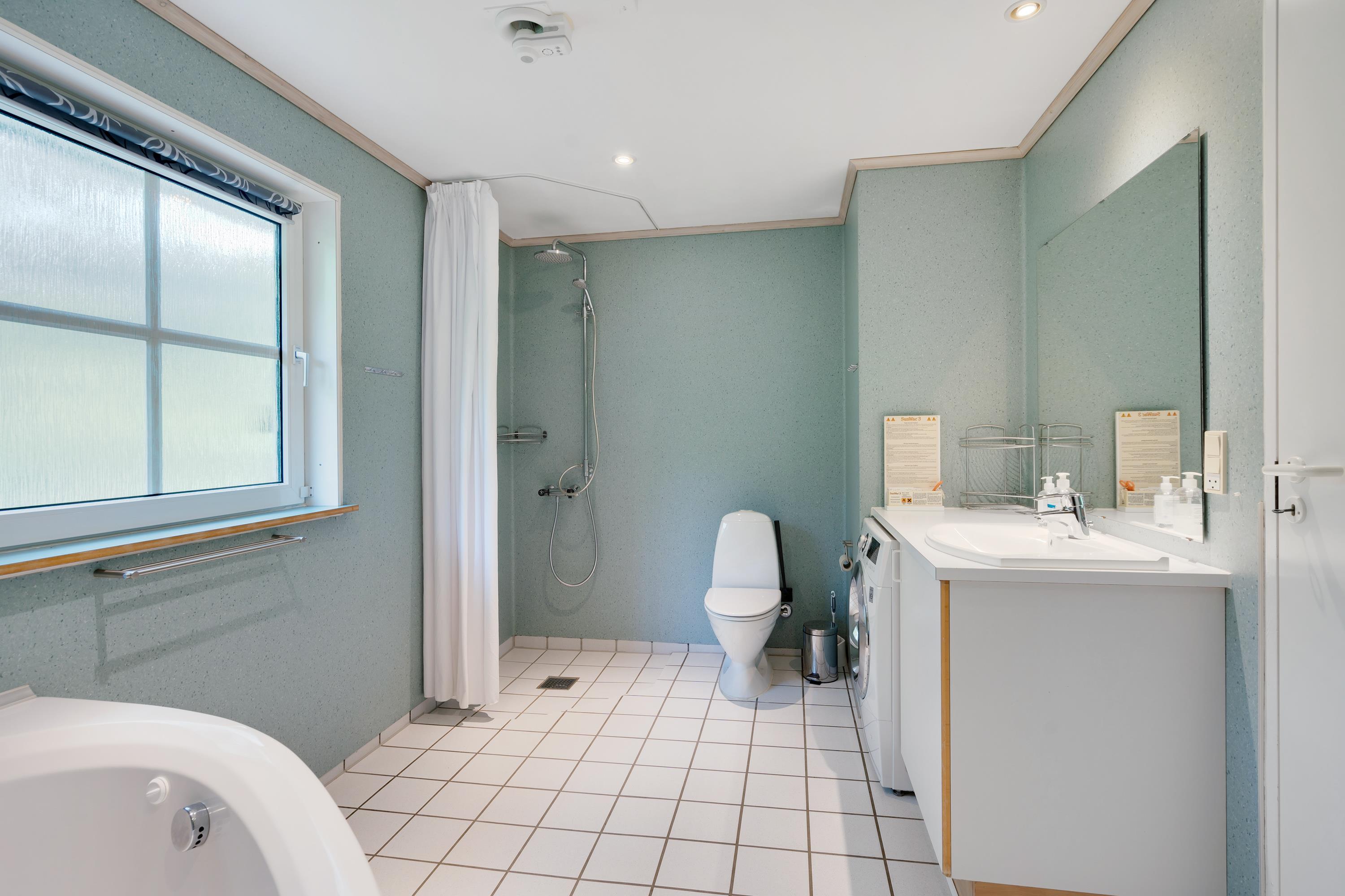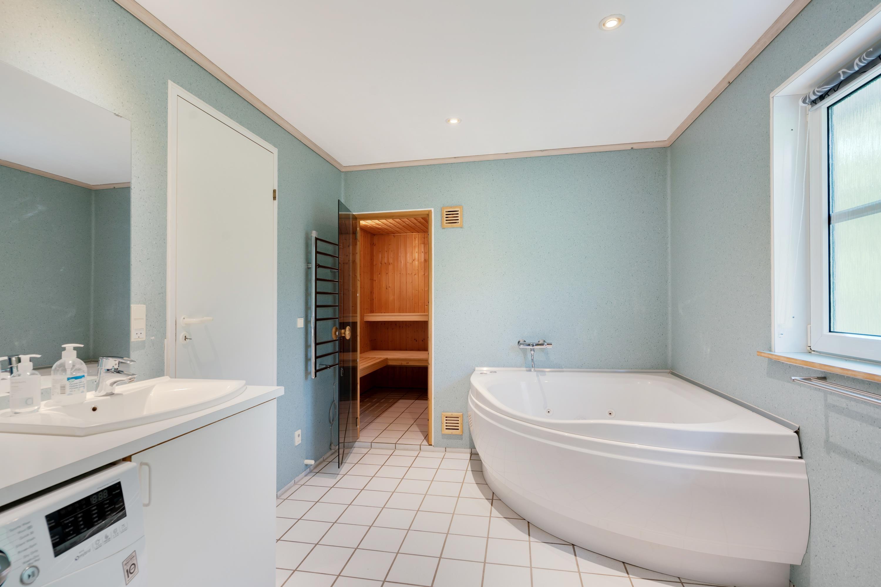 Det moderne badeværelse med gulvarme indholder også spa og sauna, som kan nydes efter en lang dag i naturen.
