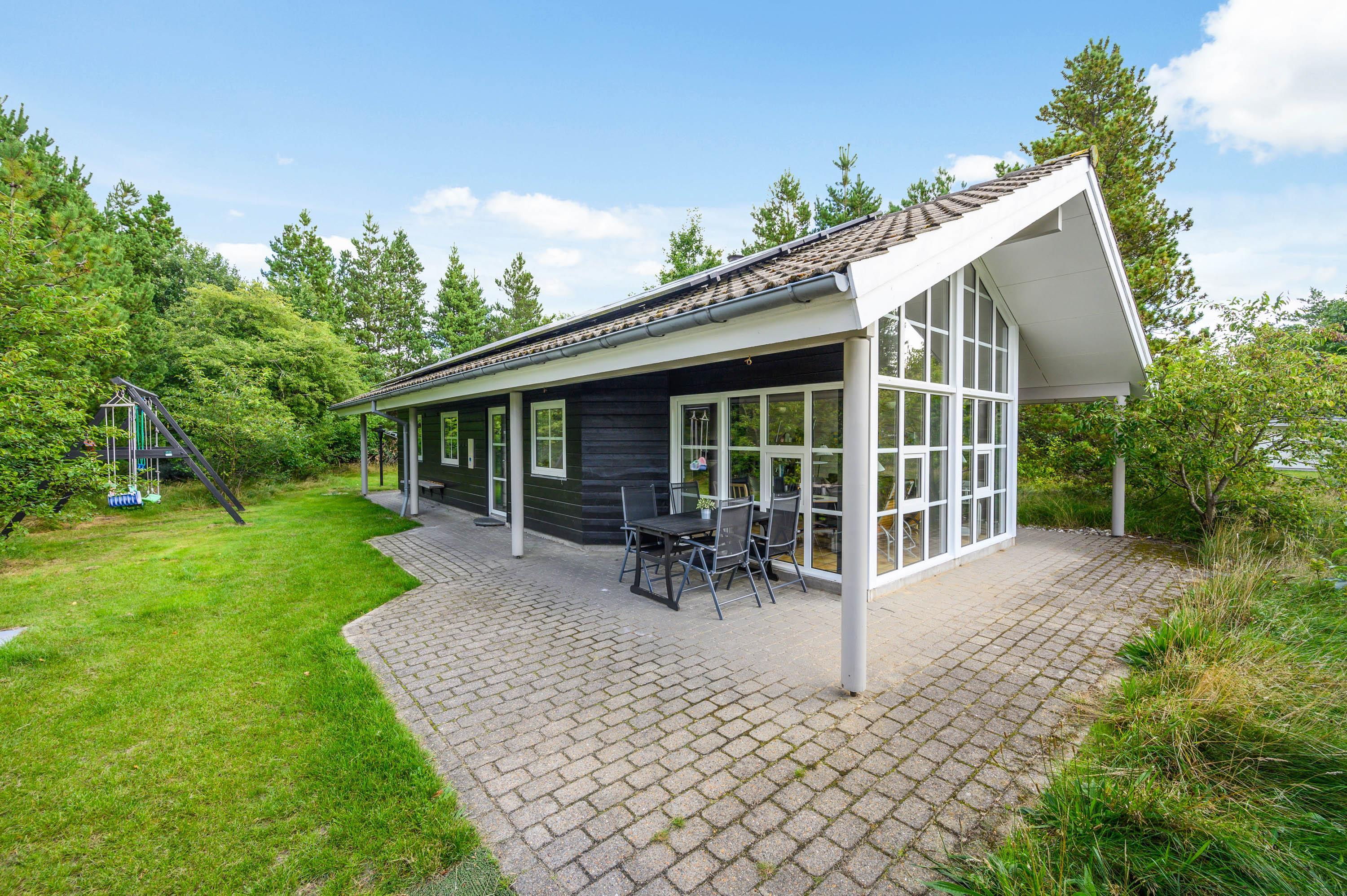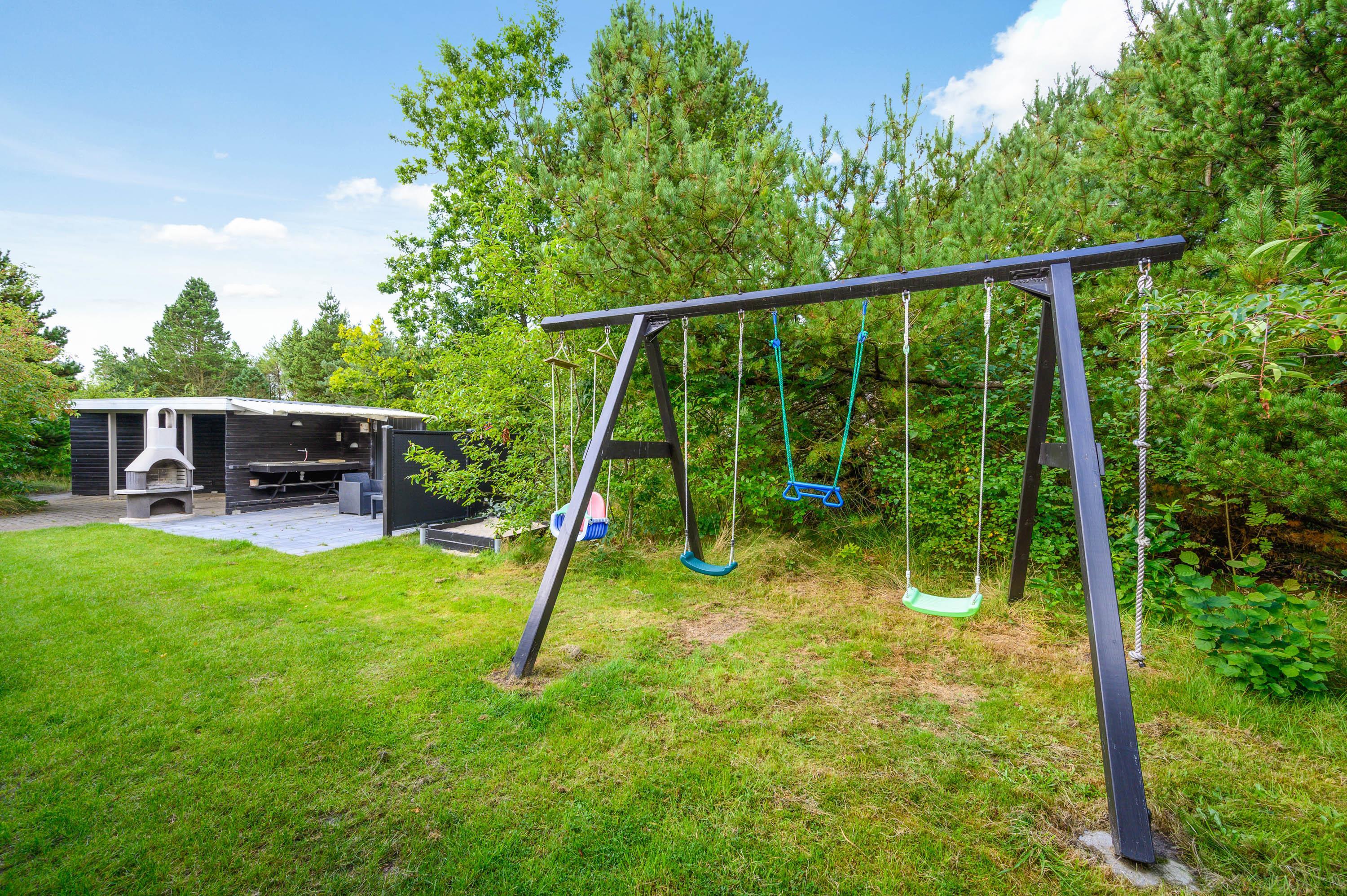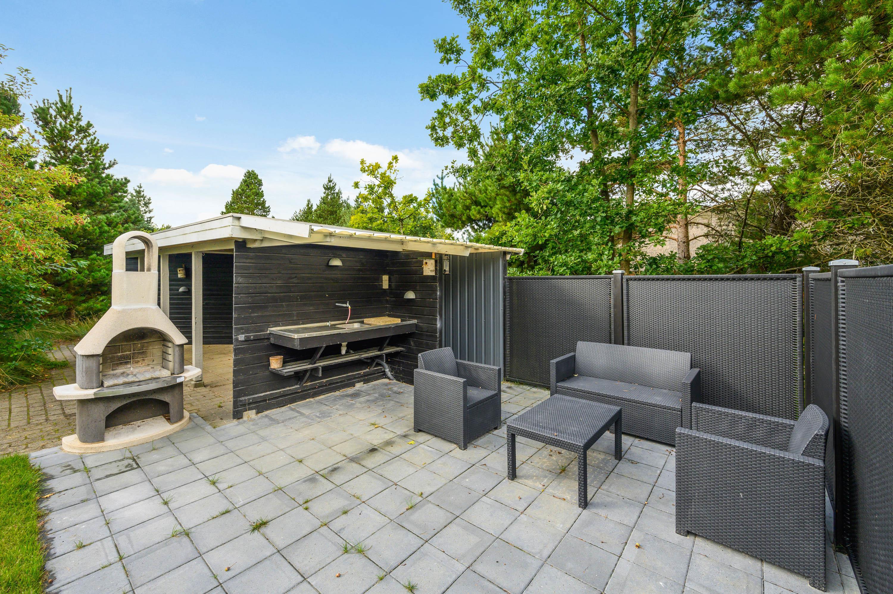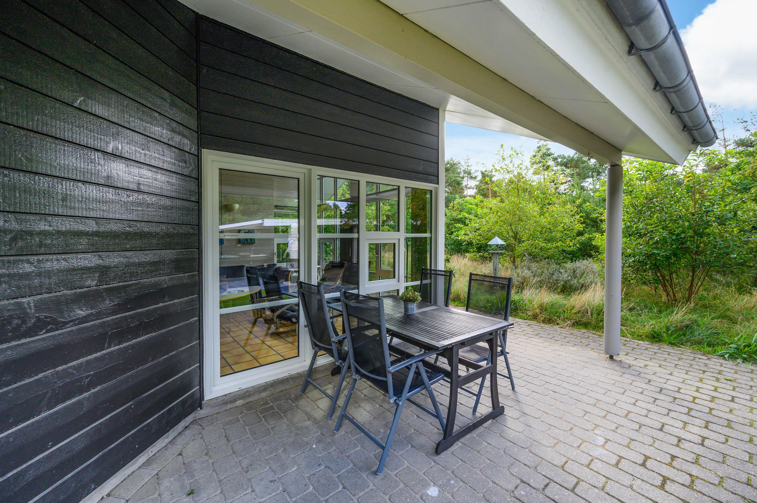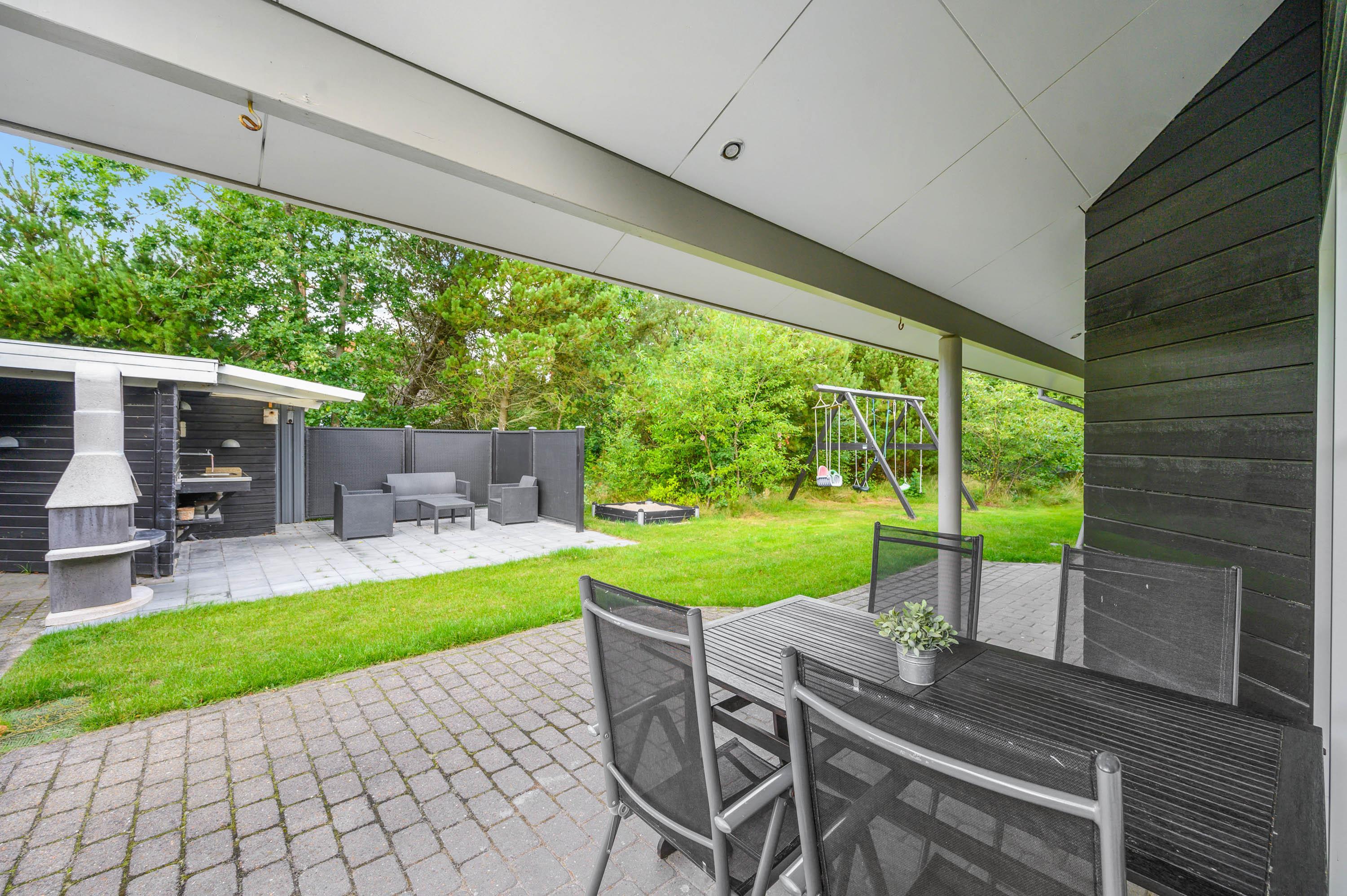 Den store delvist overdækkede terrasse inviterer dig til at slappe af når som helst om dagen. Her kan I nyde ferien i husets havemøbler og liggestole og nyde solen, mens børnene gynger eller leger i sandkassen. Efter en dejlig tur på stranden kan I skylle jer under en udendørs bruser.