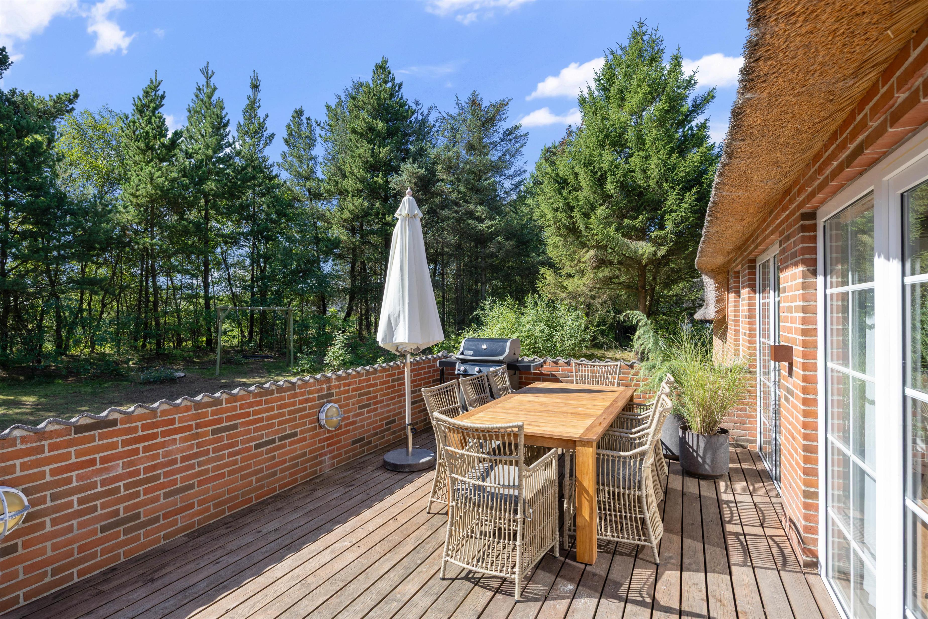 Fra sommerhuset kan I træde ud på en afskærmet terrasse, hvor I kan nyde de solrige dage af jeres ferie. Her har I både havemøbler, liggestole og en grill til rådighed, så I kan få mest muligt ud af de solrige dage på den åbne terrasse.