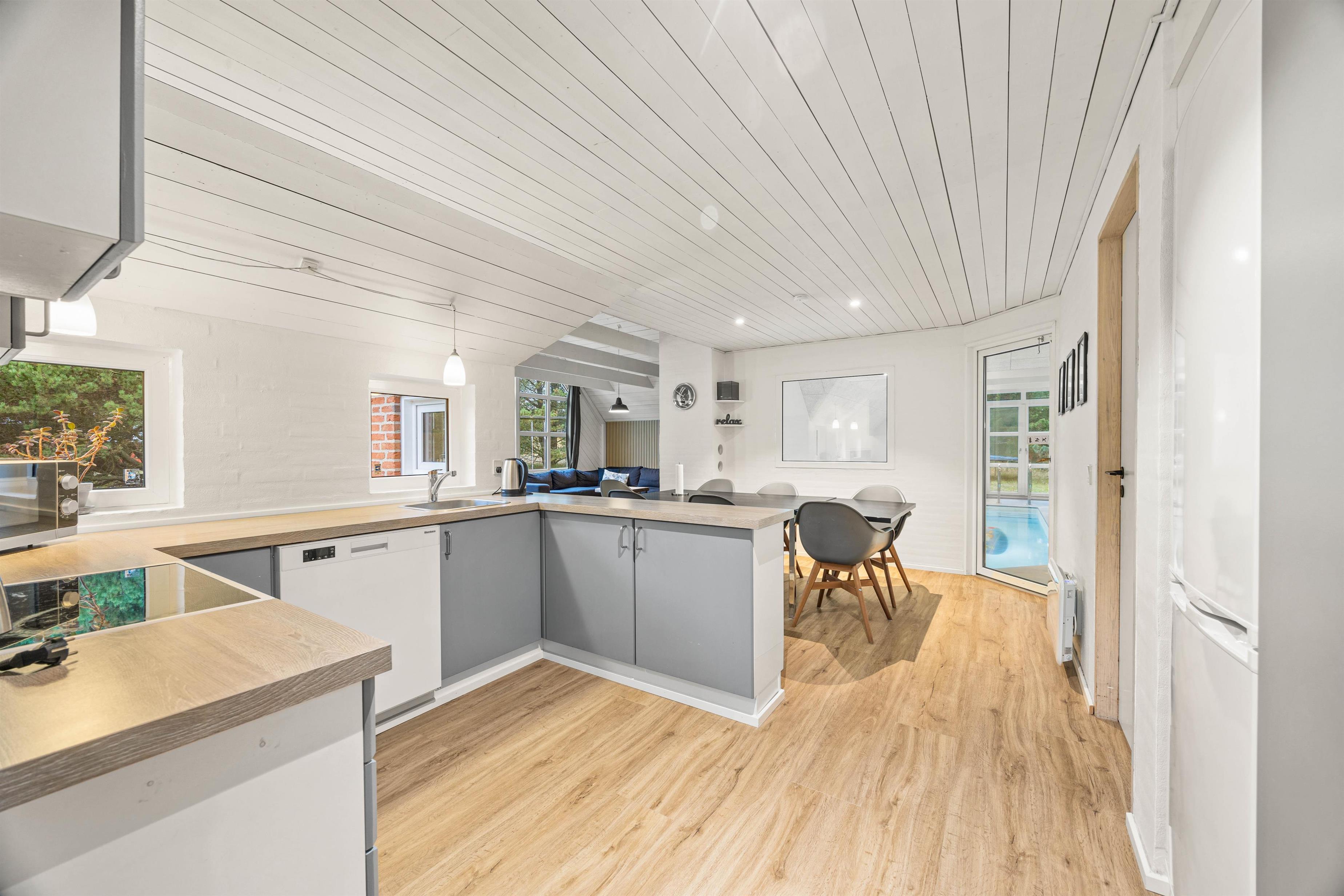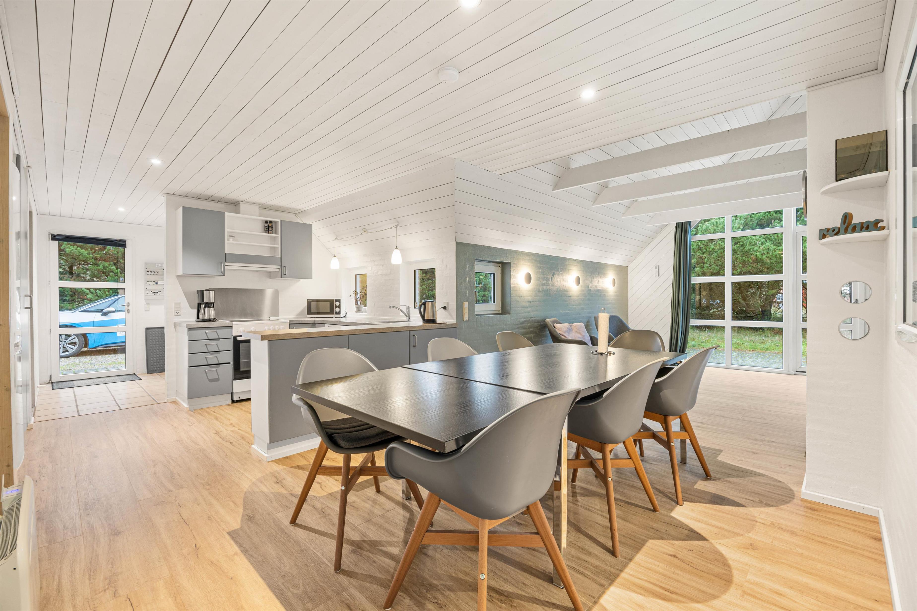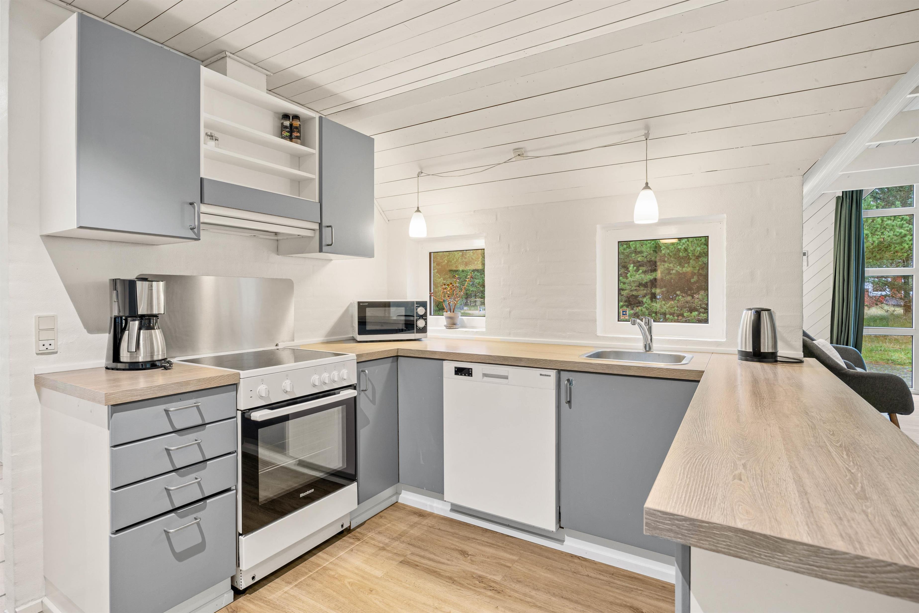 Sommerhuset byder på en åben planløsning, hvor køkkenet har frit udsyn til spisebordet. Denne indretning gør det nemt for jer at holde samtalen i gang og deltage i børnenes aktiviteter, mens I forbereder lækre måltider. En opvaskemaskine sørger for, at I hurtigt og nemt kan komme ud på dagens eventyr.