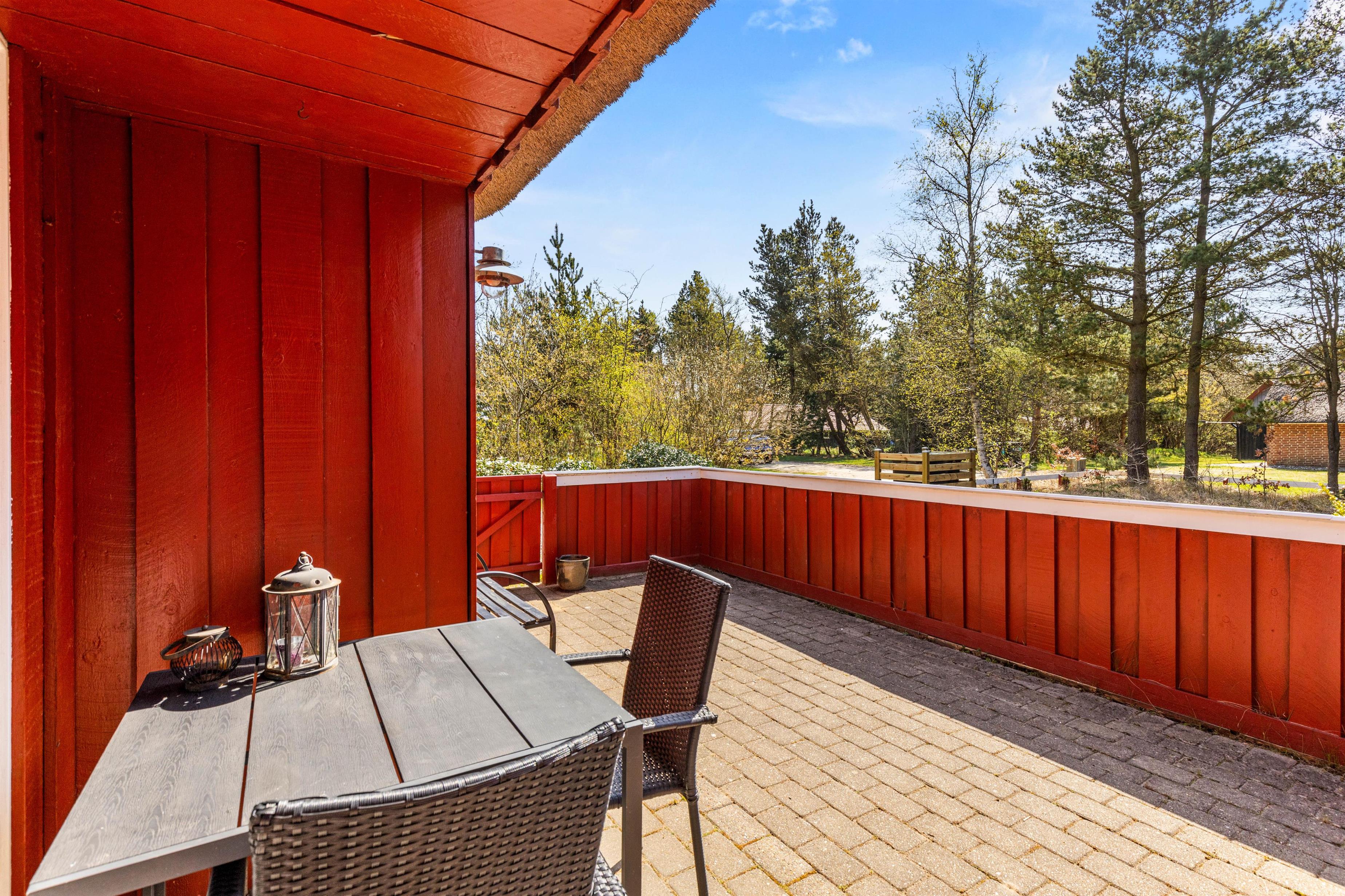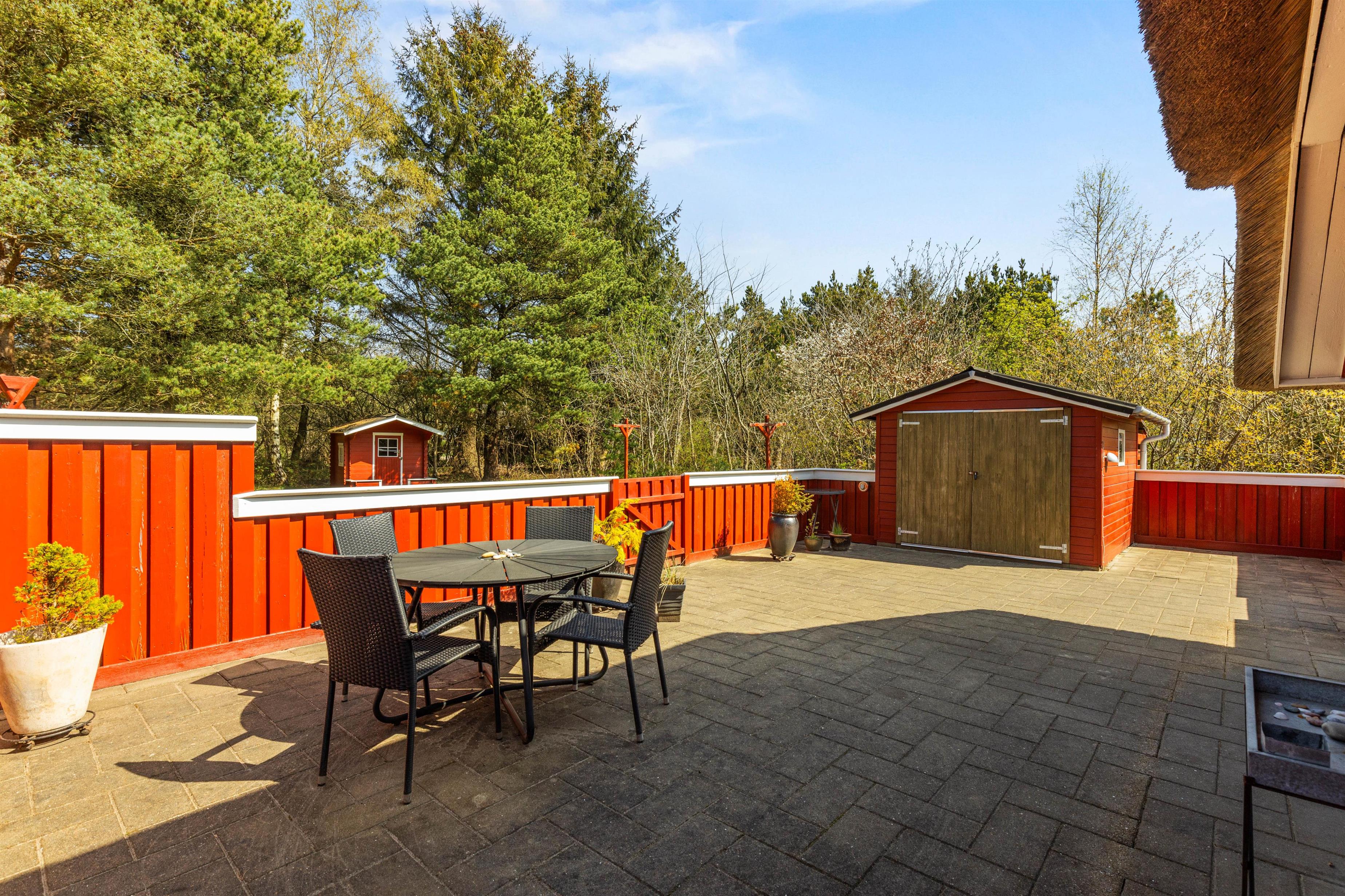 Den store terrasse er afskærmet fra flere sider, og her er der altid god læ til at sidde udenfor og nyde naturen. På de varme sommerdage kan I rykke udenfor med morgenmaden og spise nybagte rundstykker rundt om havebordet, mens dagens første solstråler varmer jer. Gyngen og sandkassen sørger for god underholdning til de mindste feriegæster.