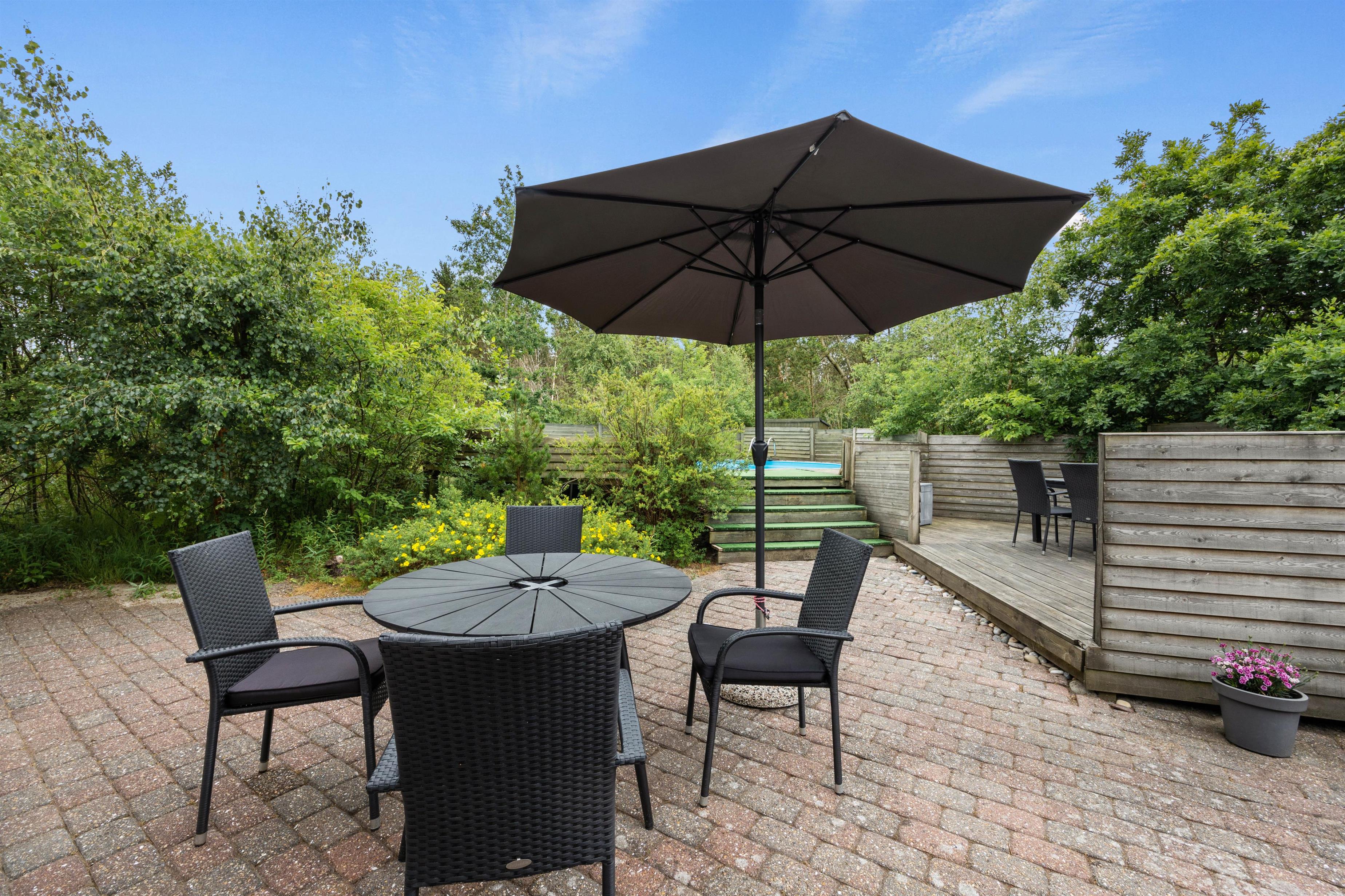 Efter en hyggelig snak rundt om bordet kan I flytte ud på terrassen og nyde det gode solskinsvejr. De mange træer, der omkranser huset, sørger for masser af privatliv, mens I soler jer på terrassen.