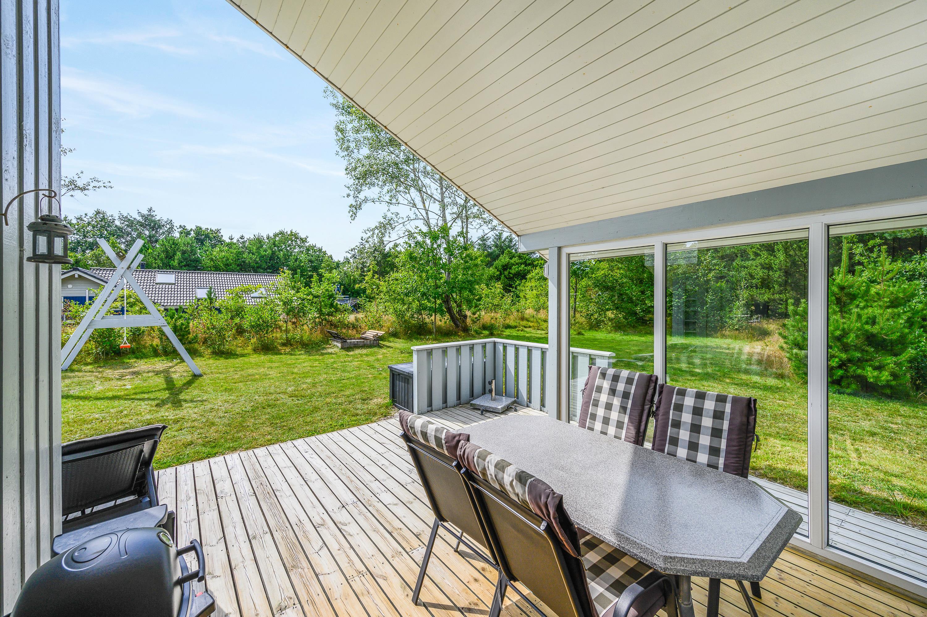 I Houstrups rolige omgivelser blandt skovens høje træer står dette skønne, lysegrå træsommerhus og venter på jer. Lad jer falde godt til fra start af i de lyse og venlige omgivelser, og nyd de solrige dage på en af husets tre dejlige terrasser.