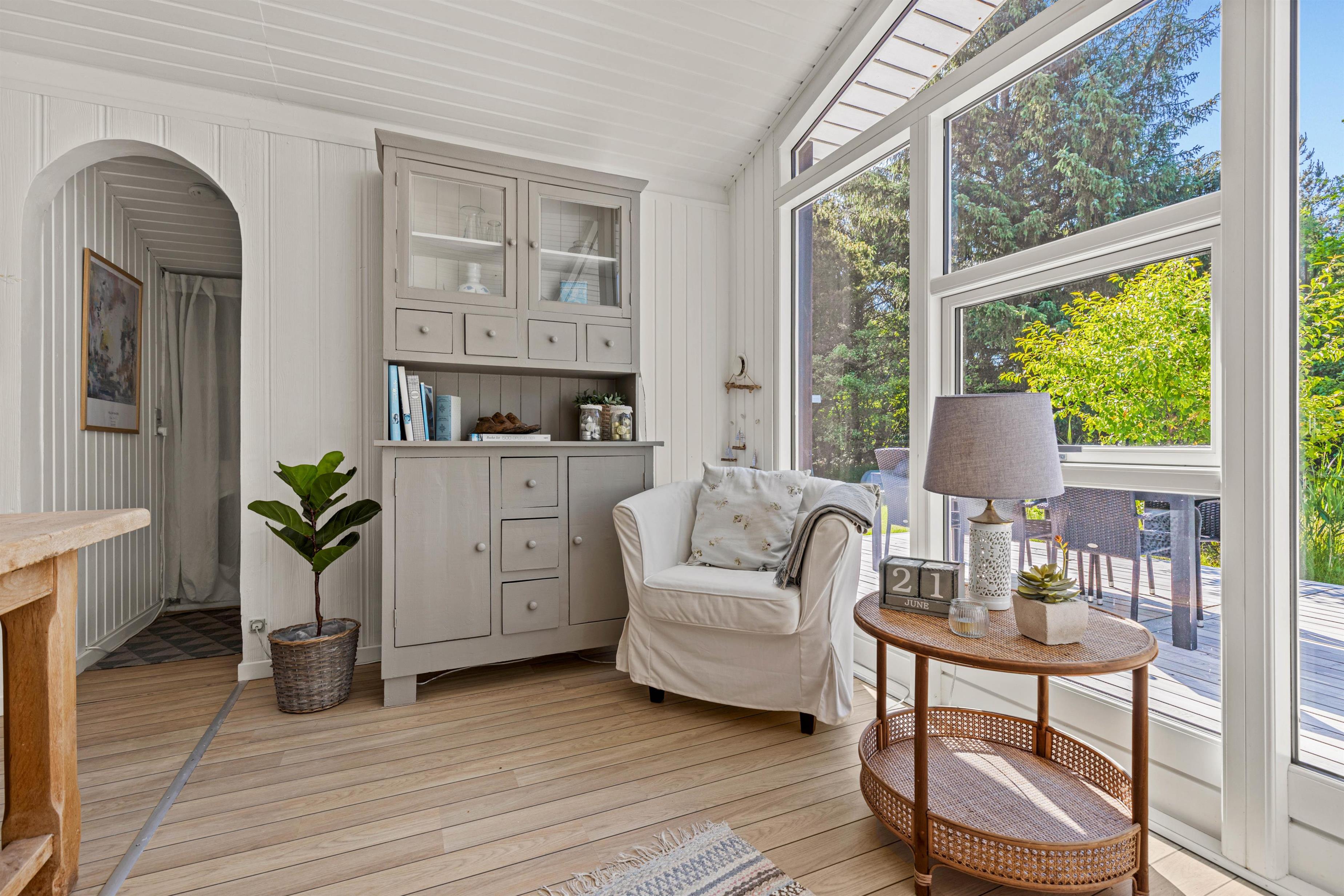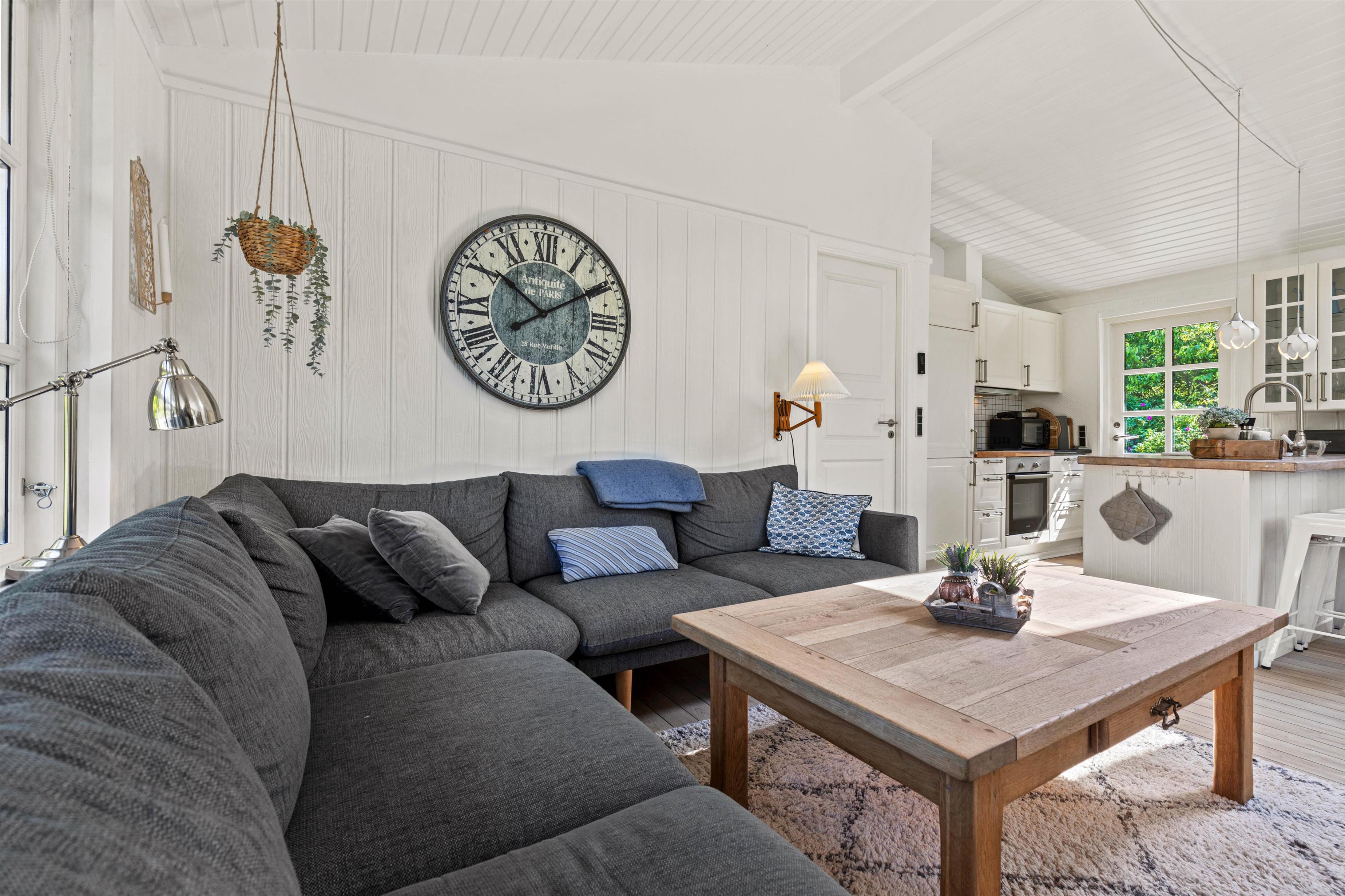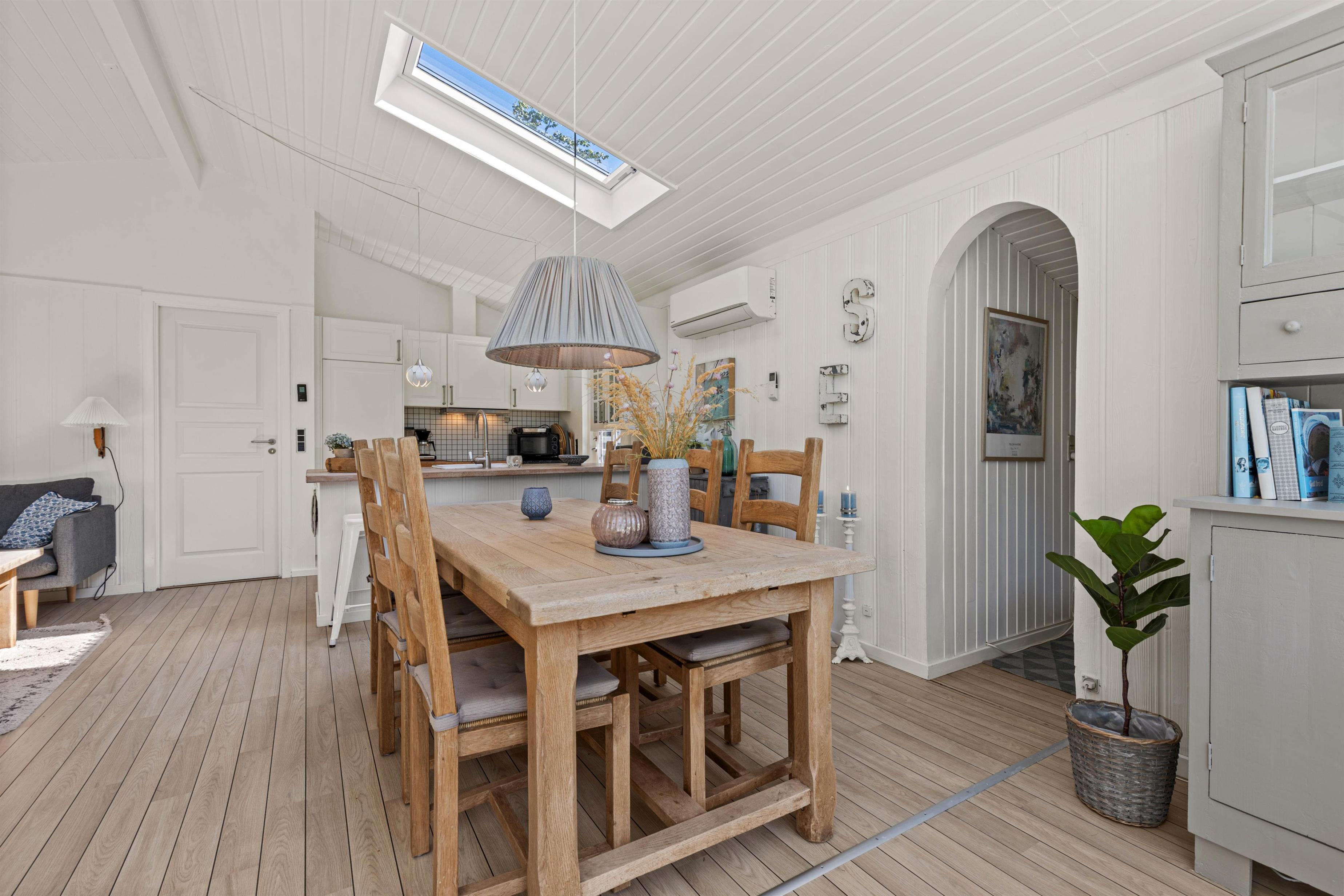 Det karakteristiske træsommerhus er både lyst og moderne indrettet og råder over alt, hvad I får brug for i løbet af ferien. Det veludstyrede køkken, de store vinduespartier, som fylder huset med lys, og brændeovnen, der spreder varme og hyggelig stemning på de kolde feriedage.