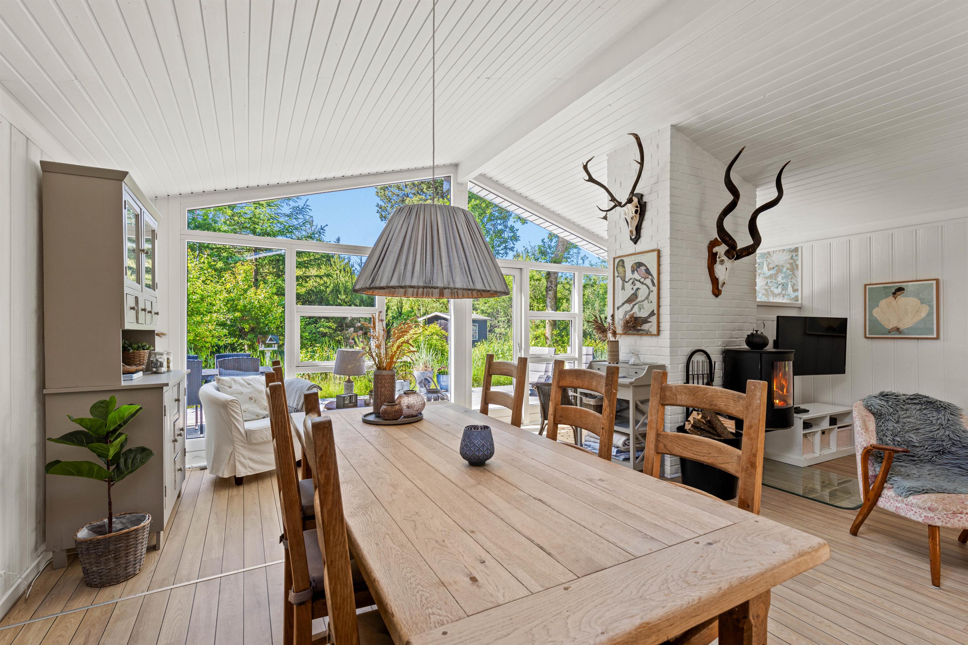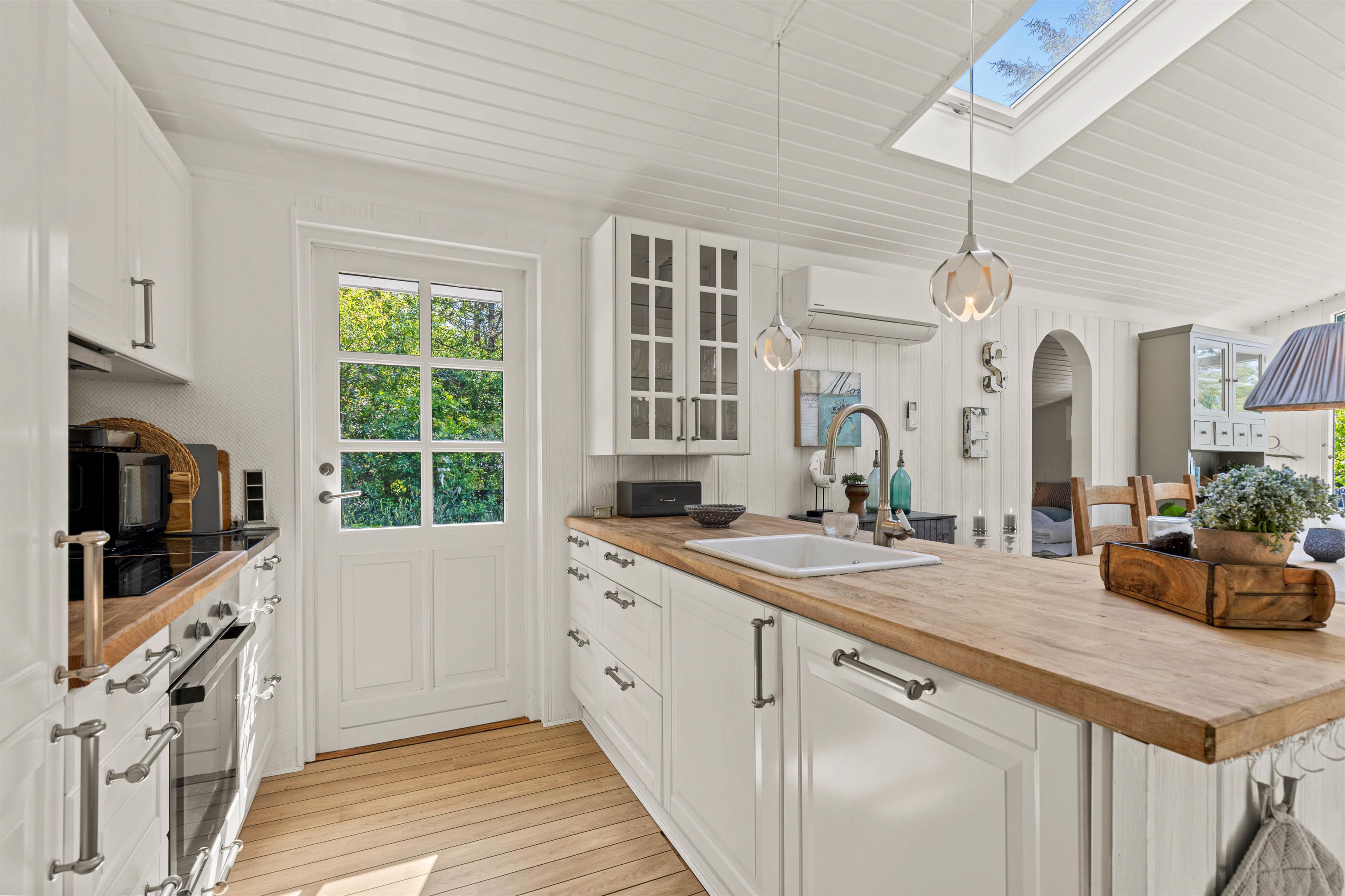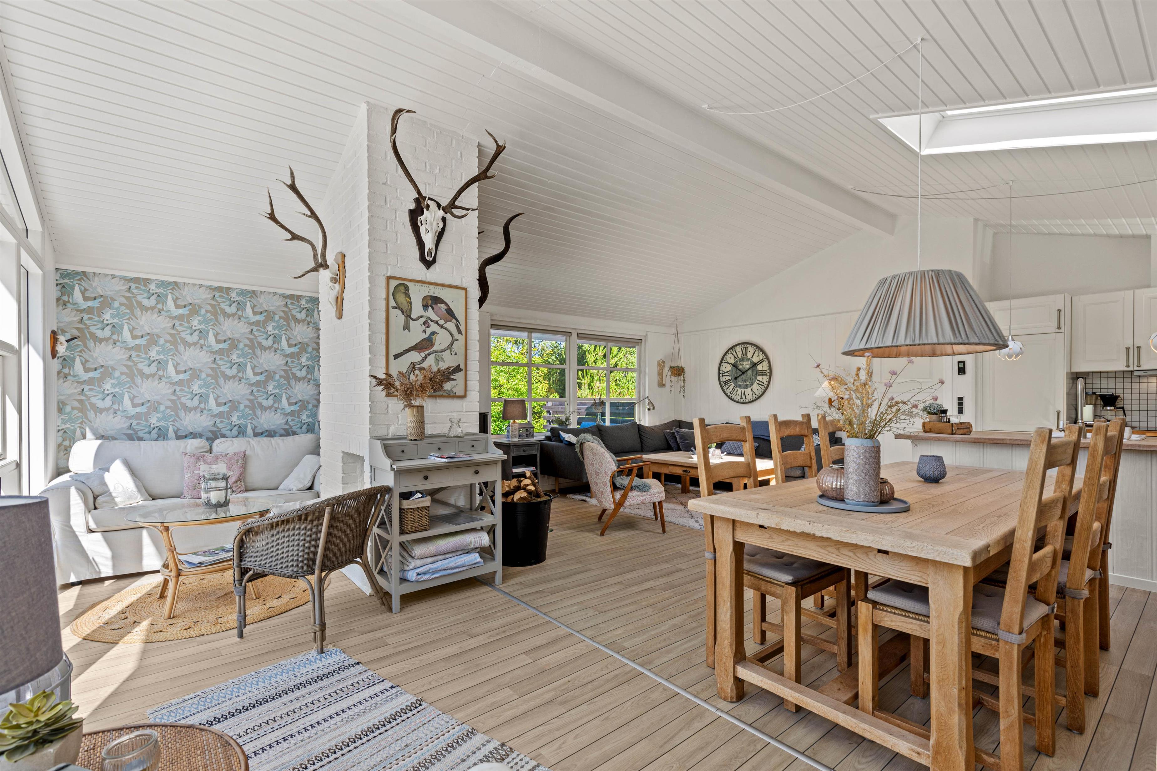 Det karakteristiske træsommerhus er både lyst og moderne indrettet og råder over alt, hvad I får brug for i løbet af ferien. Det veludstyrede køkken, de store vinduespartier, som fylder huset med lys, og brændeovnen, der spreder varme og hyggelig stemning på de kolde feriedage.