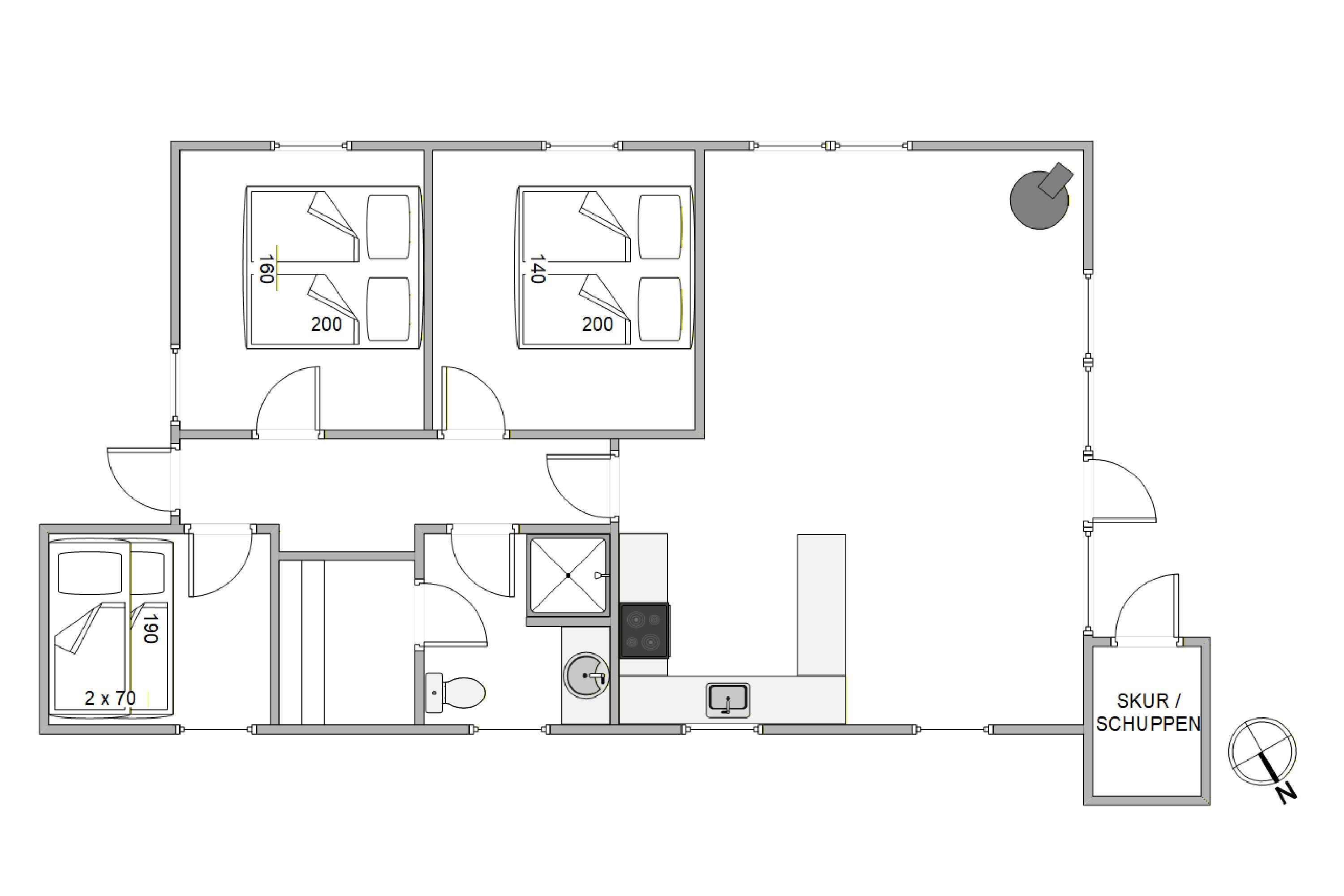 Når mørket falder på, og I har nydt flammerne fra brændeovnen, kan I krybe ind i sommerhuset i alt 3 soverum med i alt 6 sovepladser, med henholdsvis dobbeltsenge og køjesenge, så der er plads til hele familien eller vennegruppen.