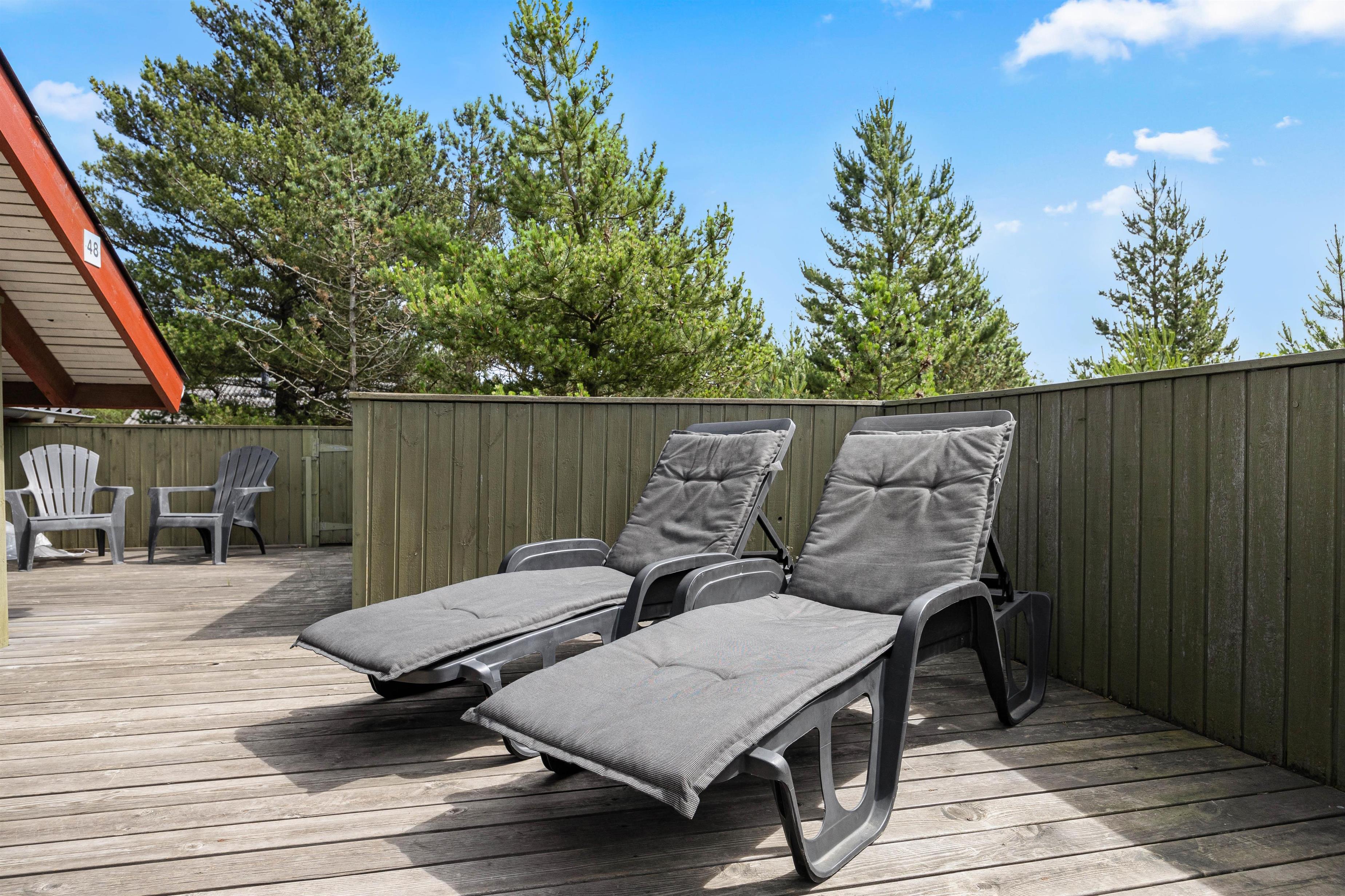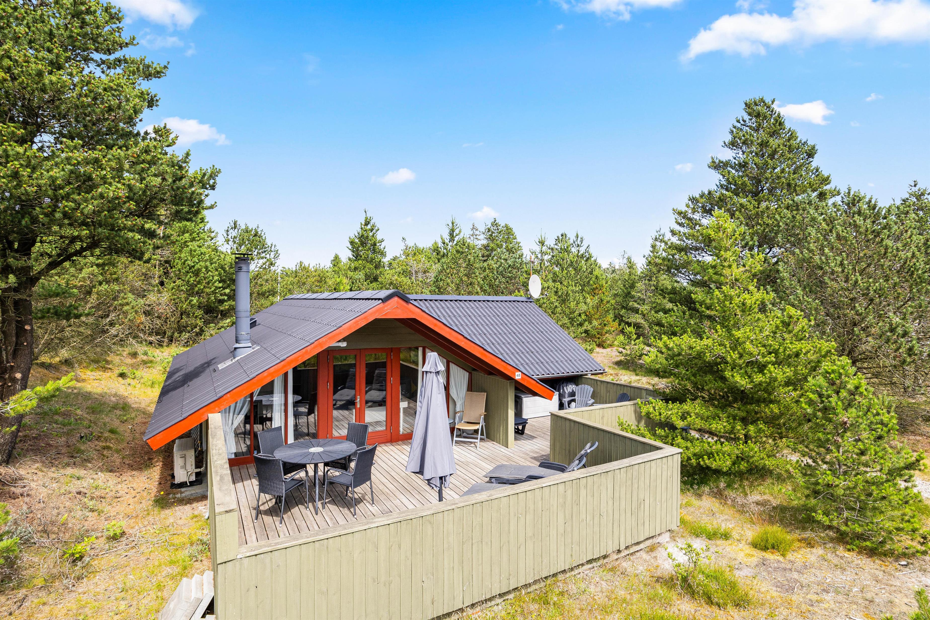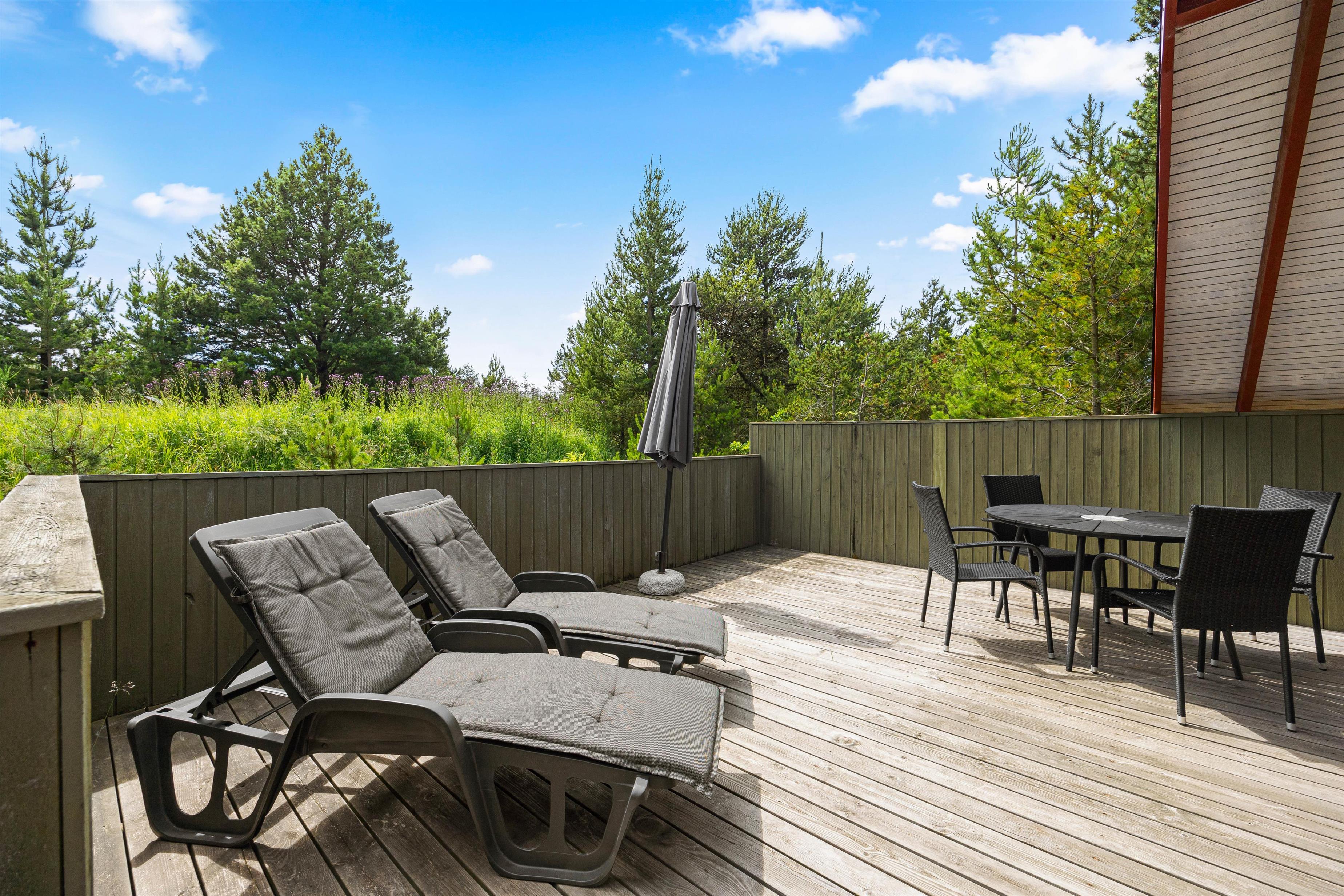 Sommerhuset byder med sin store, lukkede terrasse på mange forskellige muligheder. Her kan I opholde jer dagen lang og nyde solen i liggestolene. Om aftenen kan der grilles, og den overdækkede del af terrassen gør det muligt at tilberede en ægte feriemiddag i al slags vejr. Skoven, der omgiver huset, er perfekt til børnene, der kan gå på opdagelse mellem træerne.