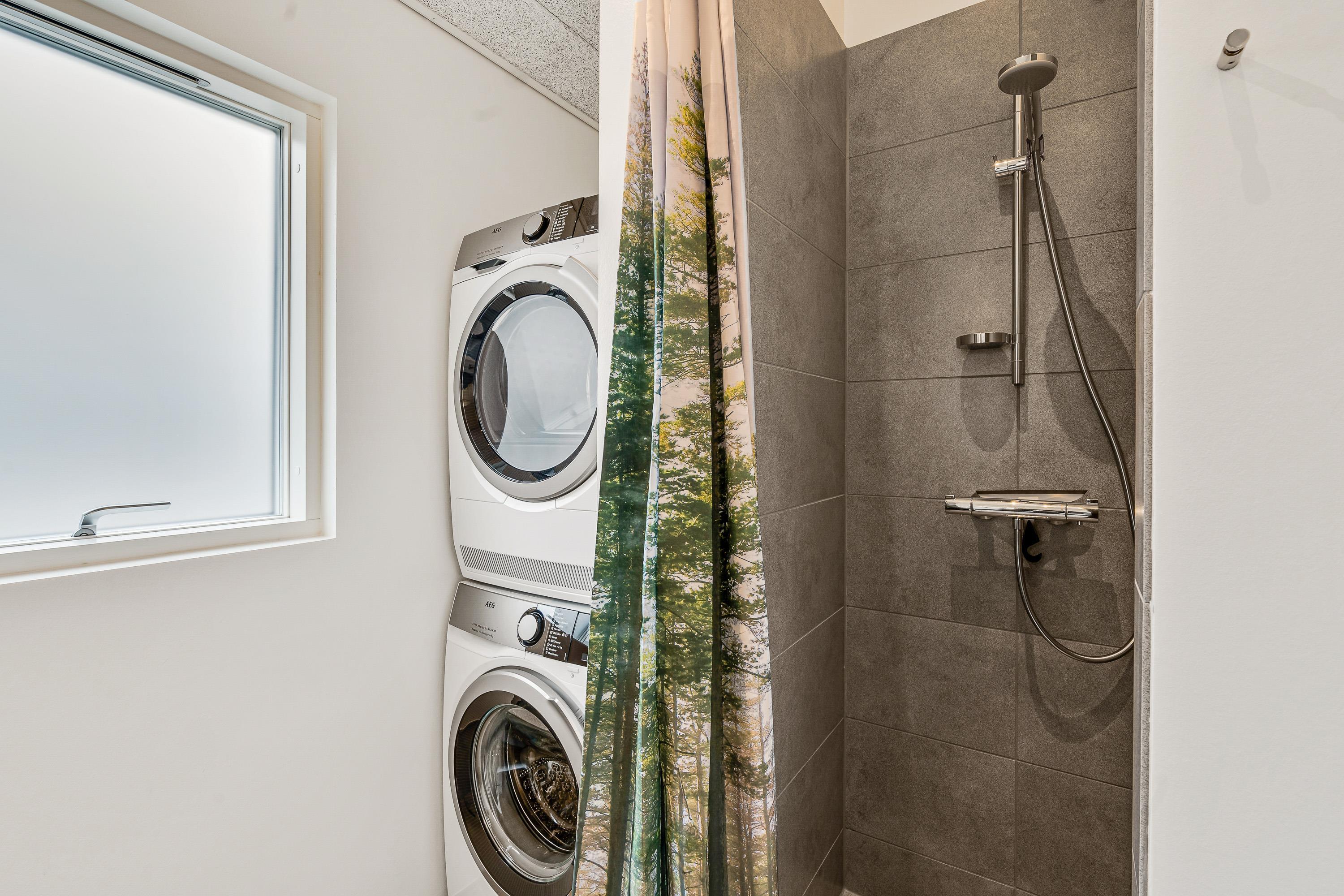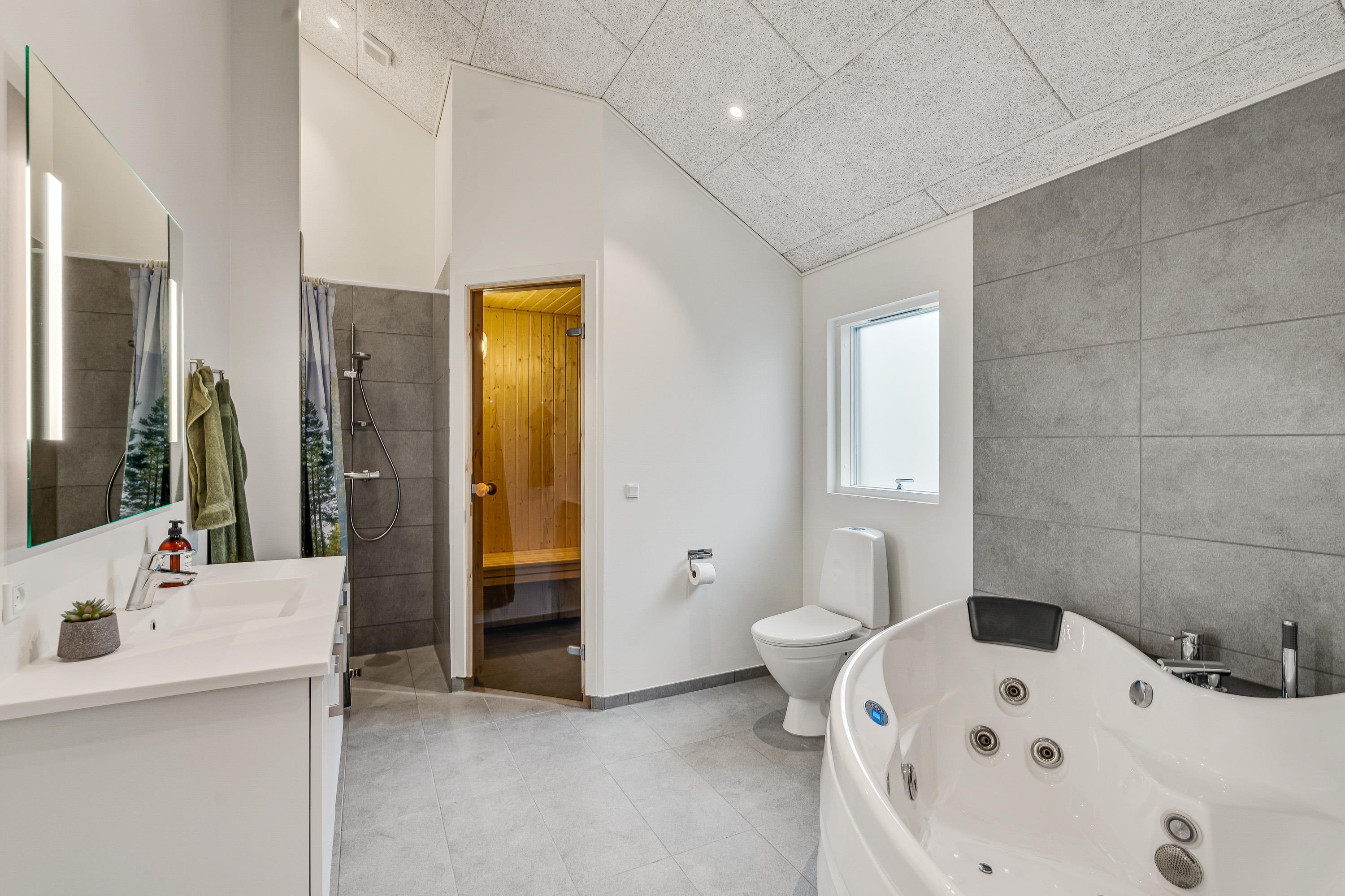 Et andet højdepunkt i sommerhuset finder I på det store af sommerhusets 2 badeværelser. Her kan I få jer en wellness-oplevelse i den skønne spa og den varme sauna, hvor I kan blive forkælet med masser af afslapning og komme helt ned i gear. På begge badeværelser kan I desuden få glæde af gulvvarme.