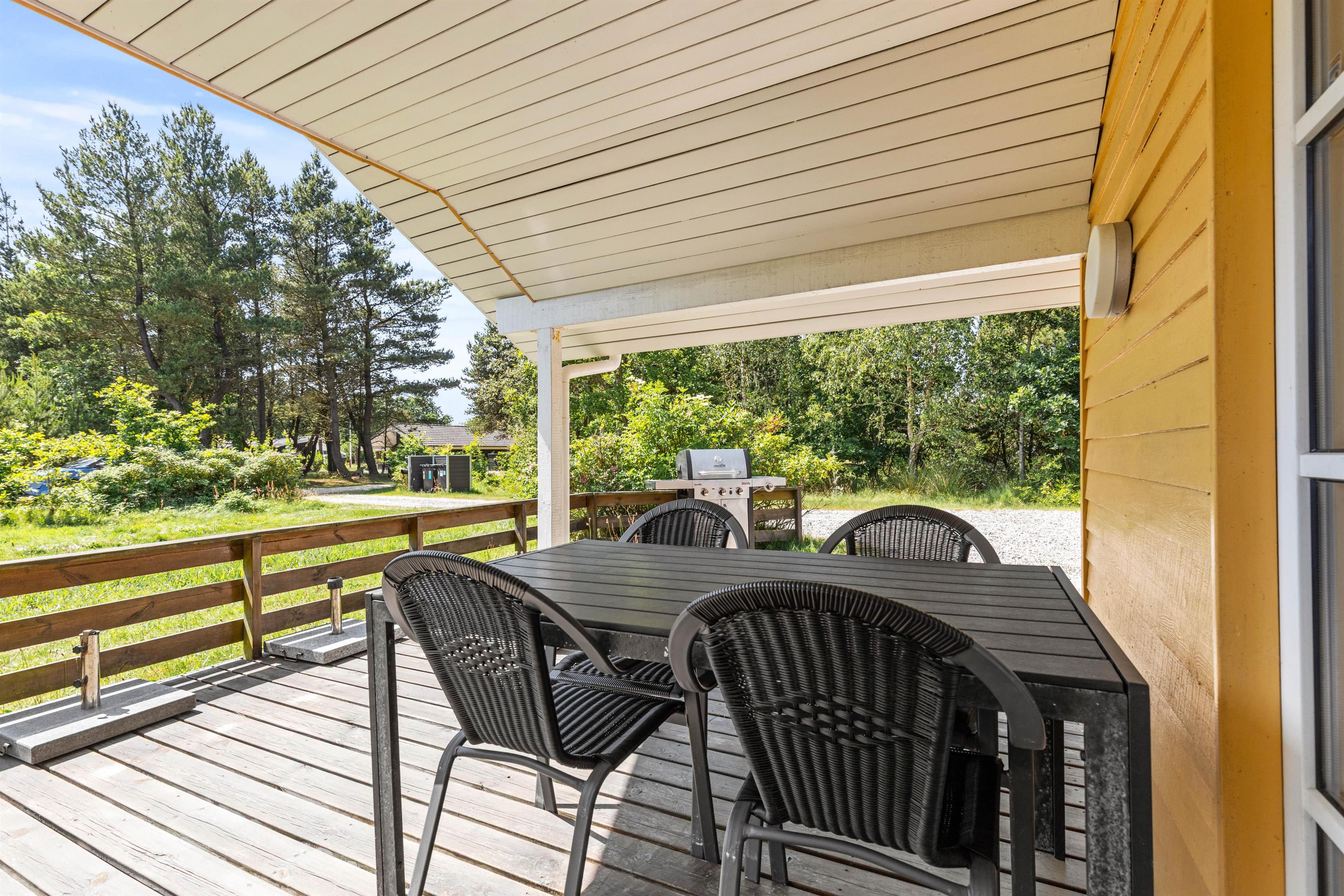 På den store delvist overdækkede terrasse er der godt med plads til at slappe af og værne om jer selv og hinanden. Læn jer tilbage i liggestolene og nyd de fredelige omgivelser med fuglefløjtene i det fjerne.