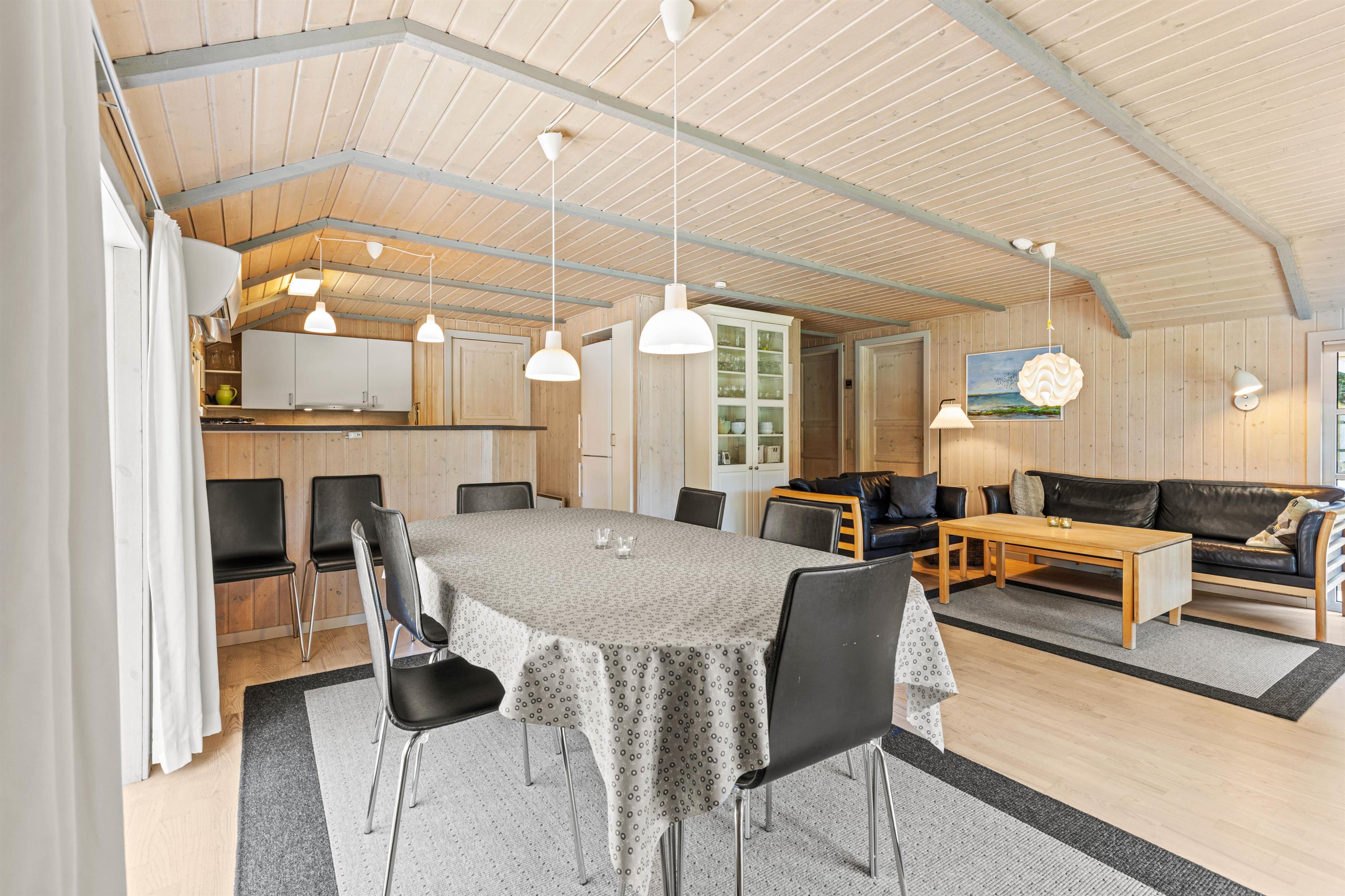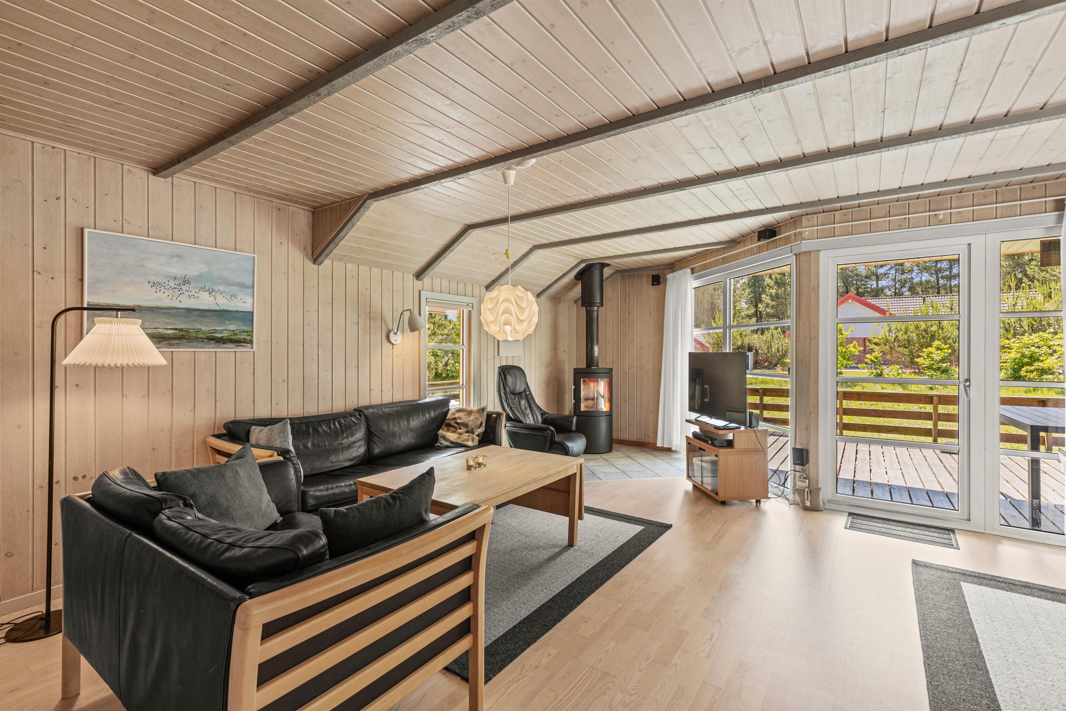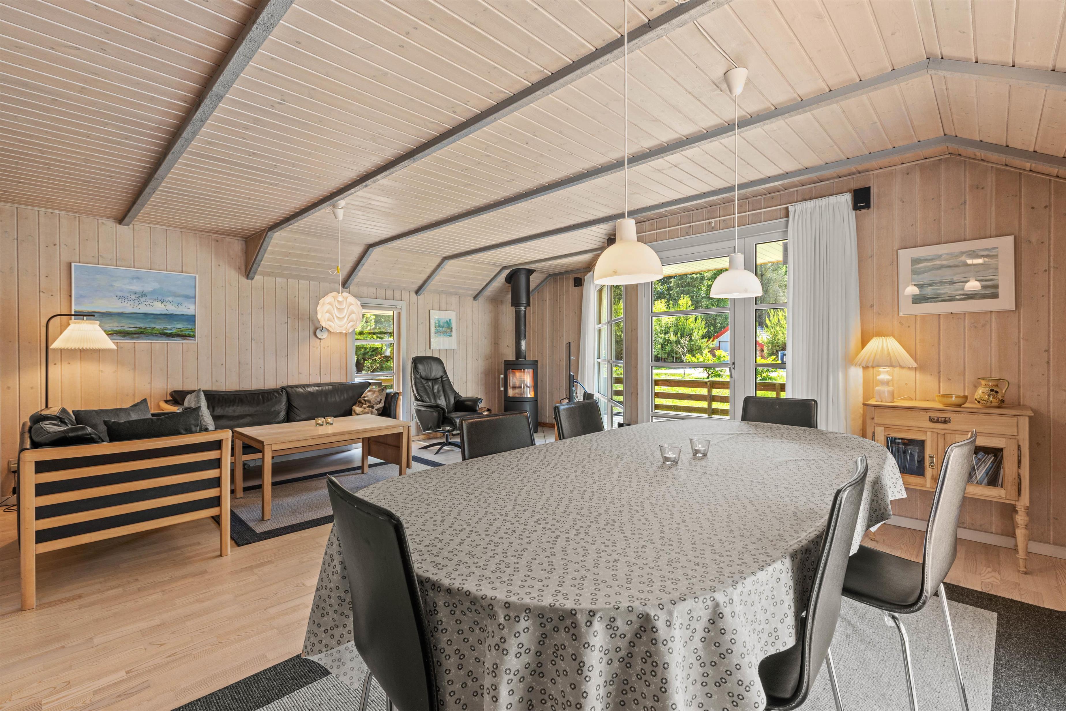 Sommerhuset fik splinternyt køkken i 2021 og den rummelige spisestue indbyder til masser af samvær og hyggelige stunder med den knitrende brændeovn i baggrunden, og de store vinduespartier lader masser af lys slippe ind, samtidig med I har udsyn til haven og de naturskønne omgivelser.