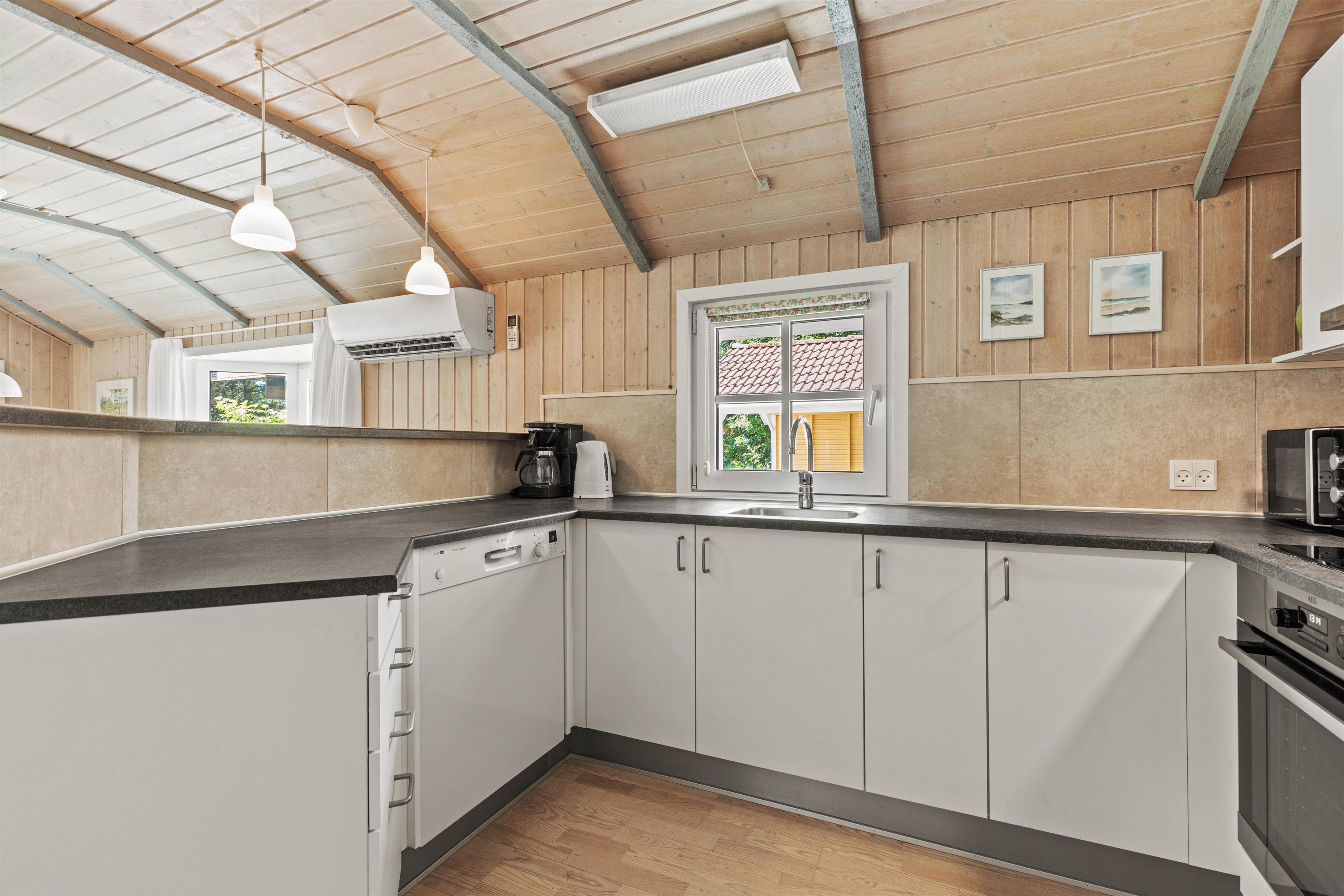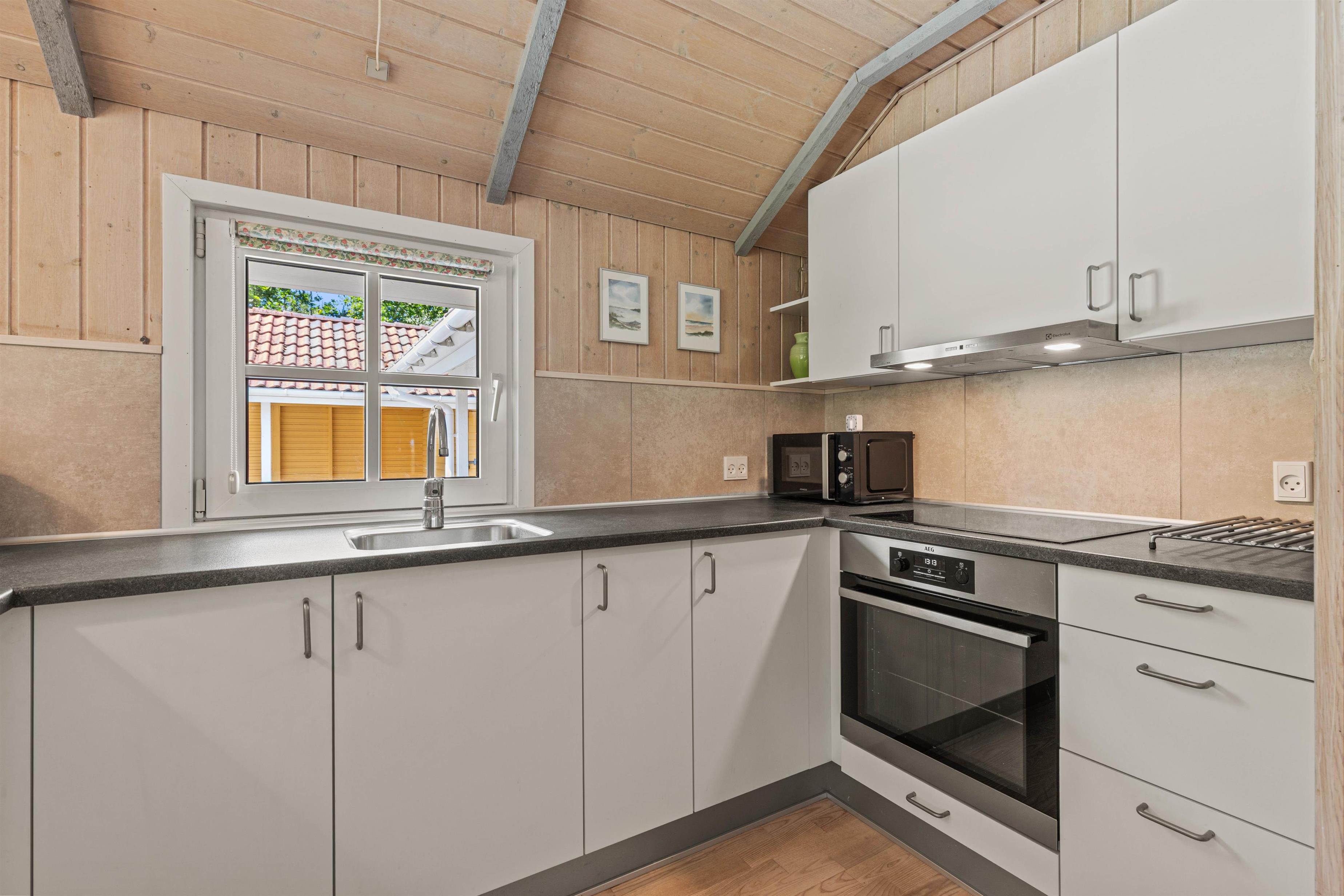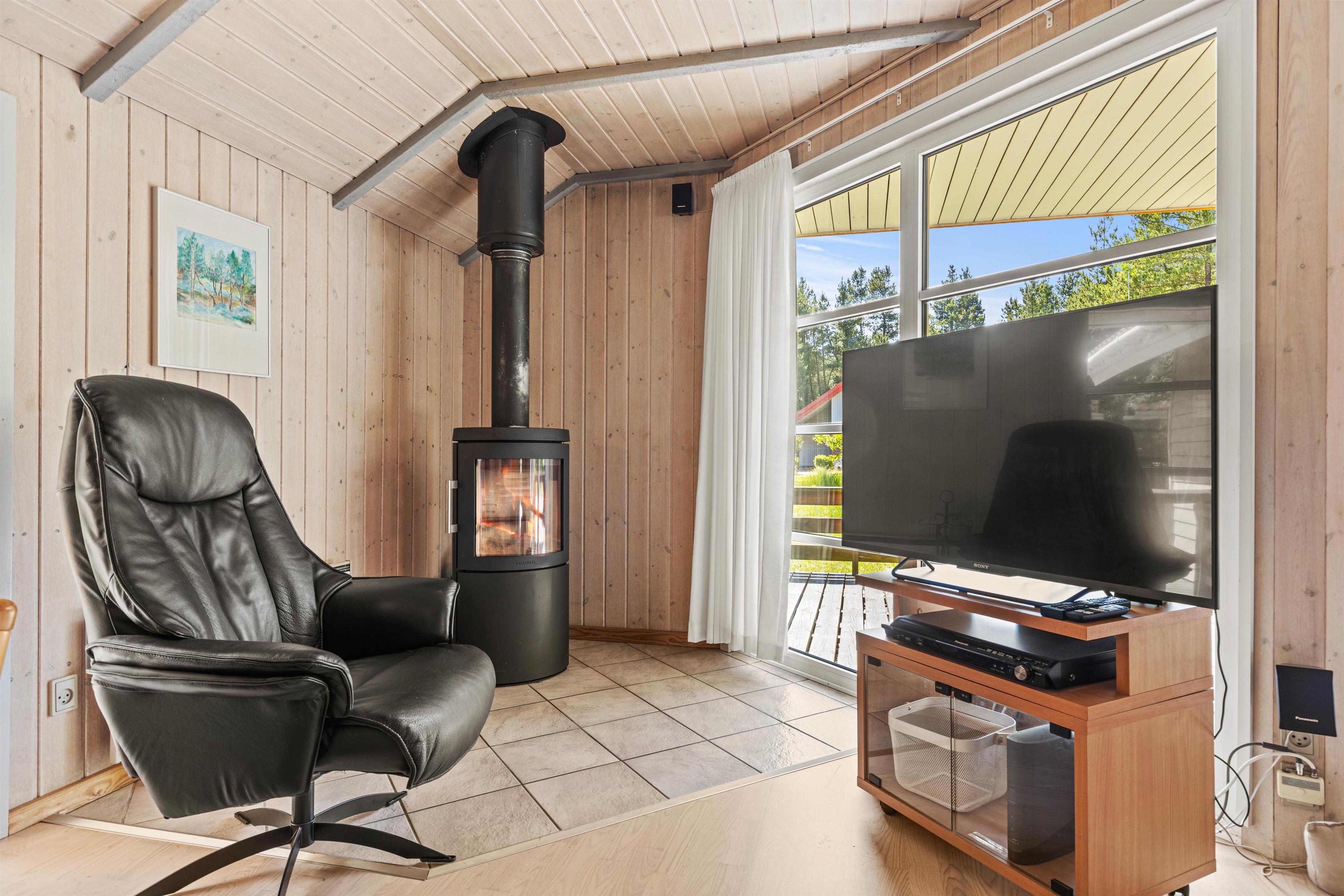 Sommerhuset fik splinternyt køkken i 2021 og den rummelige spisestue indbyder til masser af samvær og hyggelige stunder med den knitrende brændeovn i baggrunden, og de store vinduespartier lader masser af lys slippe ind, samtidig med I har udsyn til haven og de naturskønne omgivelser.