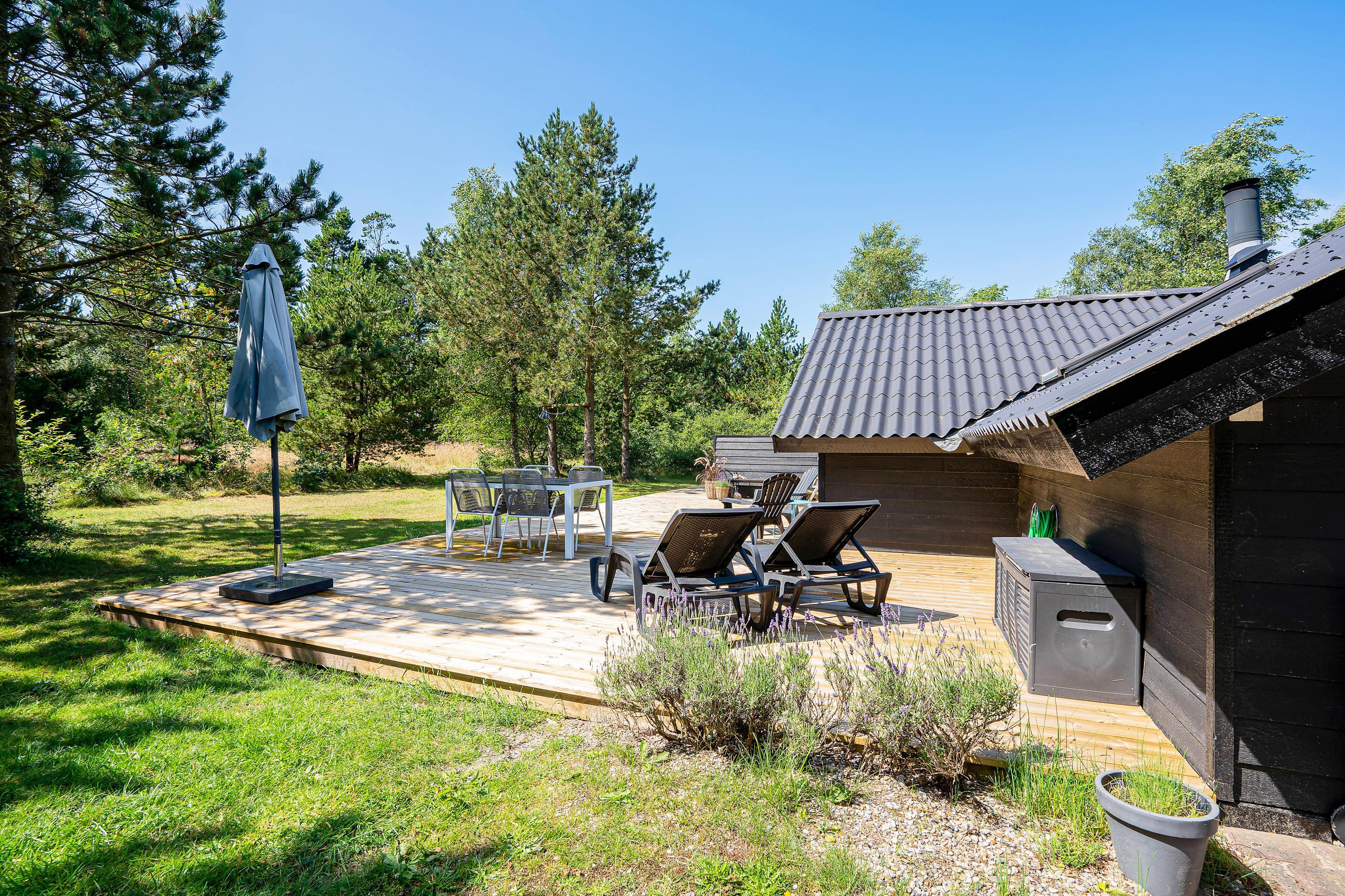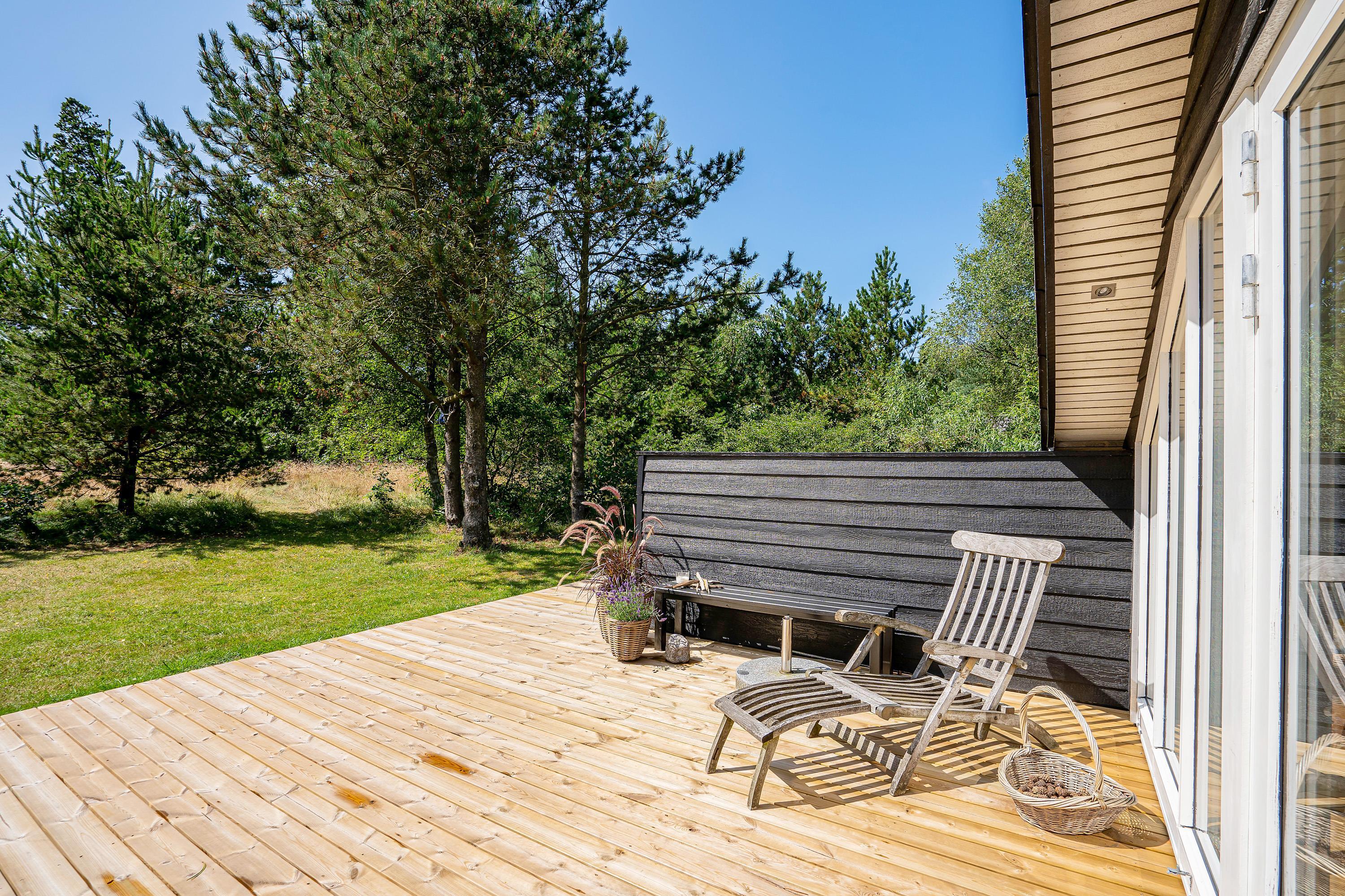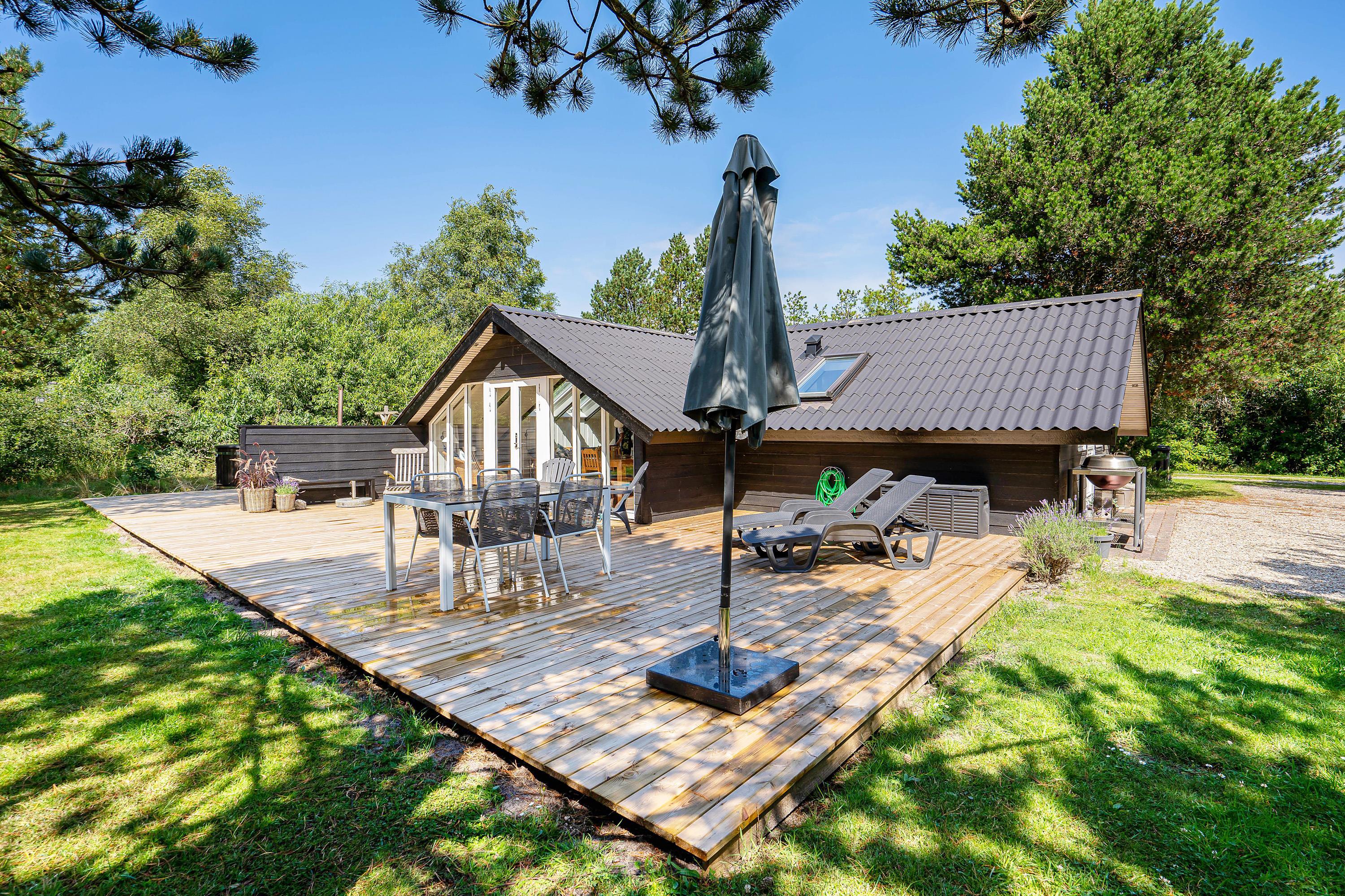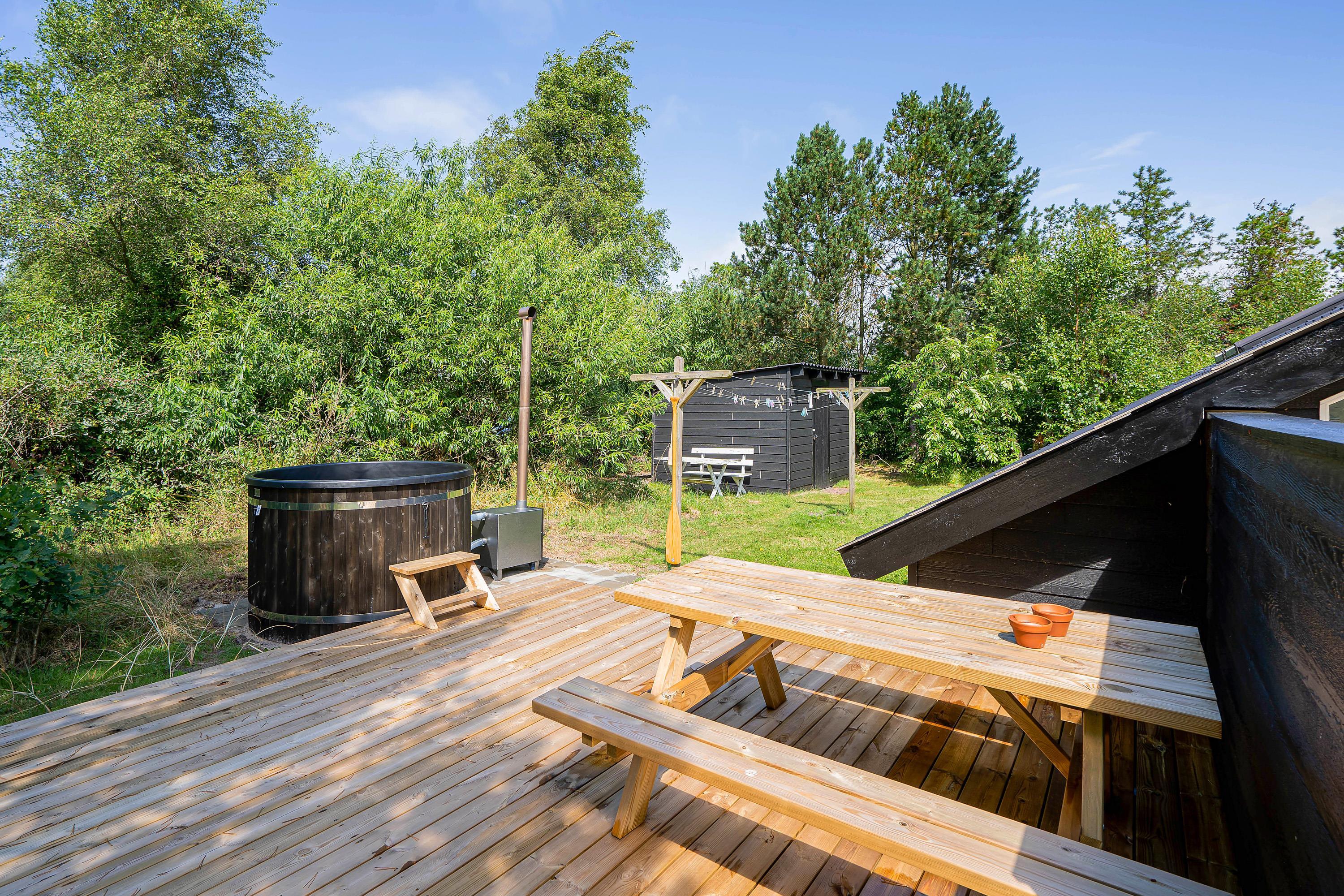 Indvendigt såvel som udvendigt er der lagt vægt på, at I skal føle jer godt tilpas og på den åbne træterrasse er der sørget for både havemøbler og liggestole, så I kan udnytte de varme solskinsdage til fulde. Feriestemningen stiger lige et ekstra stykke, når I tænder op for vildmarksbadet og slapper af her i det varme vand.