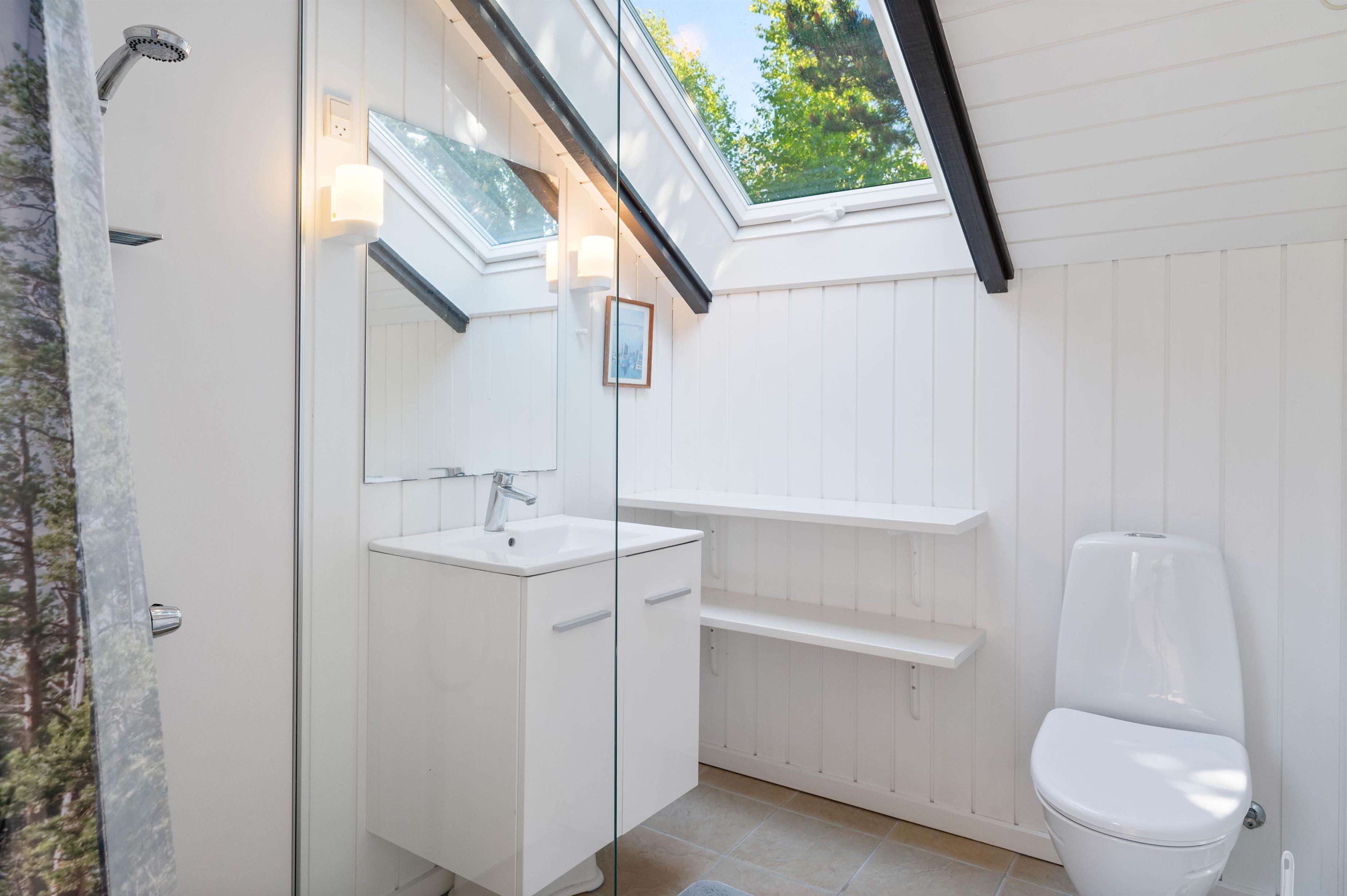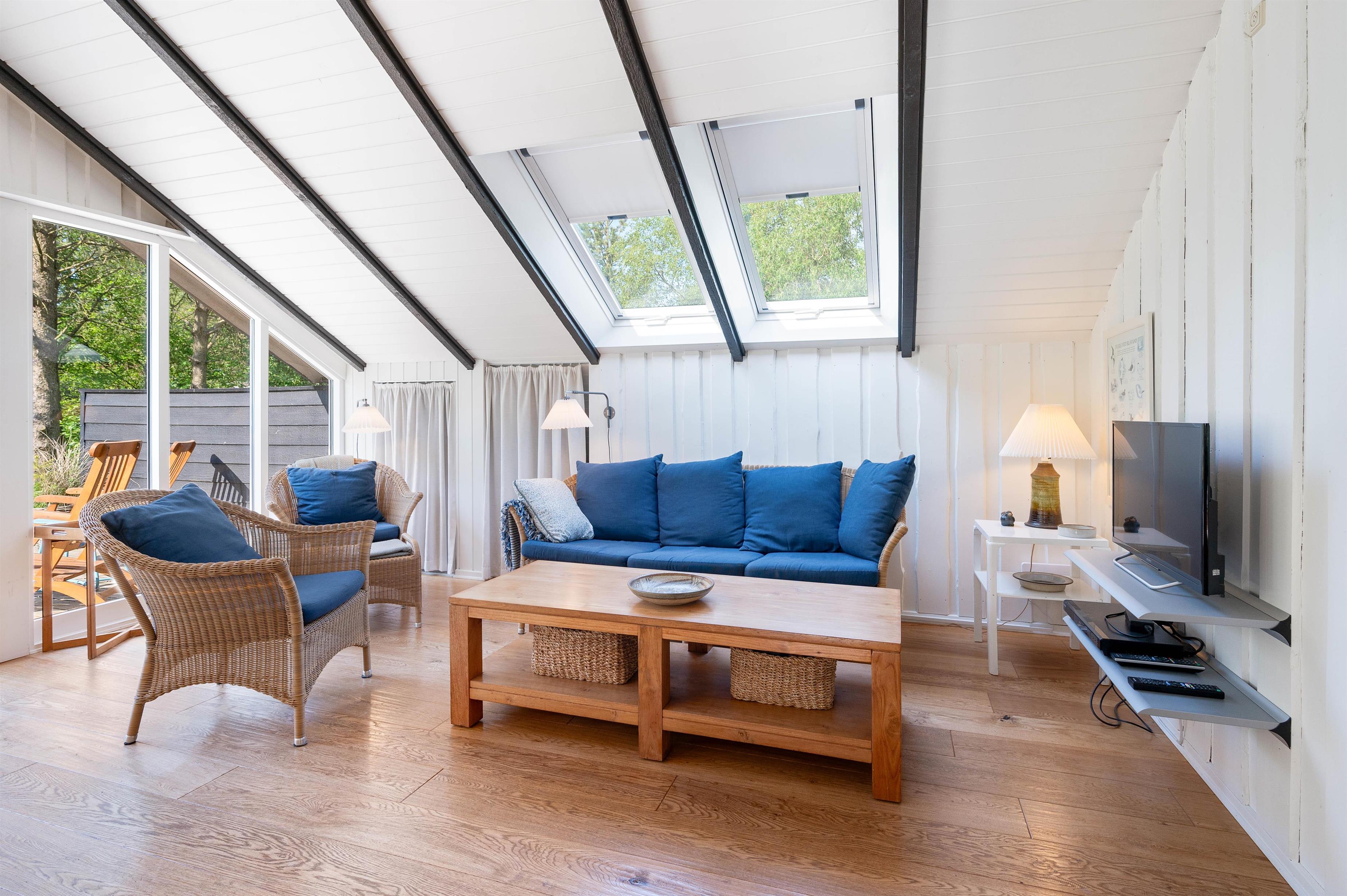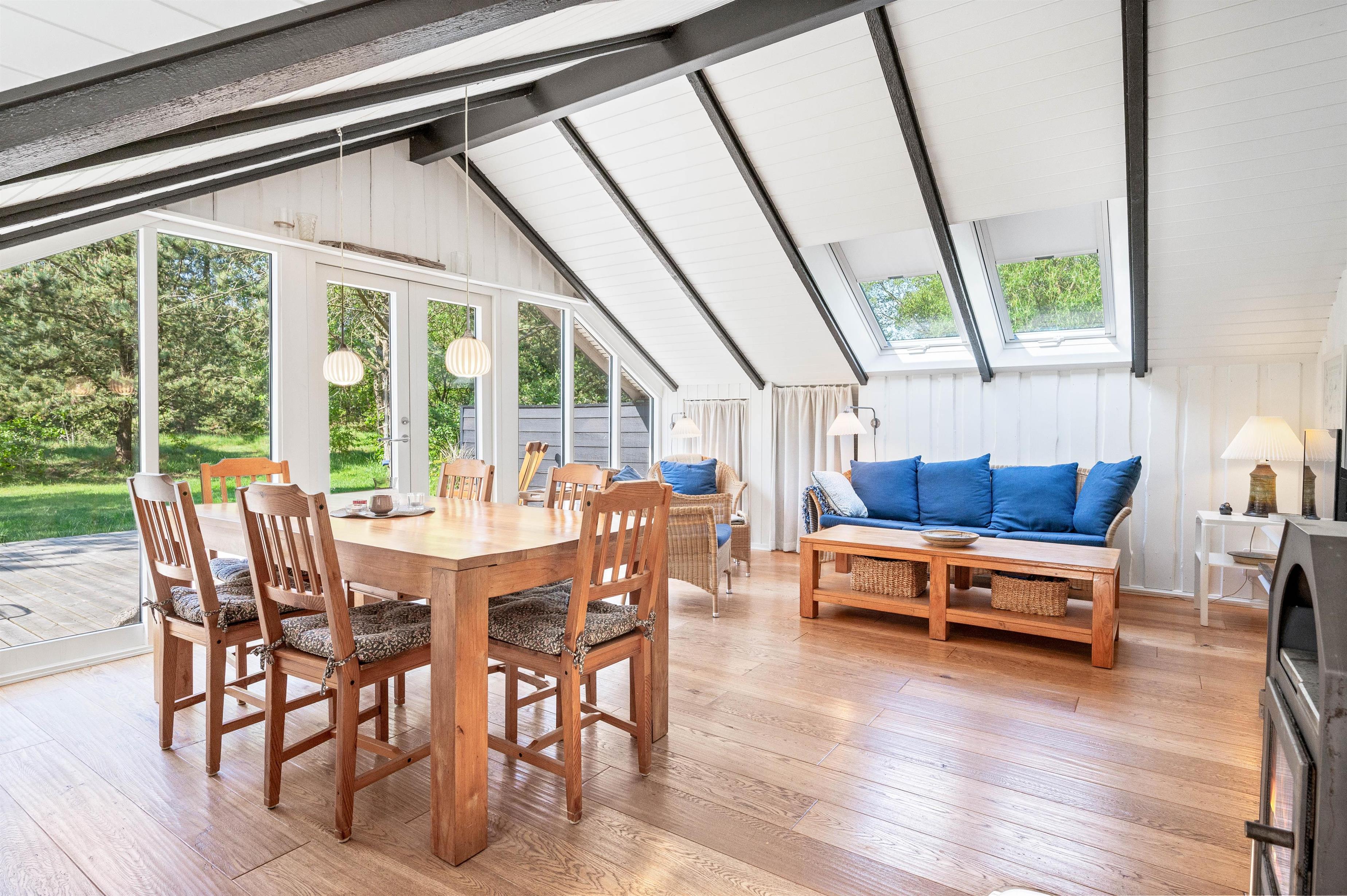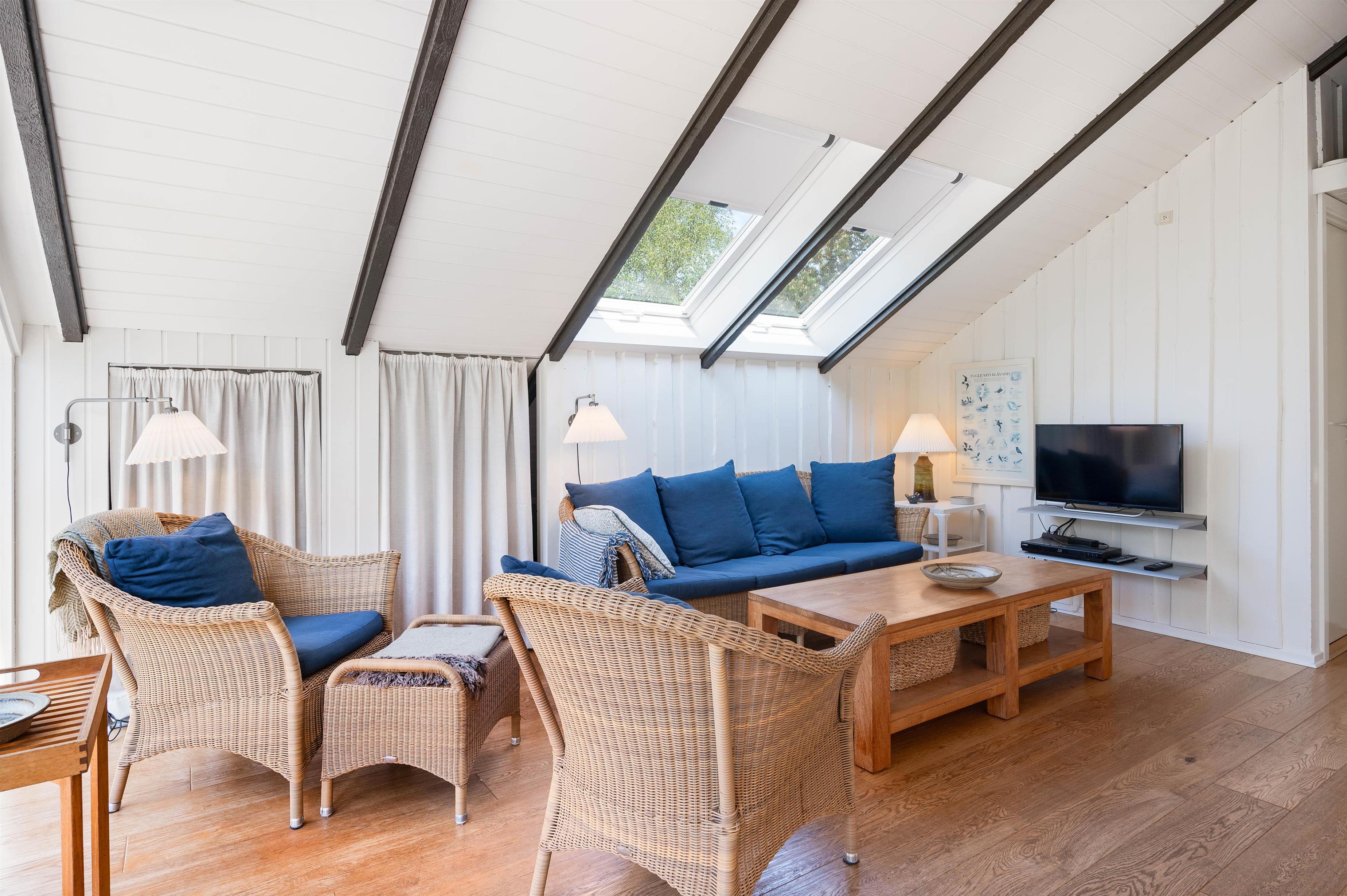 Hvidmalede trævægge og trælofter, store panoramavinduer helt til gulvet og ovenlysvinduer sørger for masser af lys og venlighed, og kombineret med den personlige og kærlige indretning, de sorte loftsbjælker og de mange små detaljer giver det alt i alt et dejligt feriehjem, hvor I fra første øjeblik vil falde godt til.