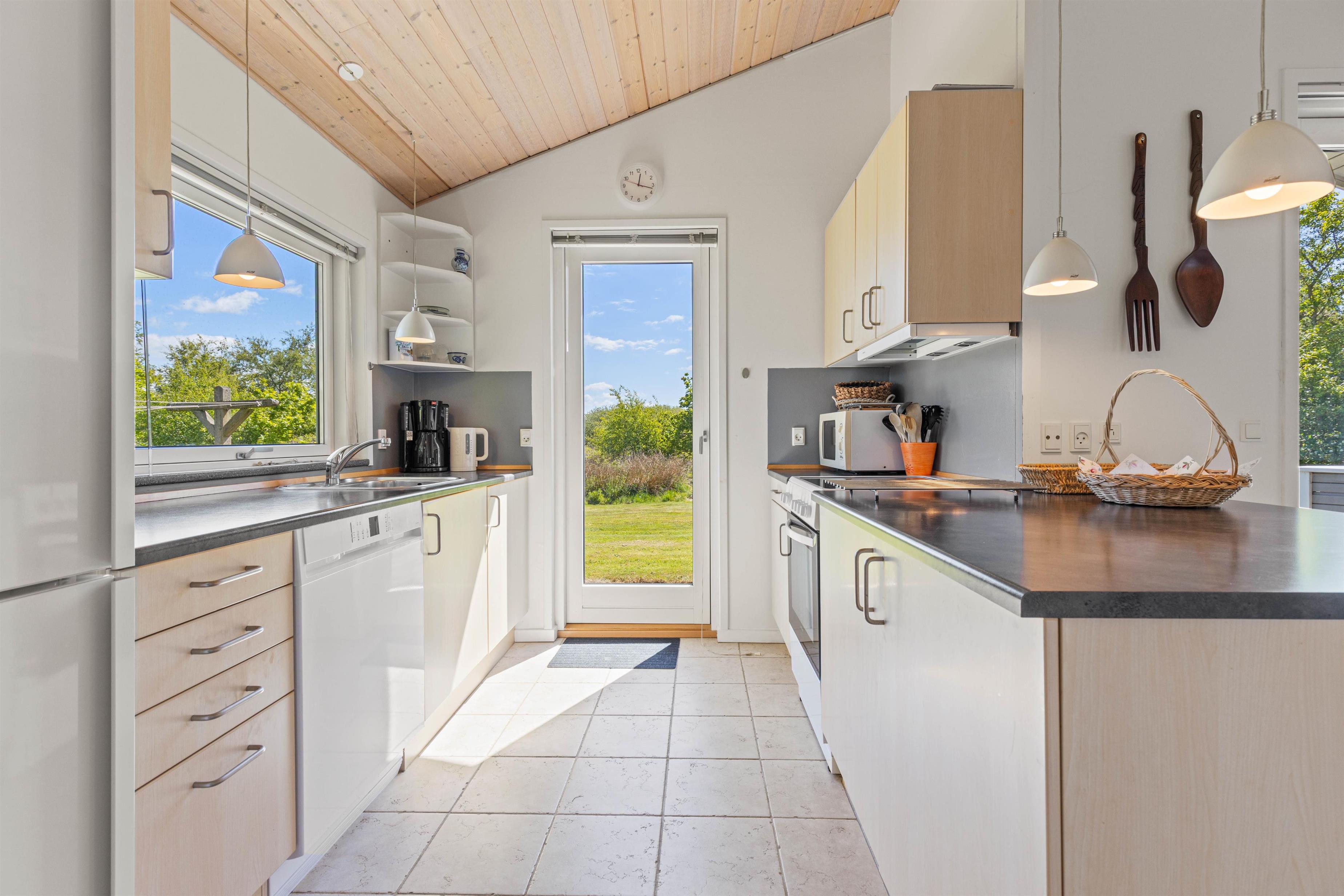 Sovepladserne er fordelt på 3 gode soverum samt en hyggelig hems, som helt sikkert vil blive et hit blandt børnene. I entréen er der vaskesøjle med vaskemaskine og tørretumbler, og køkkenet er udstyret med opvaskemaskine og alt, hvad feriekokken har brug for, når der skal kreeres lækre middage.