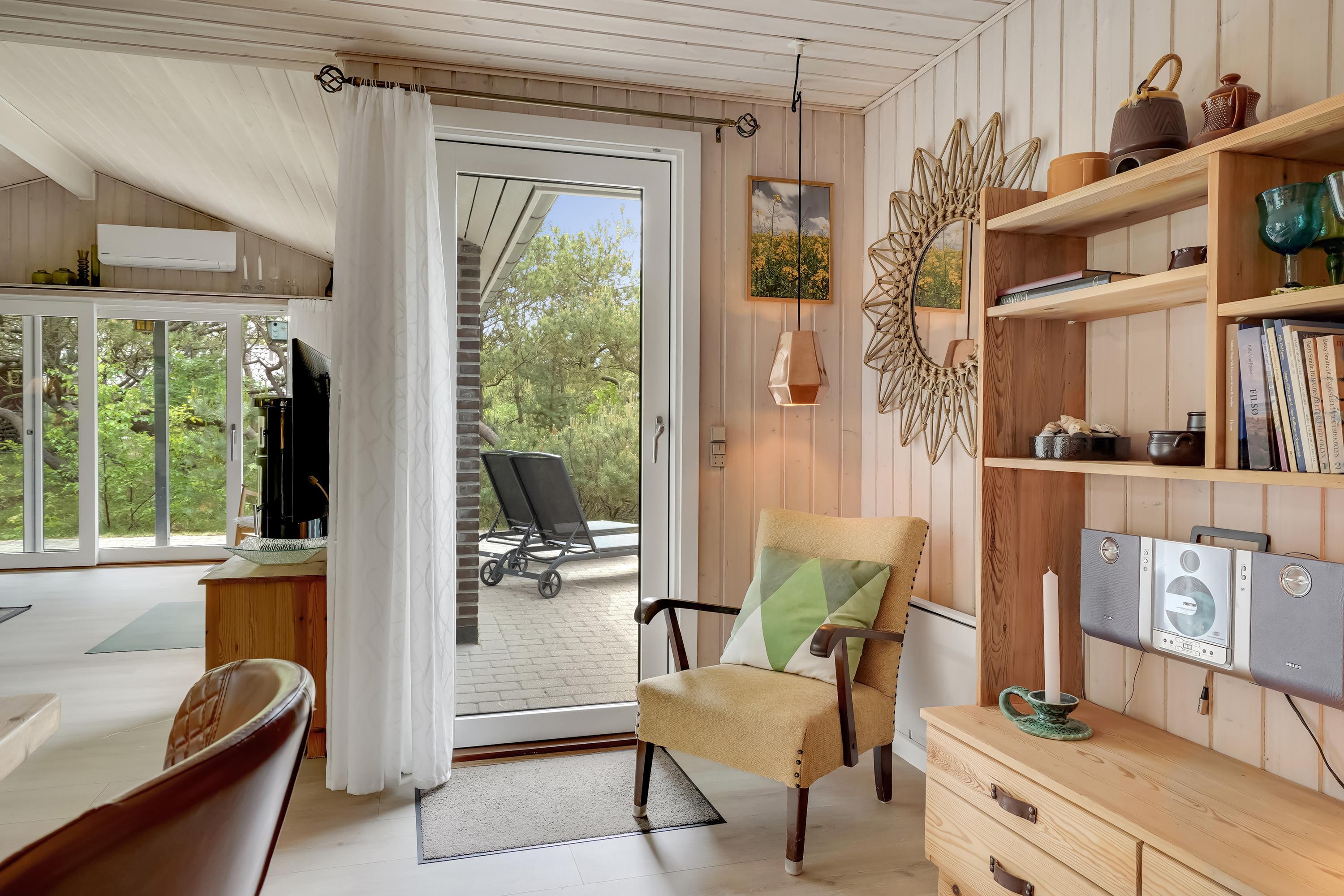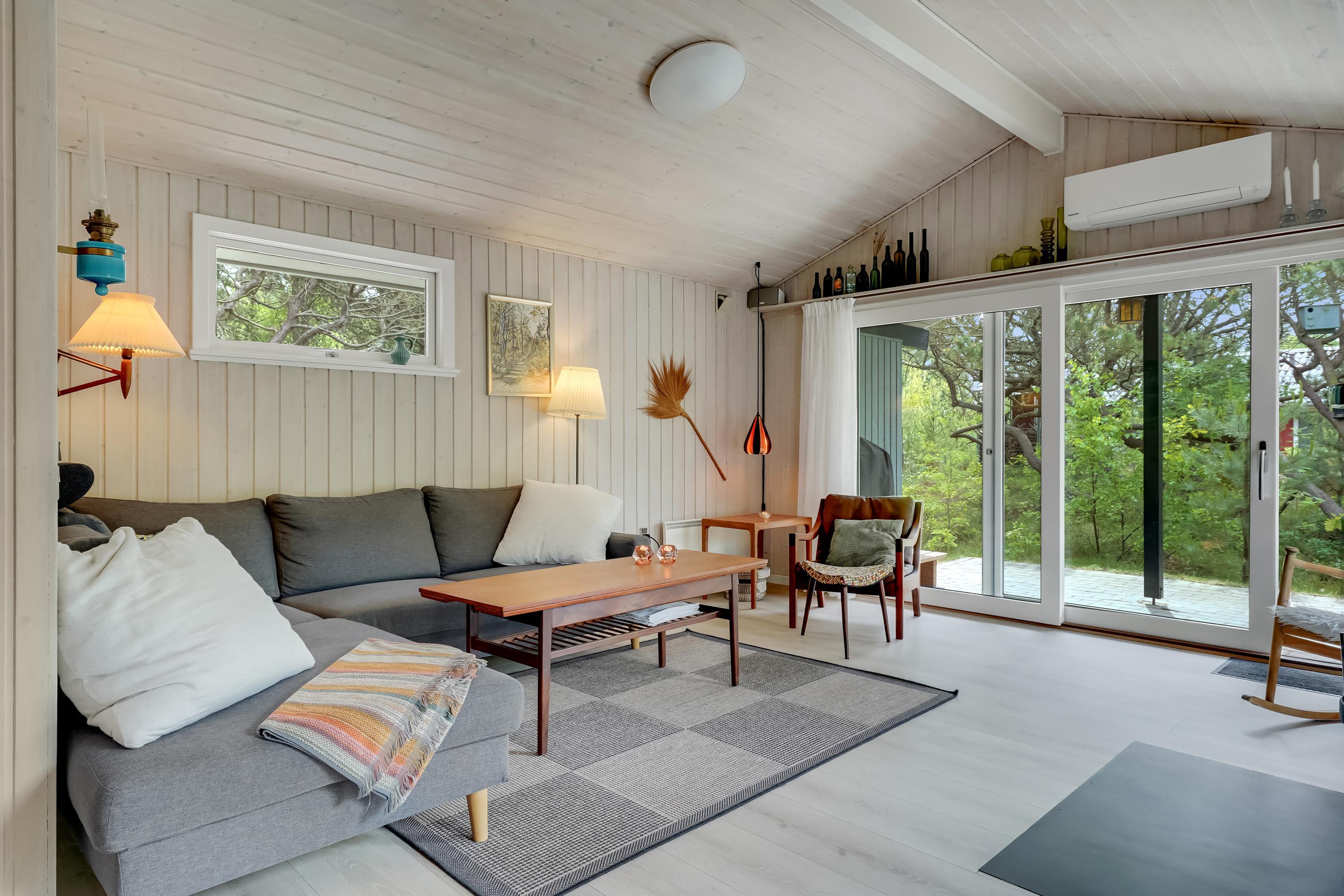 En hyggelig stue med brændeovn, varmepumpe og TV – det perfekte sted at slappe af i komfortable møbler. Desuden DVD og CD afspiller.