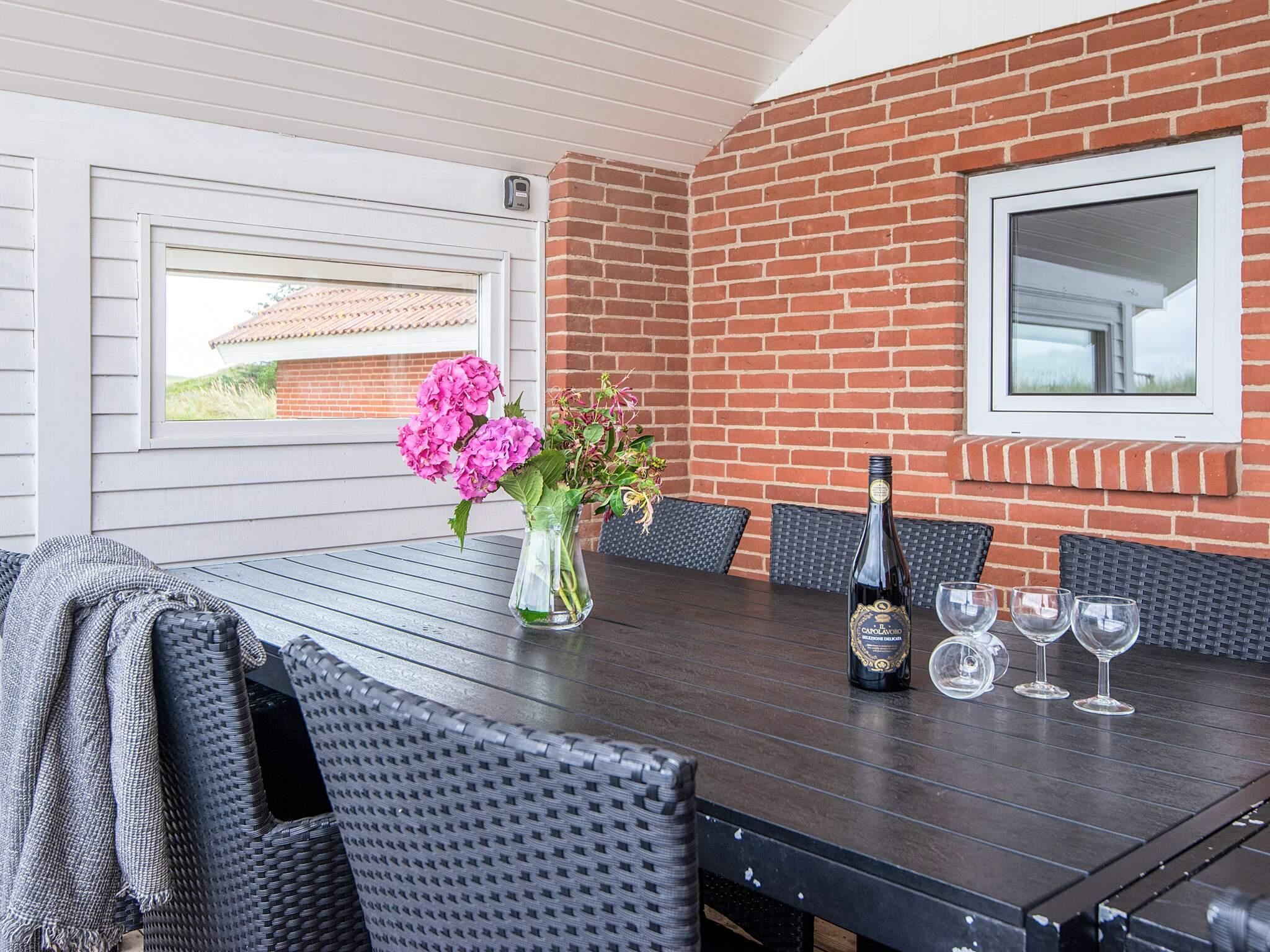 Huset er omgivet af terrasser både mod syd og vest og mod øst en herlig overdækket og helt afskærmet terrasse, hvor I kan forlænge sommeren. Udlejes ikke til ungdomsgrupper.