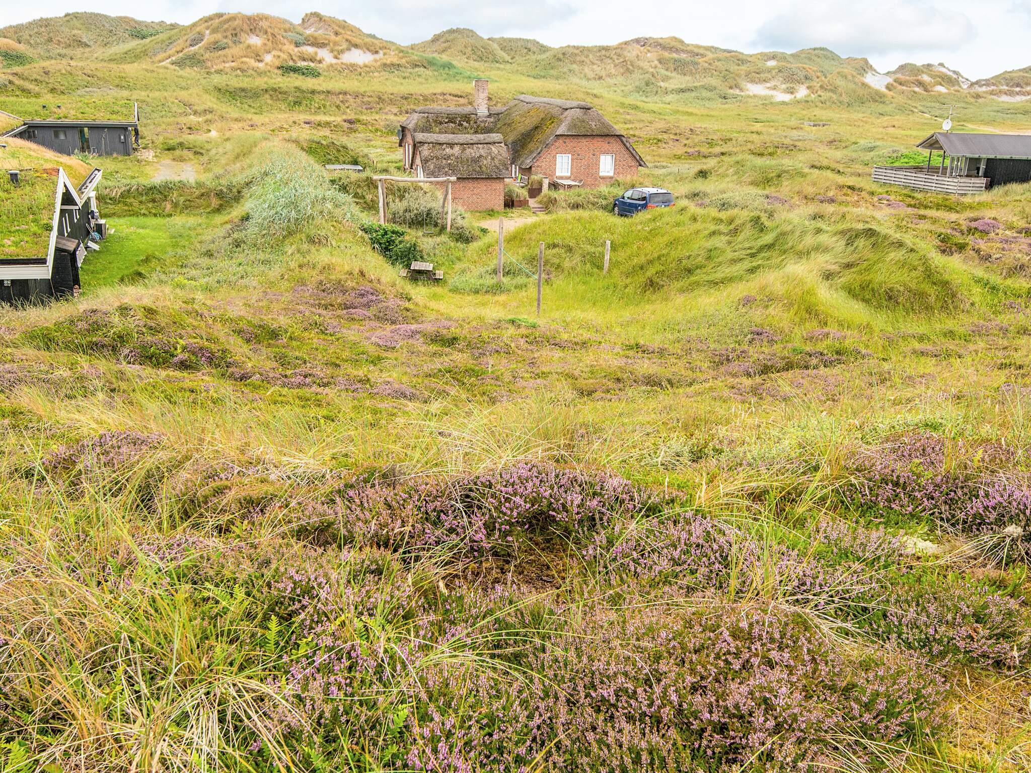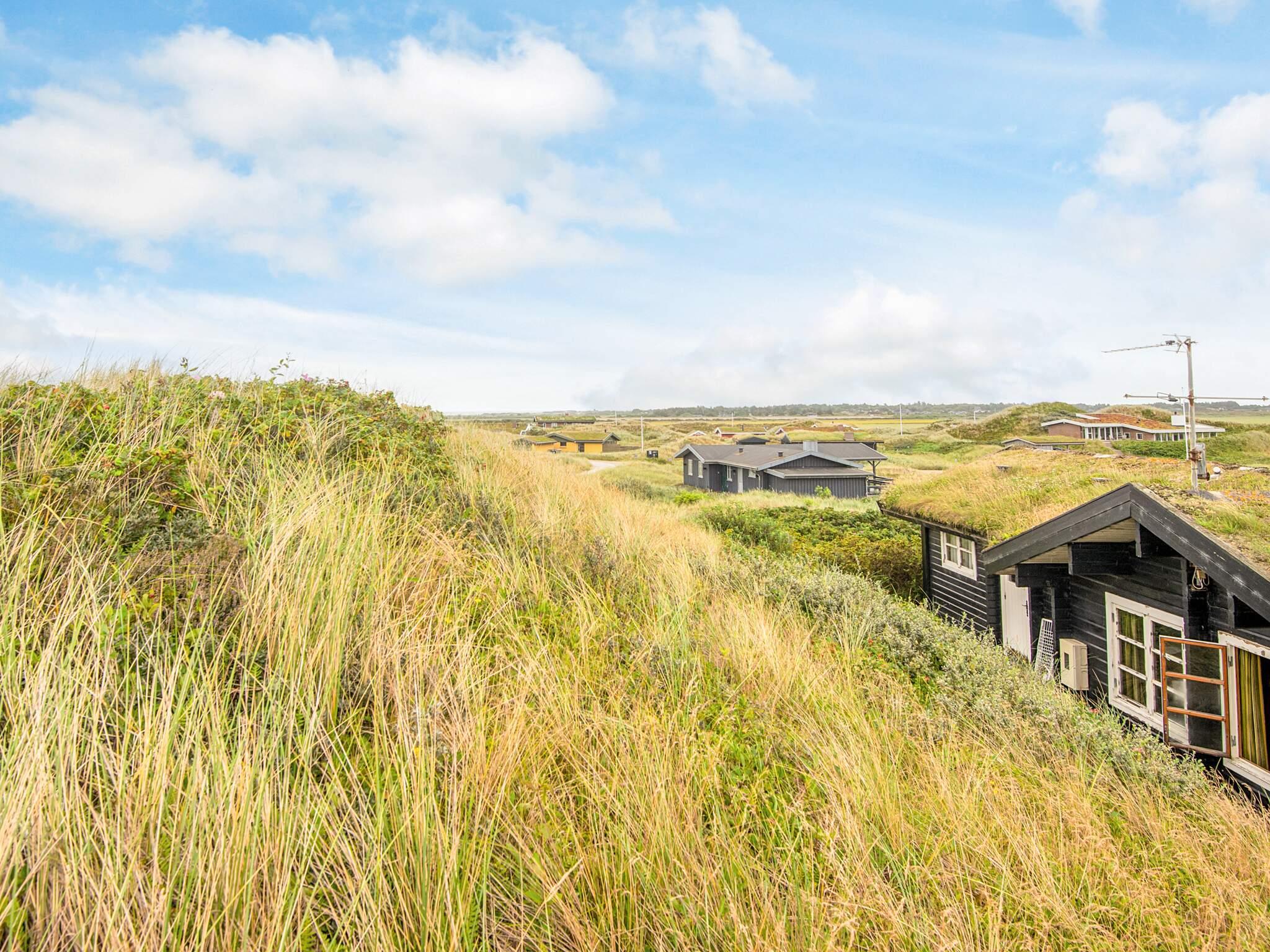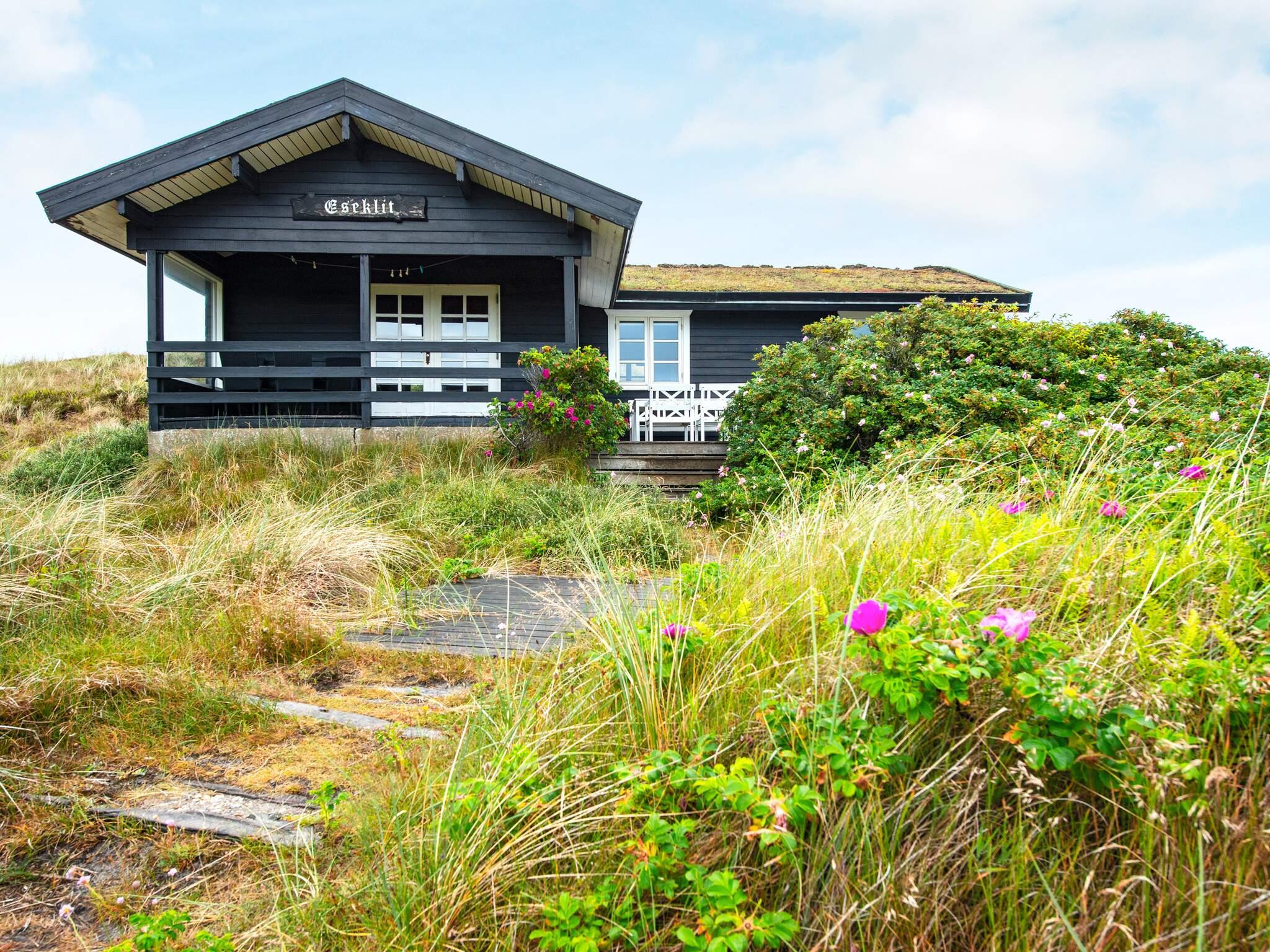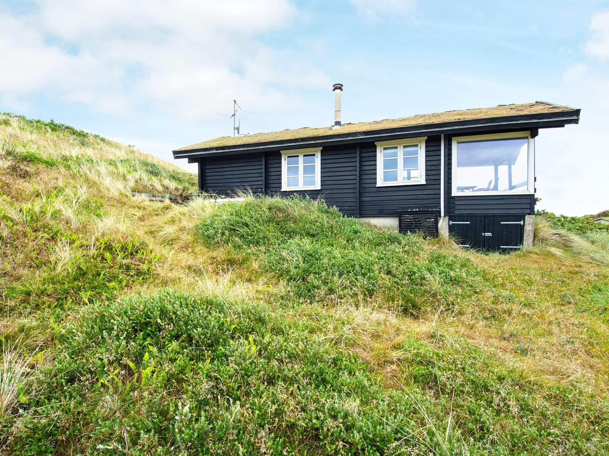 Tæt på Vesterhavet ligger dette højtbeliggende sommerhus på kuperet grund, hvorfra I kan nyde en fantastisk udsigt over området og klitterne. Udsigten kan nydes fra såvel husets vestvendte som sydvendte terrasse. Huset er bygget som bjælkehytte og har en rustik og enkel indretning med trævægge, lofter og kokostæpper. Åben stue/køkken, tre soverum, hvoraf et har dobbeltseng, og to har enkeltsenge med en køjeseng over. Køjesengen måler 60 i bredden. Dette er et ideelt hus for naturelskere, der ønsker at trave lange ture i en betagende flot natur, i klitterne og ved stranden og bagefter slappe af foran brændeovnens knitrende flammer. Huset er ikke egnet til handicappede eller gangbesværede.