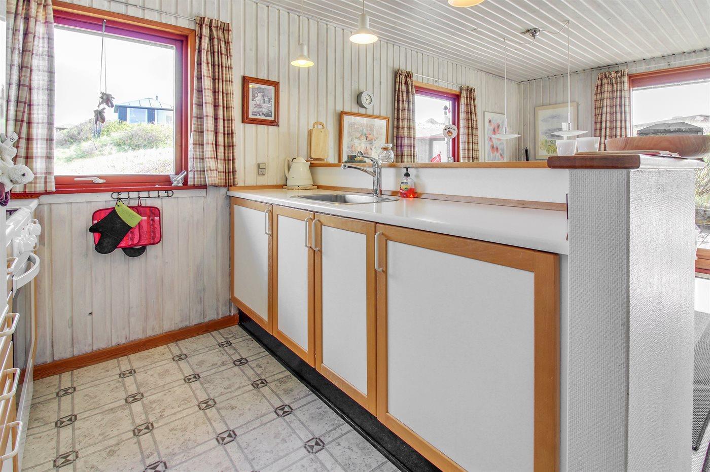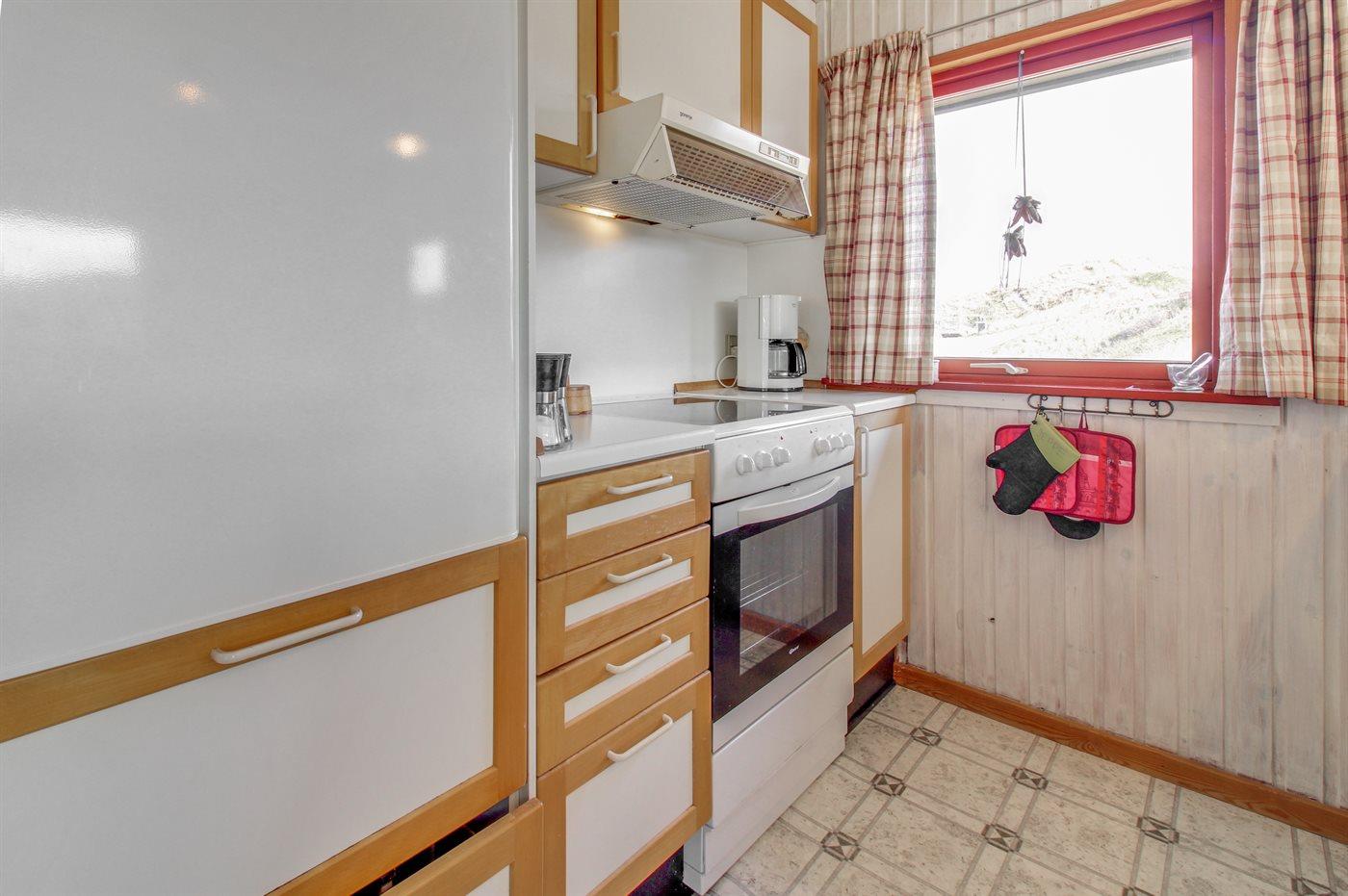 Køkkenet er udstyret med 1 køleskab. Der er 4 keramiske kogeplader, varmluftovn, mikrobølgeovn samt opvaskemaskine.
