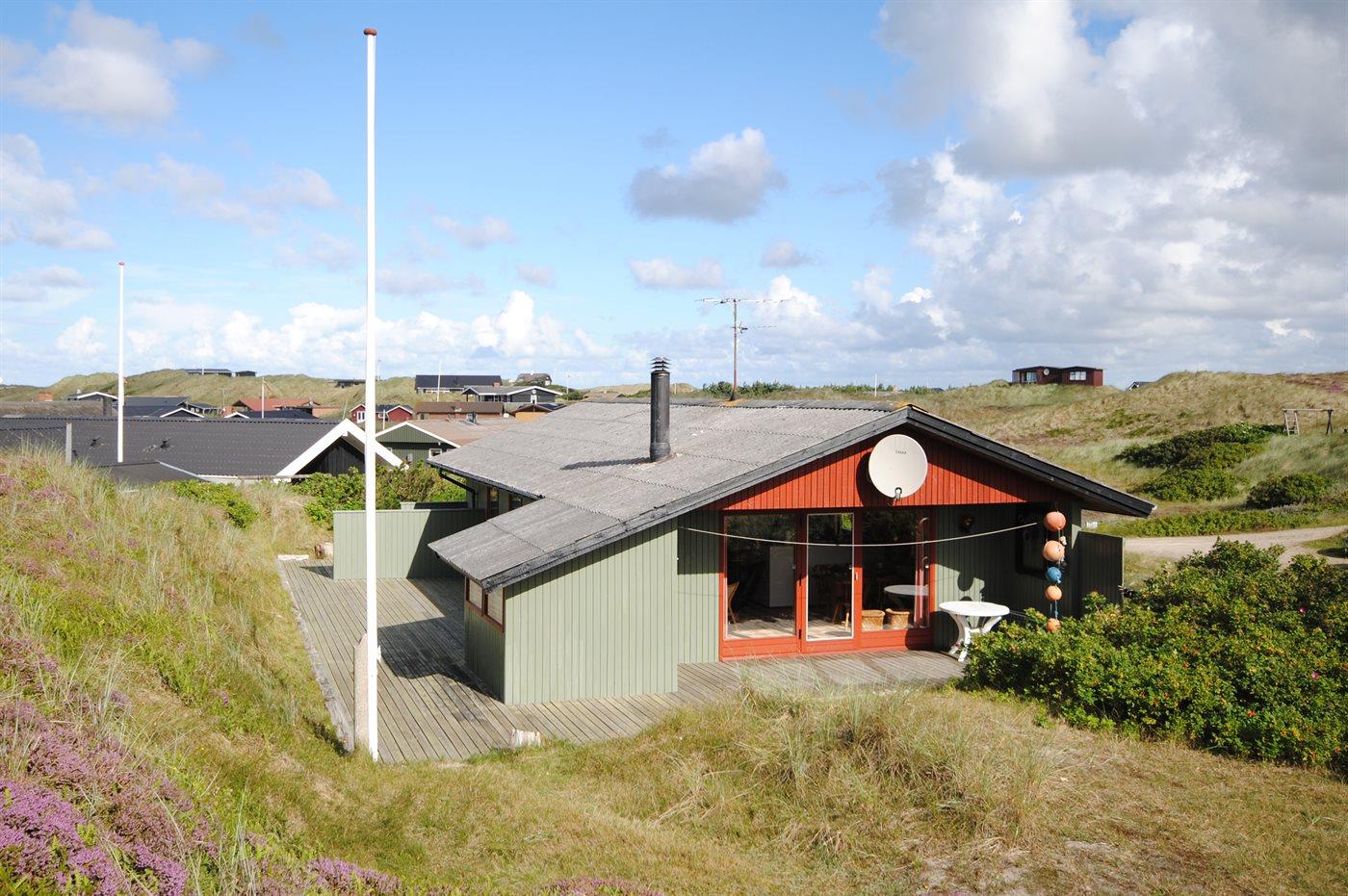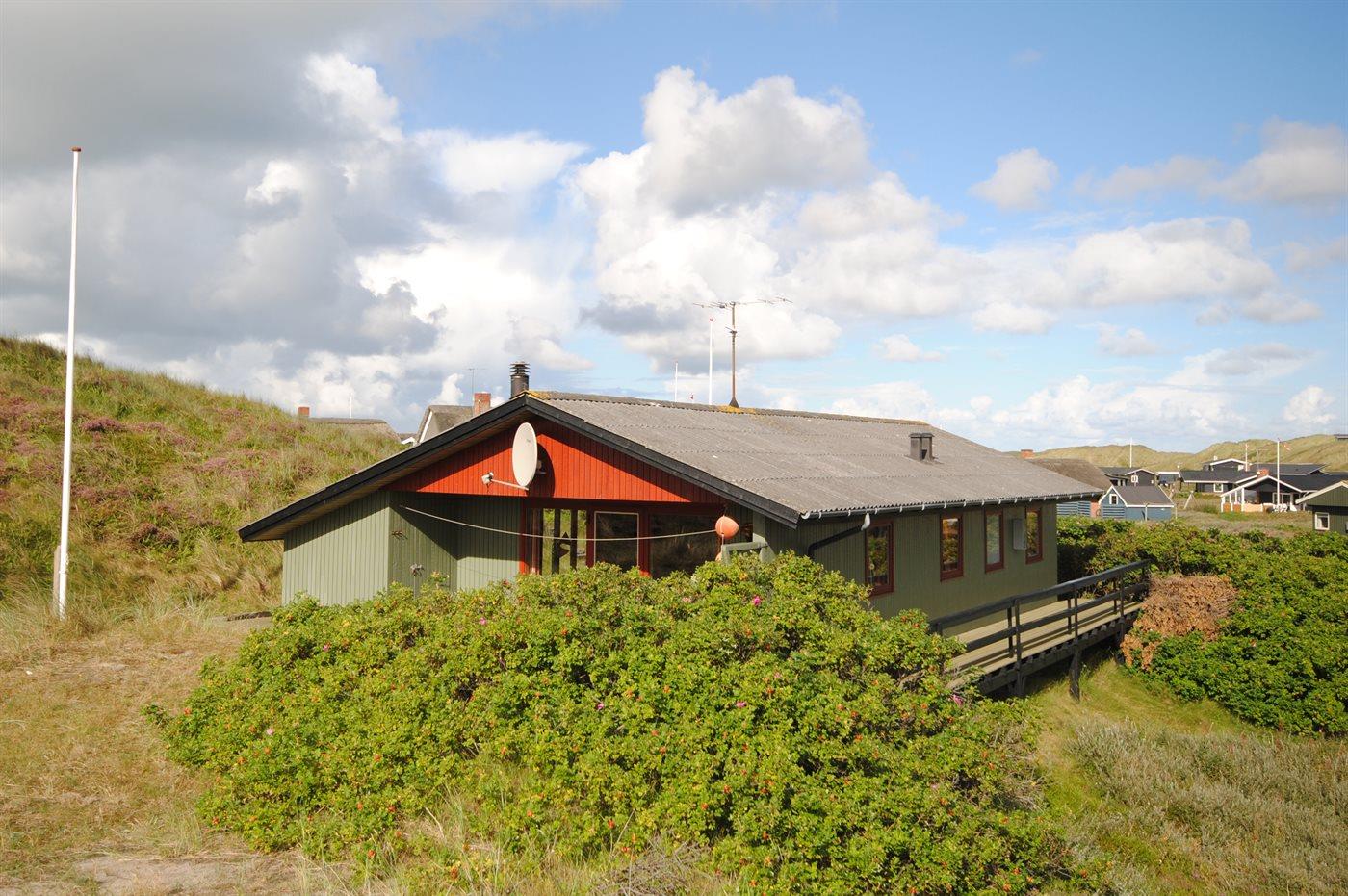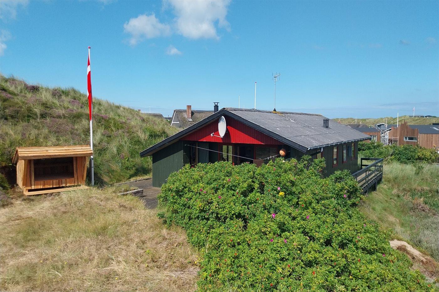 Godt beliggende sommerhus i træ, 1977/1991, på en skøn kuperet klitgrund kun 400 m fra havet. Der er havudsigt fra toppen af grunden. Stor åben samt overdækket terrasse.