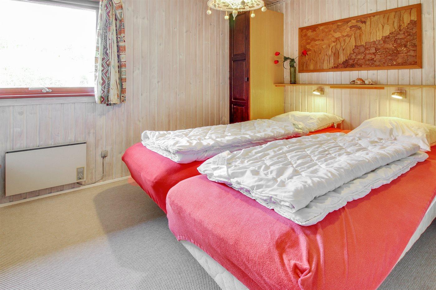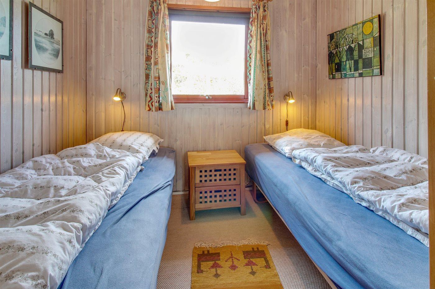 Der er i alt 3 soveværelser. Sovepladserne fordeler sig på: 2 sovepladser i dobbeltseng. 2 sovepladser i enkeltsenge.1 soveplads i køjeseng.
