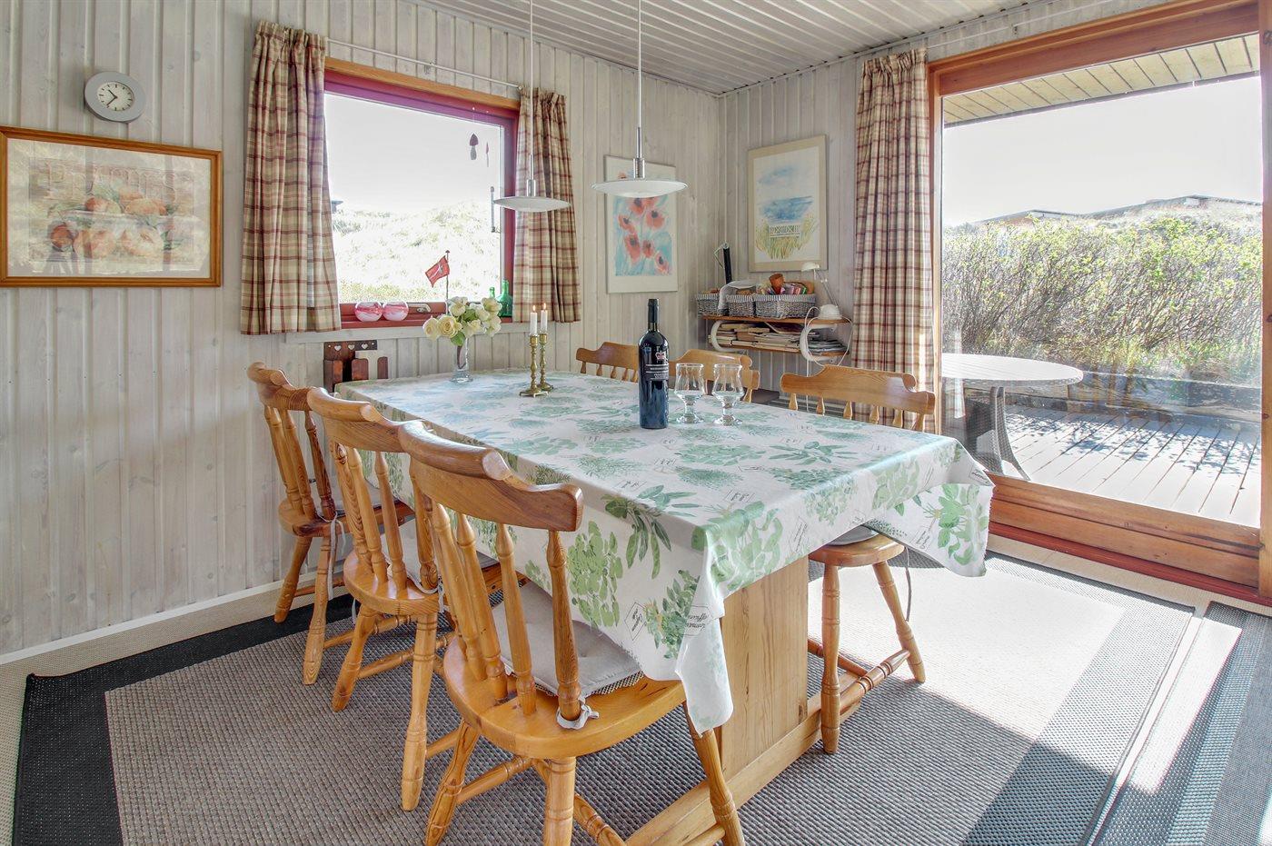 Ferieboligen er beliggende på en 1400 m² stor klitgrund. Der er 400 m til havet. Der er 4000 m til fjorden. Nærmeste forretning er beliggende i en afstand af 500 m. Til ferieboligen hører 60 m² terrasseareal. Desuden er der 8 m² overdækket terrasse. Der er redskabsrum. Gynge. Shelter. Parkering ved ferieboligen.