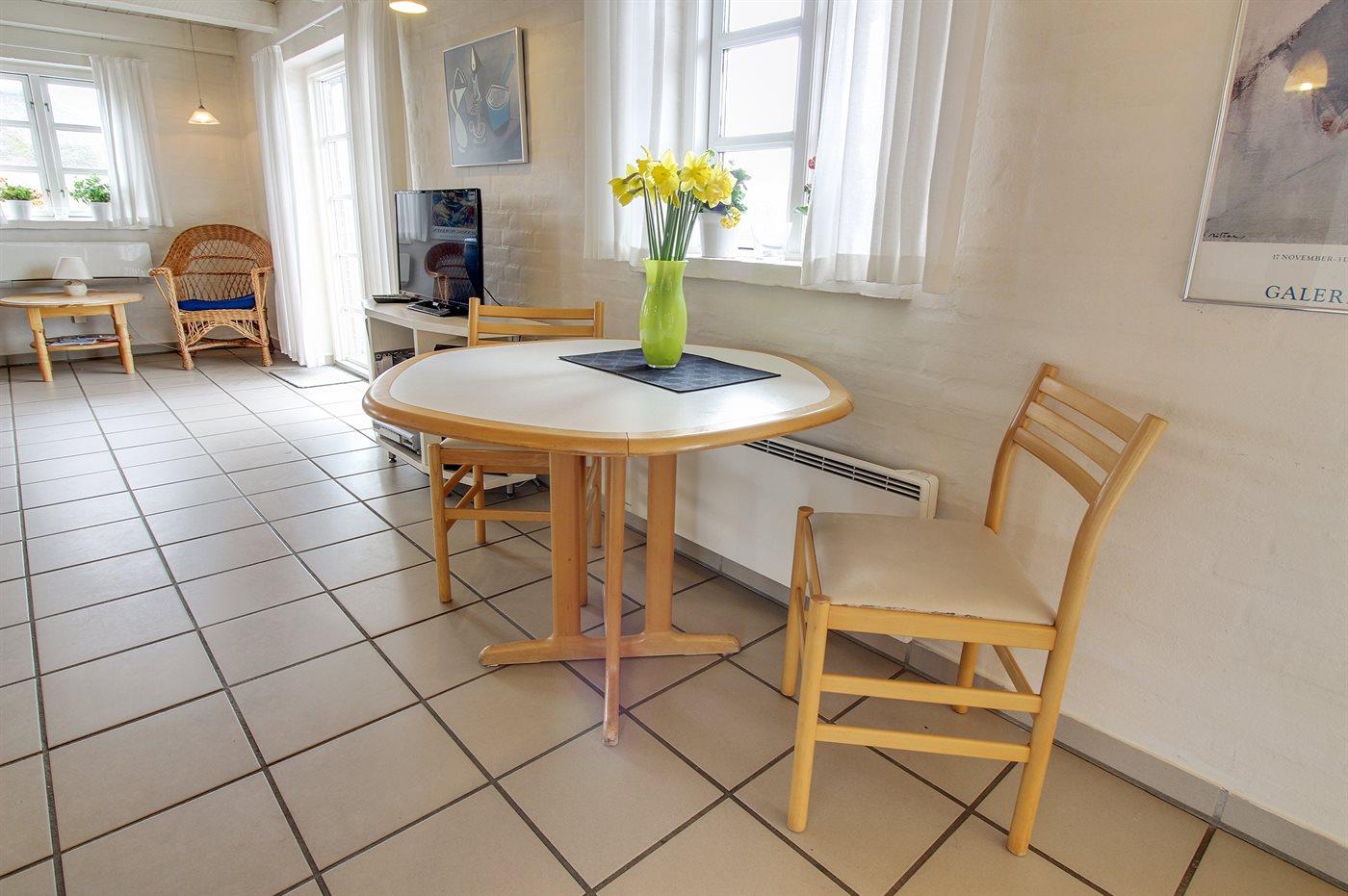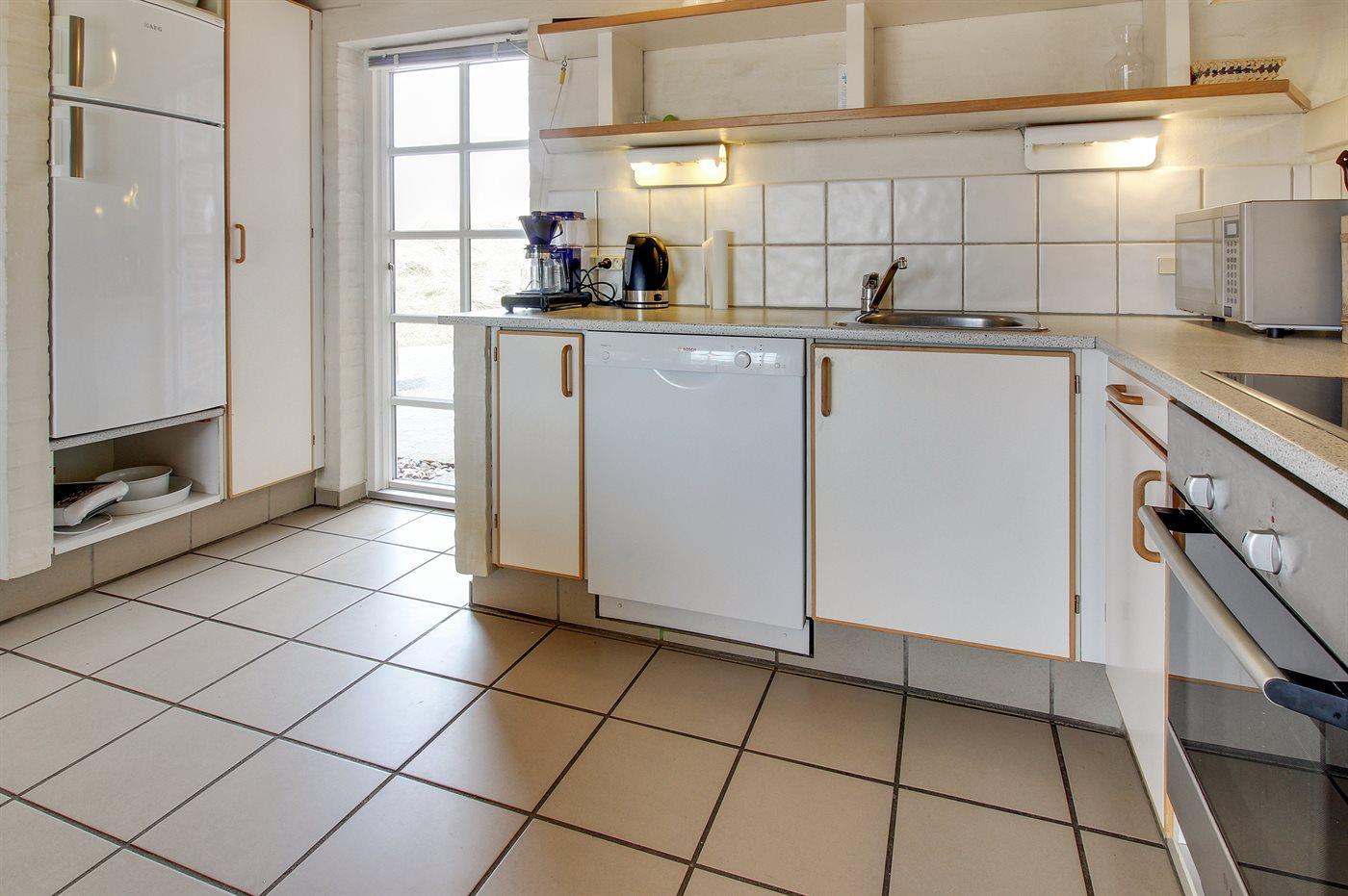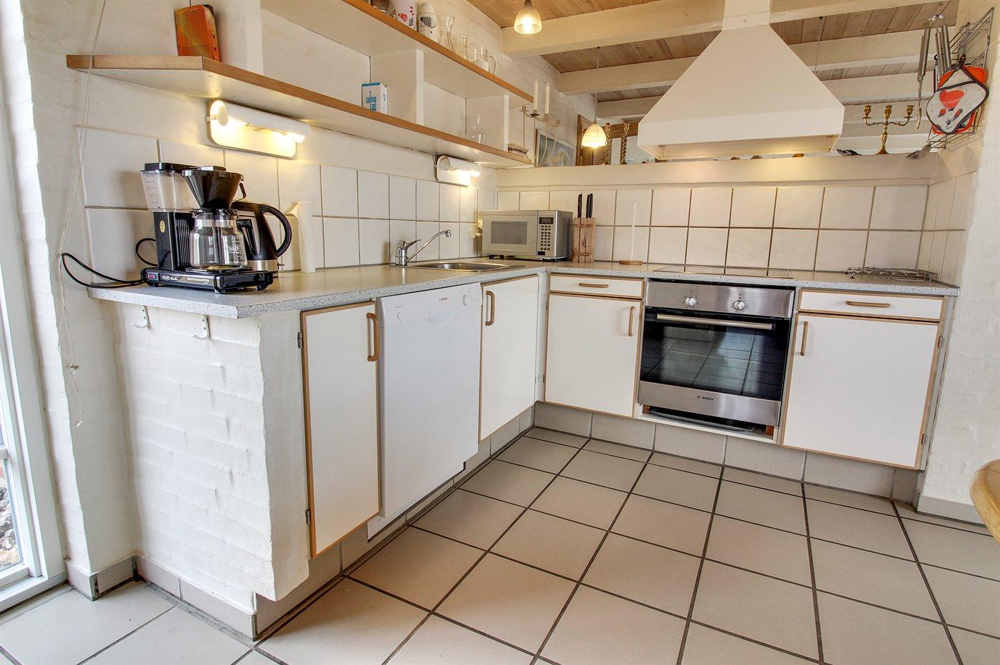 Køkkenet er udstyret med 1 køleskab. Der er 4 elkogeplader, bageovn, mikrobølgeovn samt opvaskemaskine.