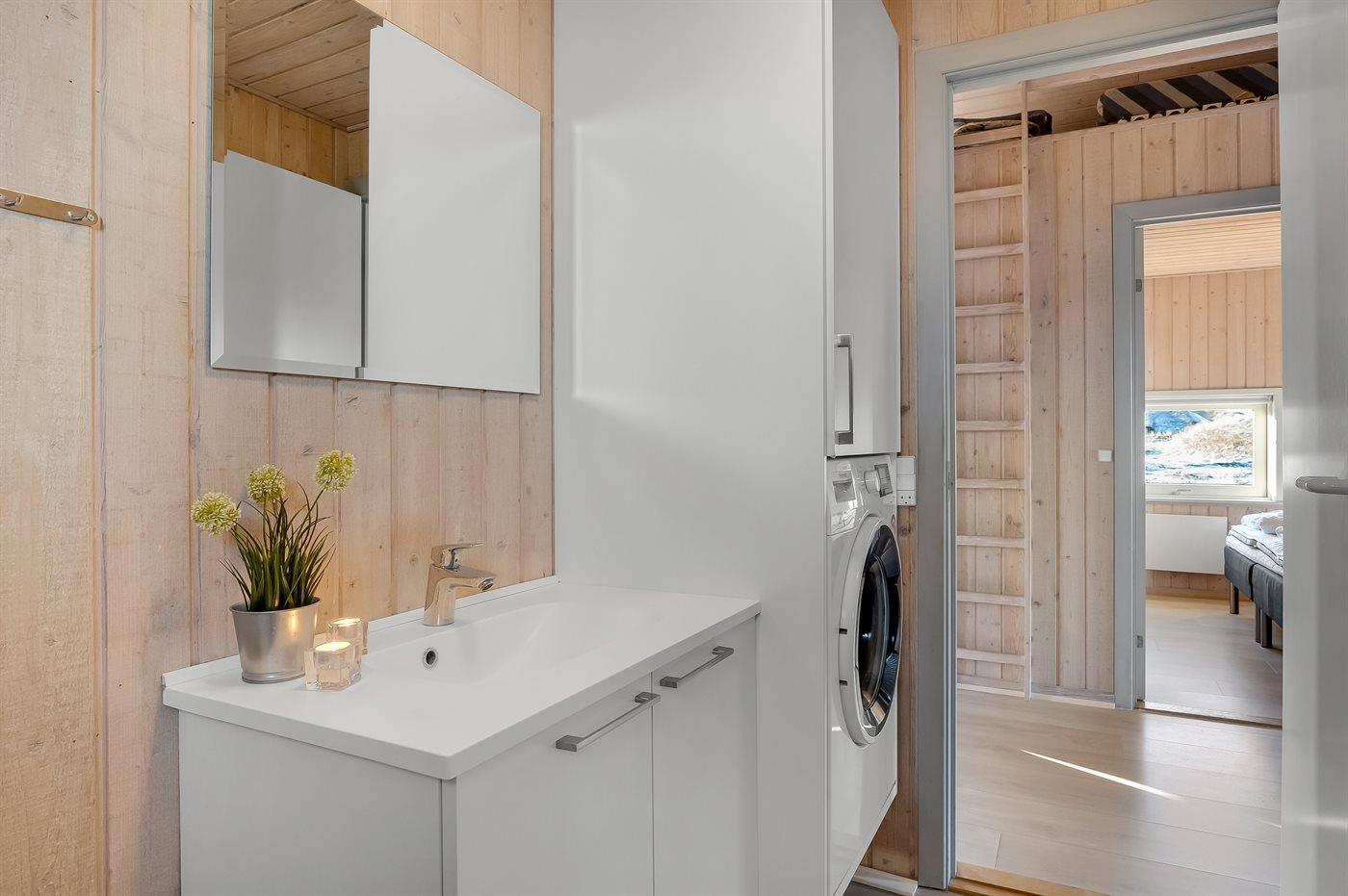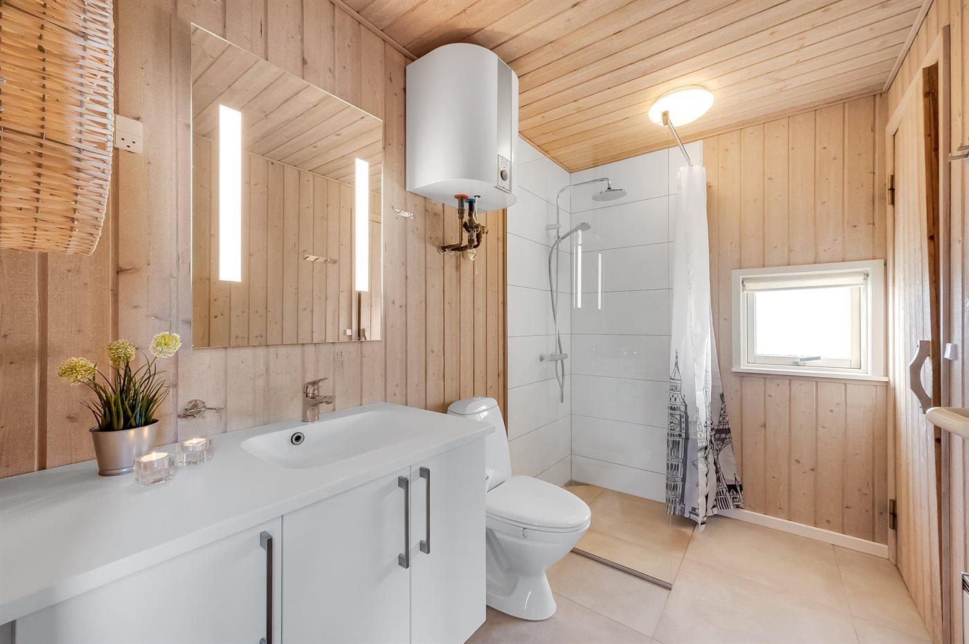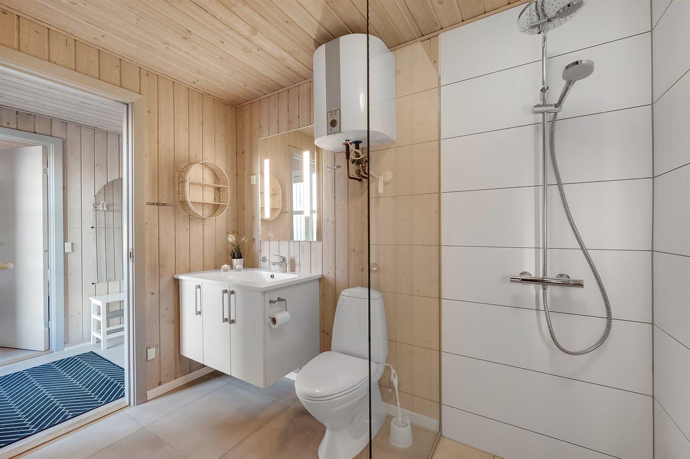 Der er 2 badeværelser med bruser og 2 toiletter. Der er gulvvarme på 2 badeværelser. I saunaen er der mulighed for afslapning.