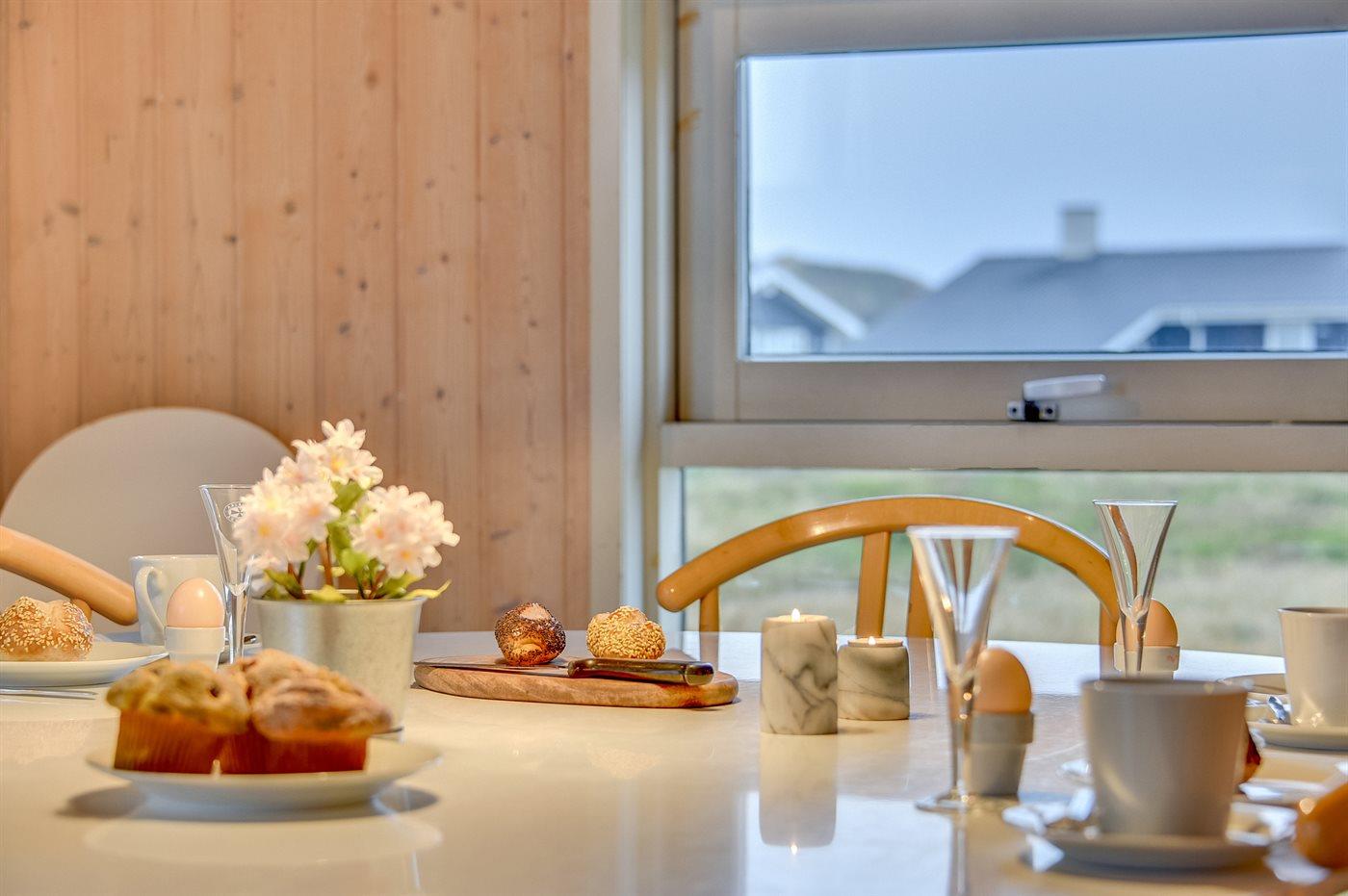 Køkkenet er udstyret med 1 køleskab. Der er 4 elkogeplader, bageovn, mikrobølgeovn samt opvaskemaskine.