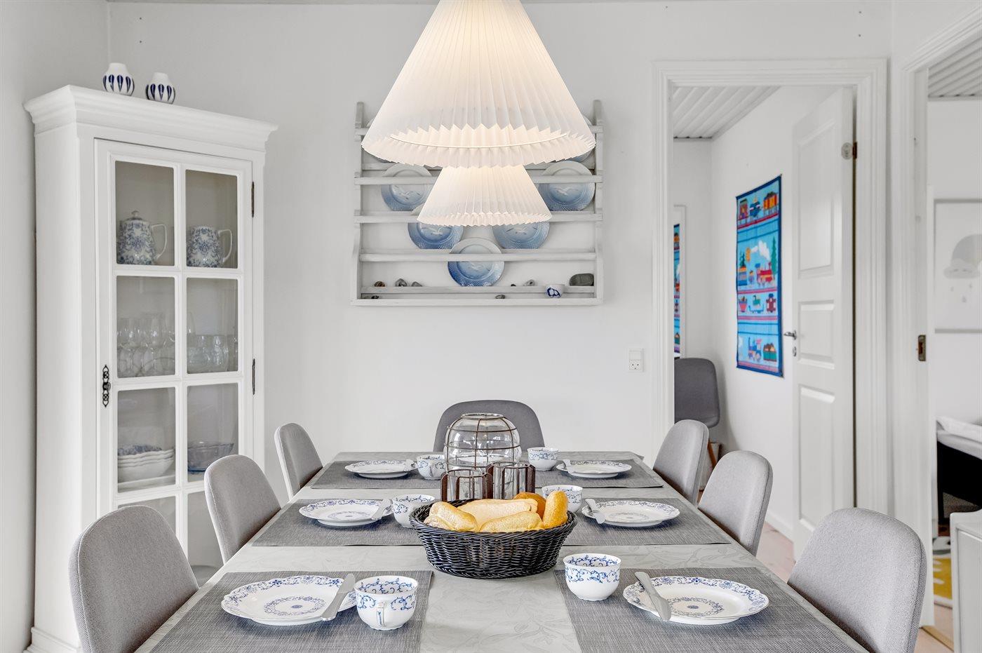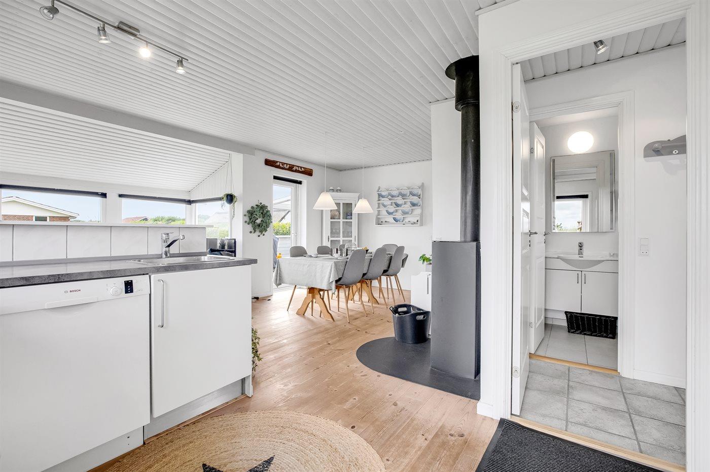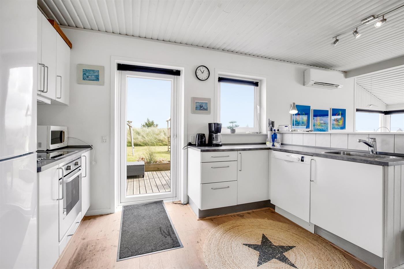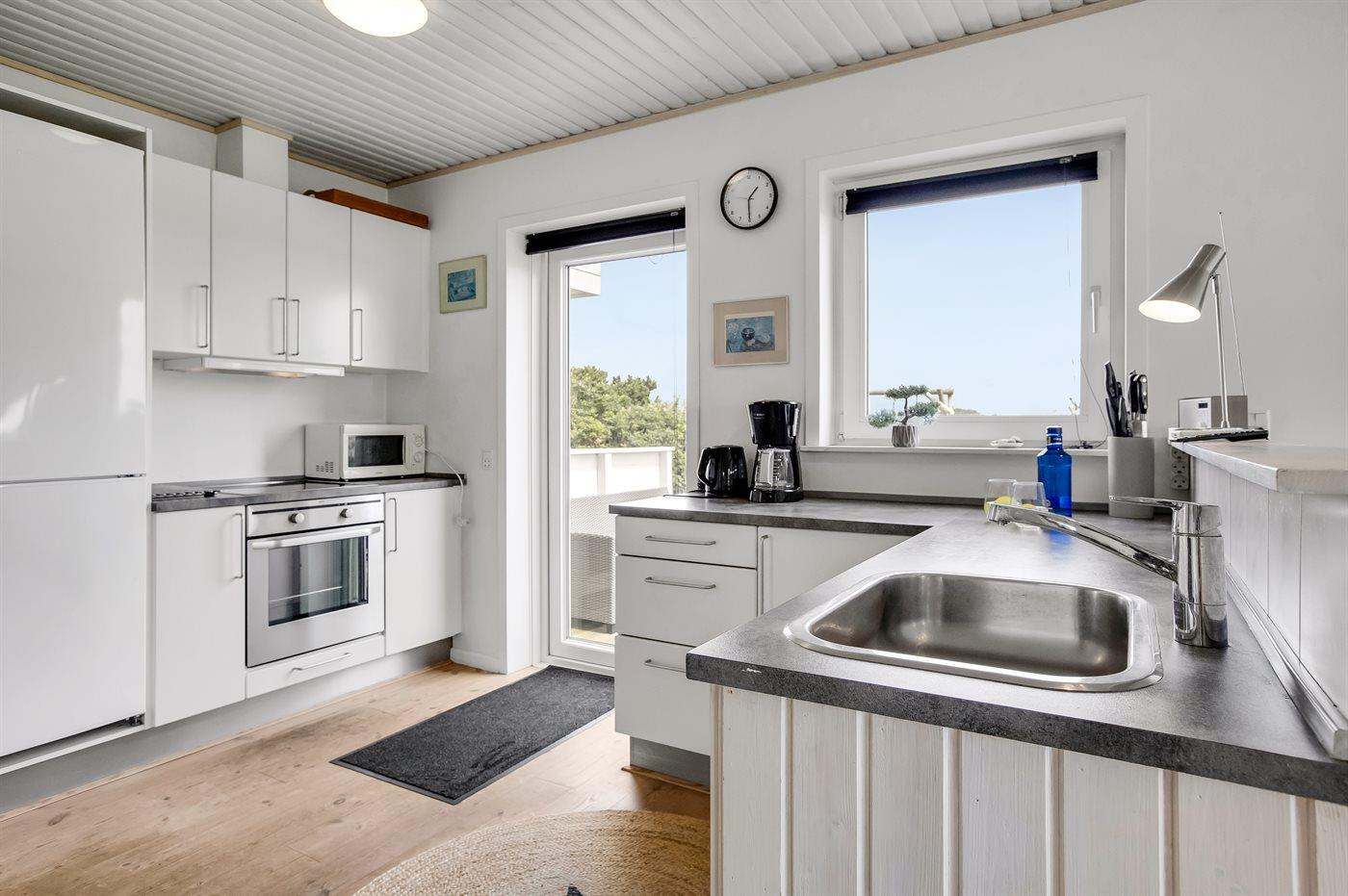 Køkkenet er udstyret med 1 køleskab. Der er 4 keramiske kogeplader, varmluftovn, mikrobølgeovn samt opvaskemaskine.