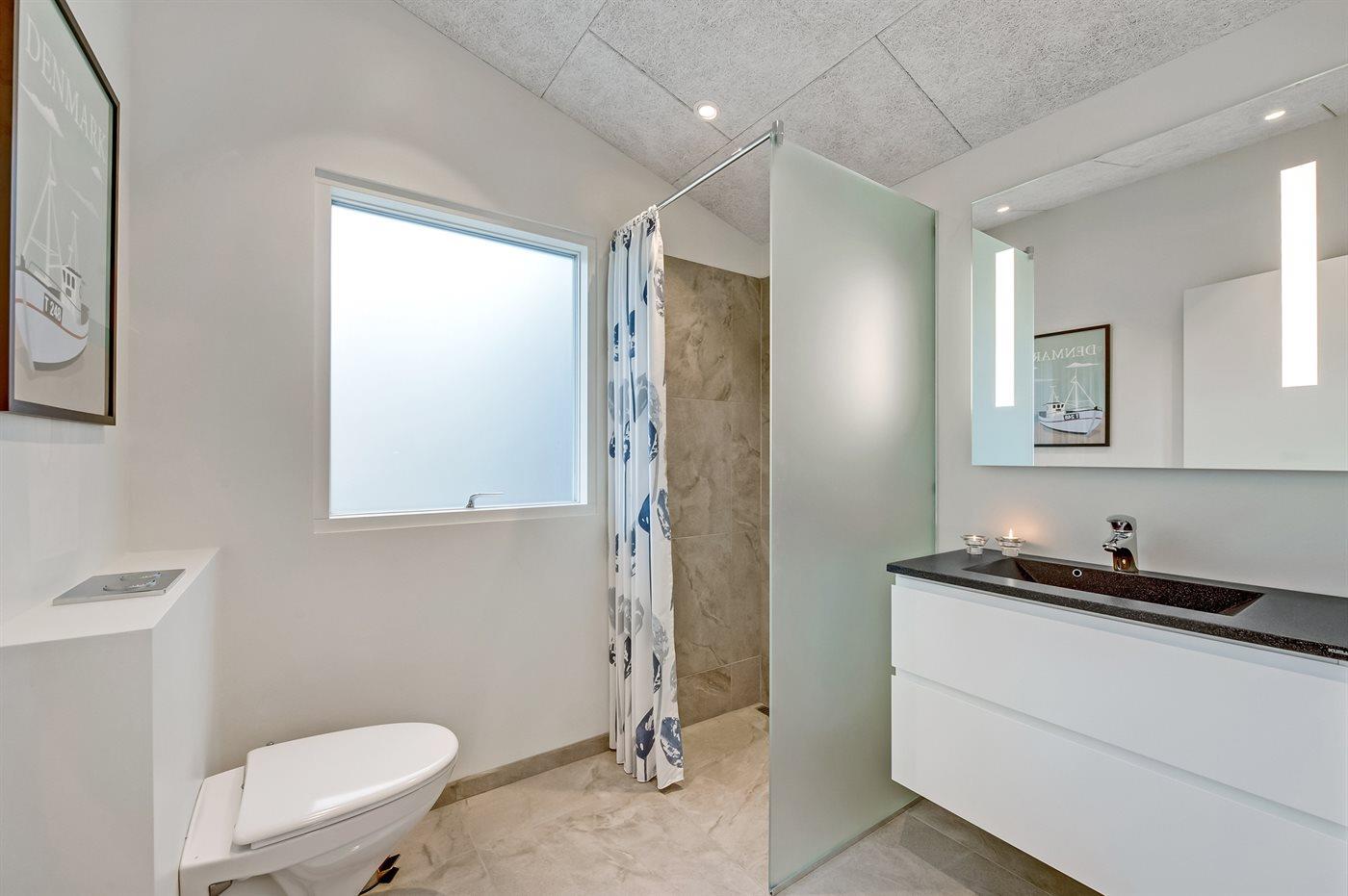 Der er 3 badeværelser med bruseniche og 3 toiletter. Der er gulvvarme på 3 badeværelser. I saunaen er der mulighed for afslapning.