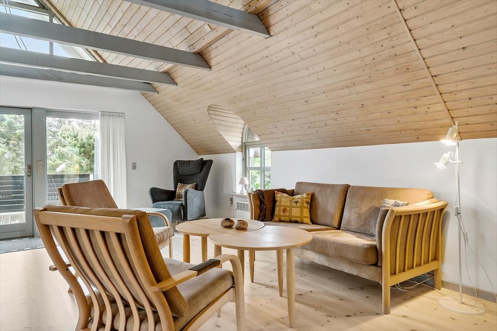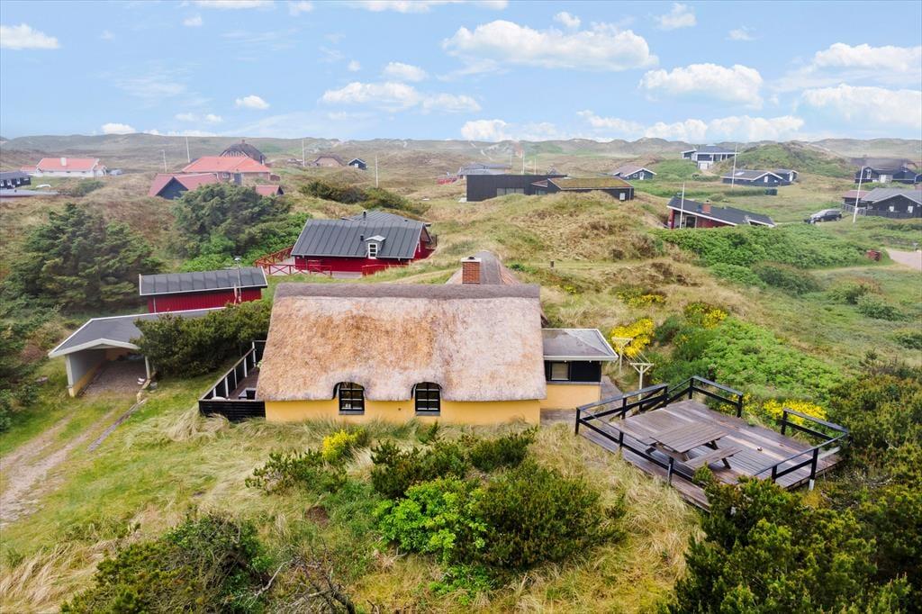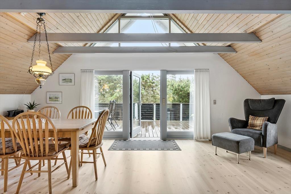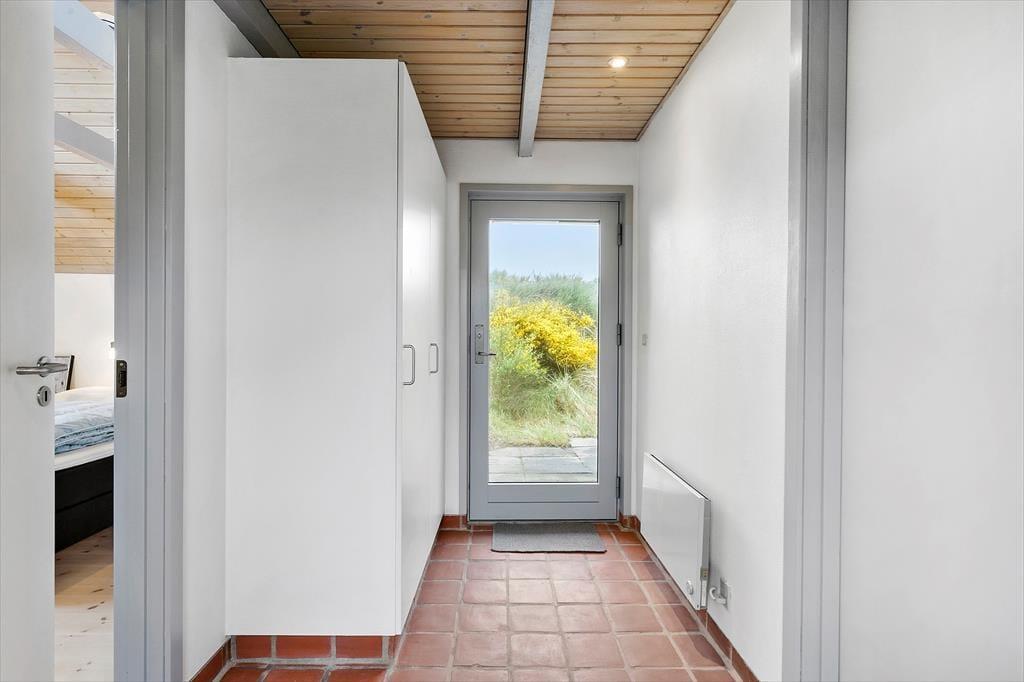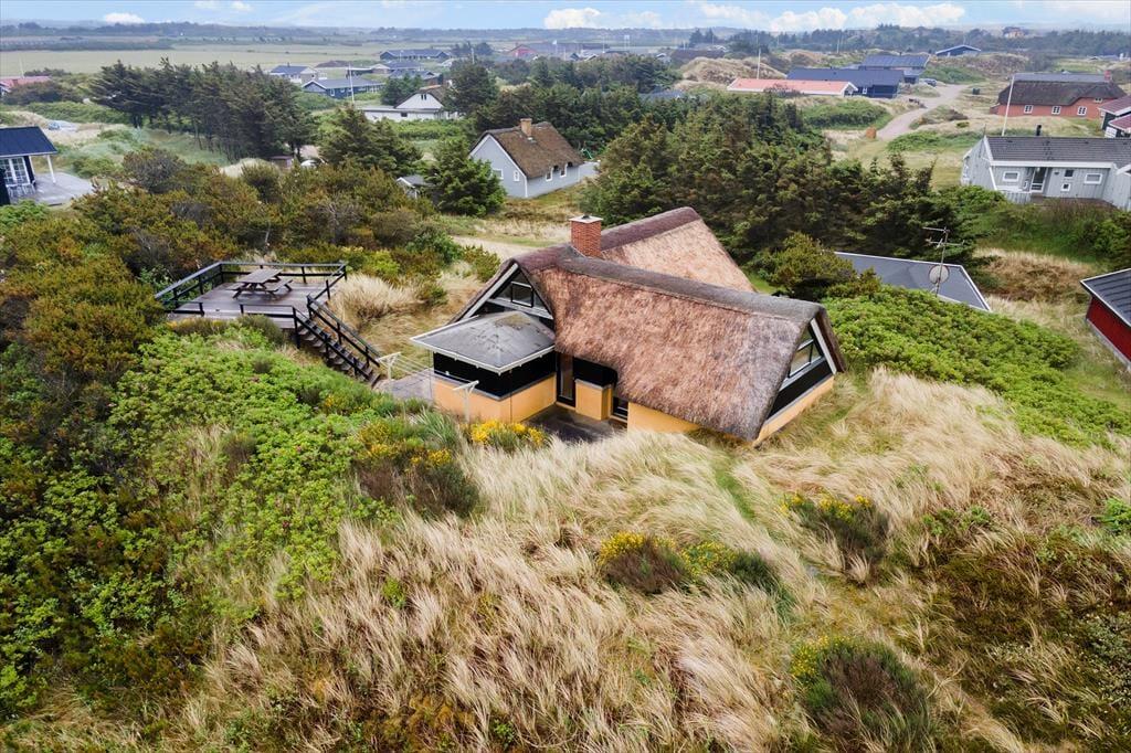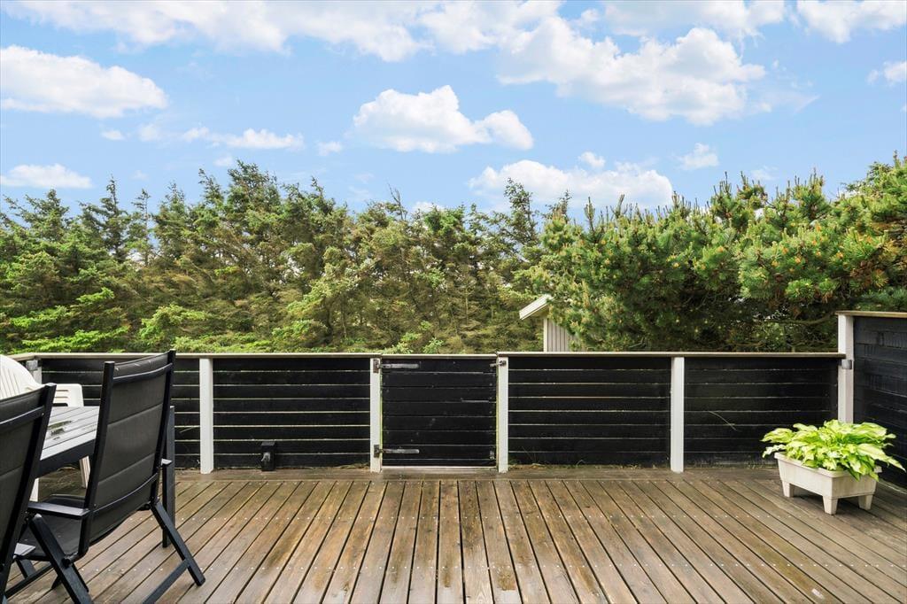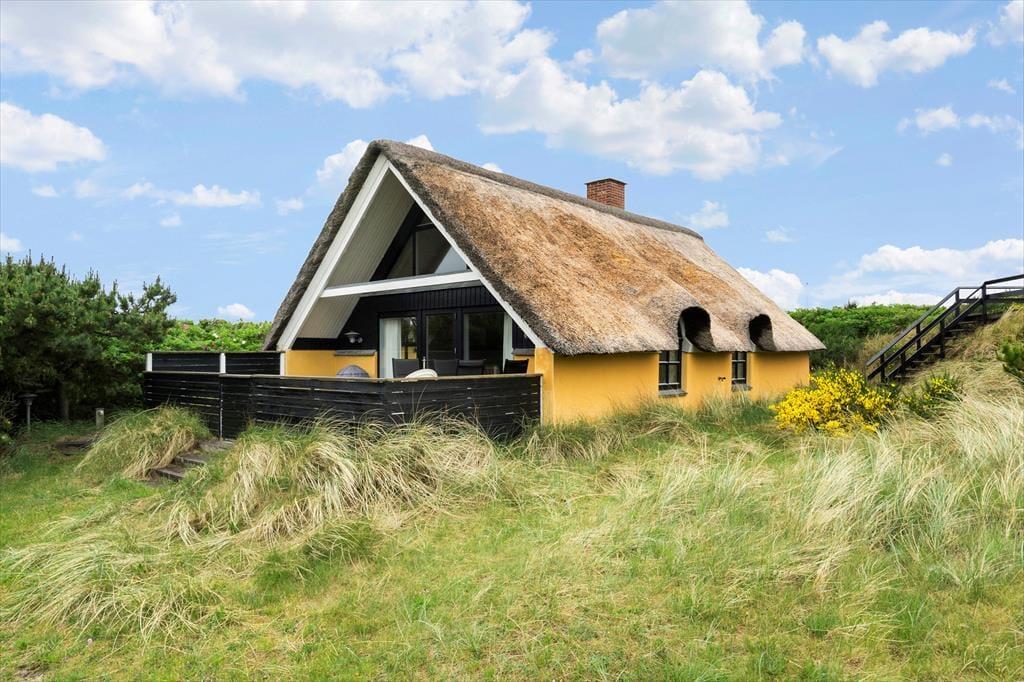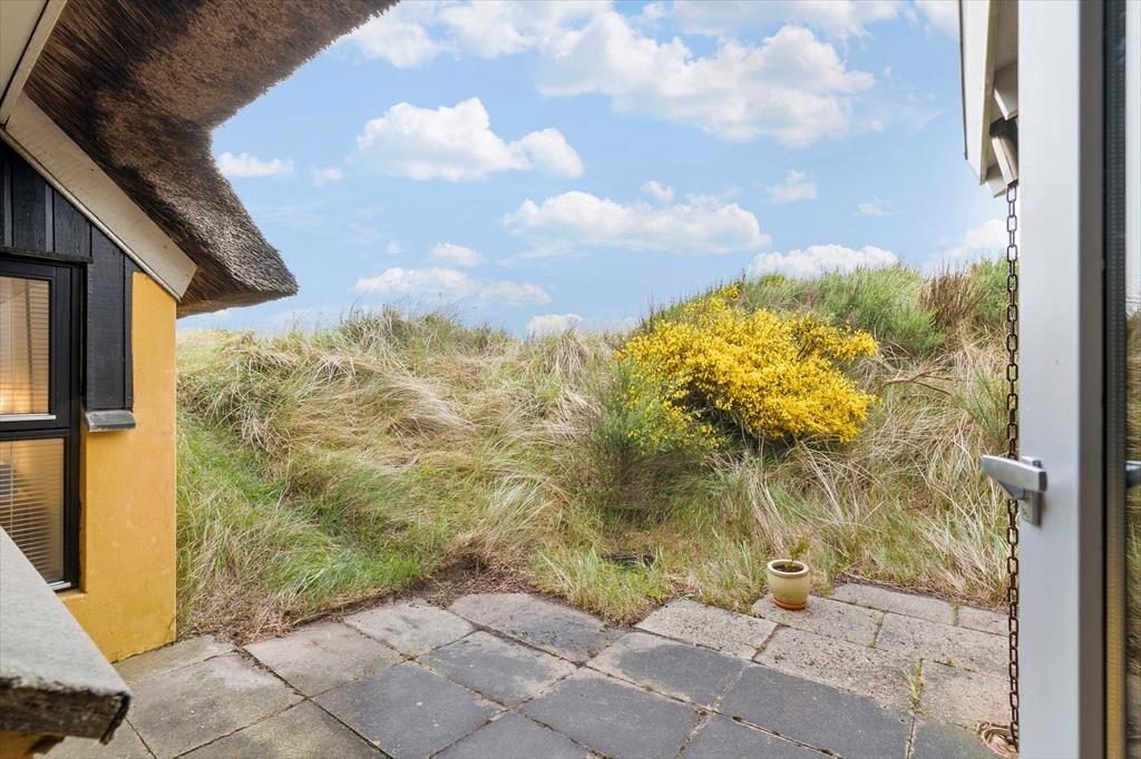 Sommerhuset ligger i det smukke klitlandskab på en 2000 m2 stor naturgrund. Nær huset ligger en carport, og en trappe fører op til en højtliggende terrasse, som er en dejlig udsigtspost. Fra stuen har I direkte adgang til en anden terrasse: Den er sydvendt og dermed meget solrig, og så er den helt aflukket, hvilket gør den til en sikker base for små børn og hunde.