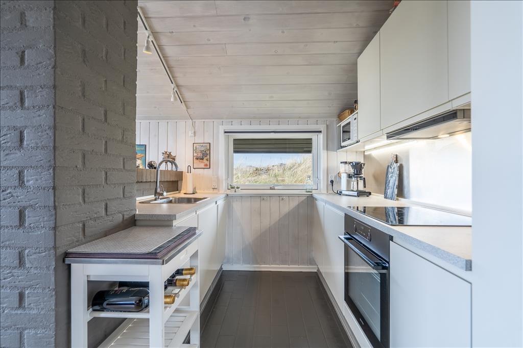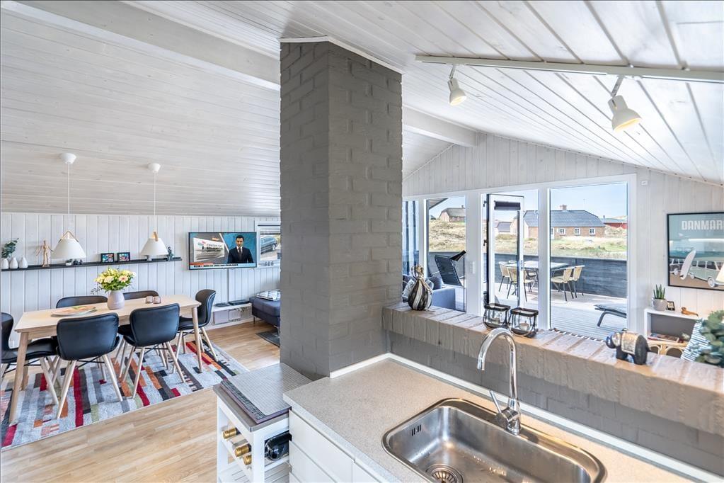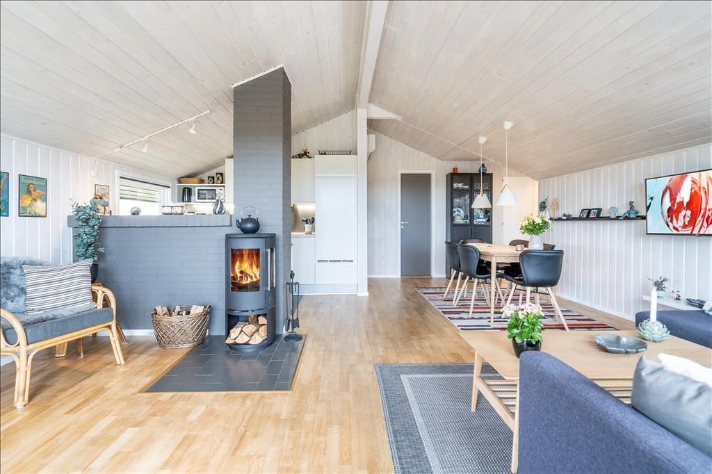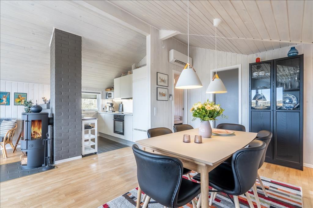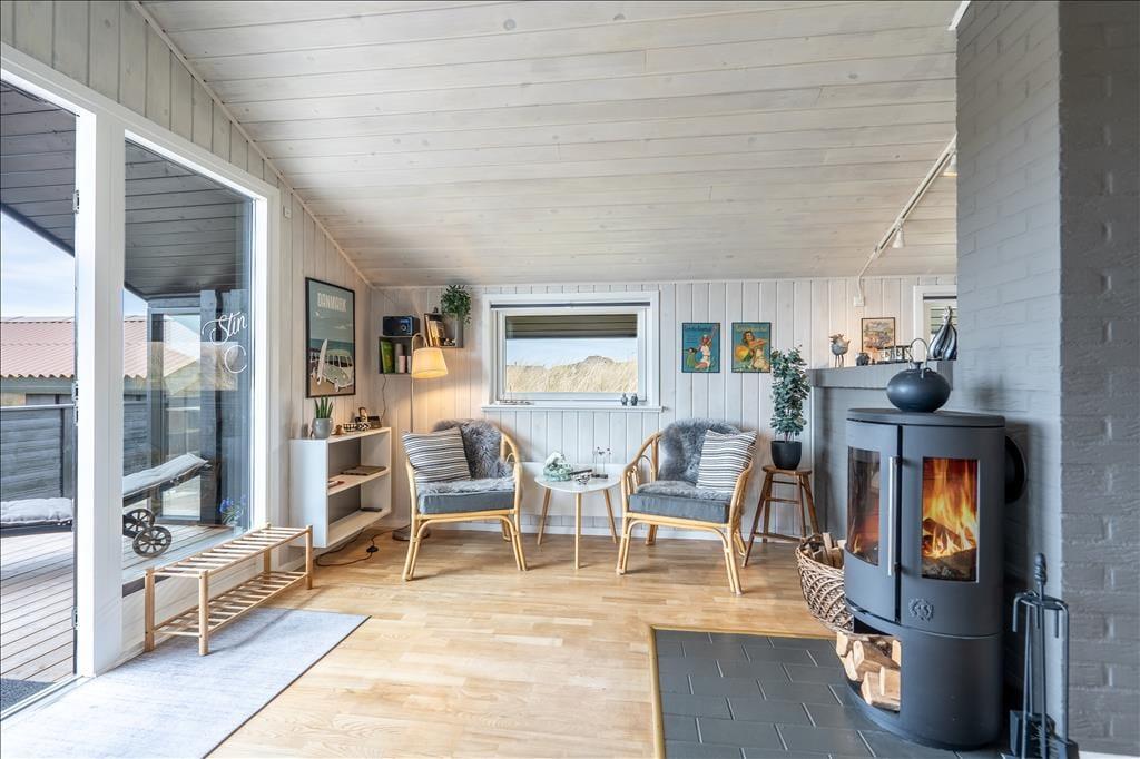 Efter en totalrenovering i 2021 fremstår alle rum i huset lyse og indbydende. Det pæne badeværelse er med bruser, vaskemaskine og gulvvarme, og i køkkenet har I alt det nødvendige for at lave dejlig mad. Mens I står og kokkererer, er der endda mulighed for at hyggesnakke med resten af ferieselskabet, for køkkenet er en integreret del af stuen, der er udstyret med spisebord, sofaafdeling og et læsehjørne nær brændeovnen. Et stort Smart TV sørger for underholdning, når der rigtigt skal slappes af, og der er også god wi-fi-forbindelse, hvis I vil følge med i nyhederne eller undersøge, hvad der foregår af begivenheder i Søndervig og omegn. Sommerhuset byder for øvrigt på tre gode soveværelser, og i det aflåselige anneks har I plads til at opbevare surfgrej eller andet udstyr.