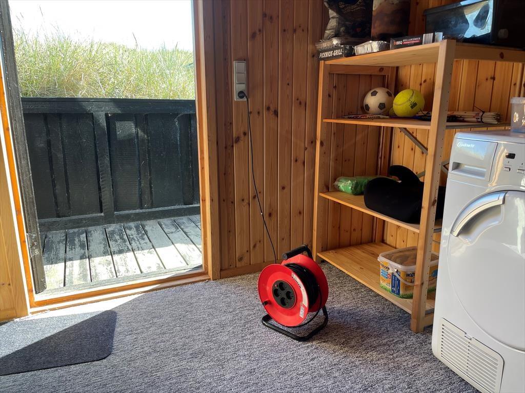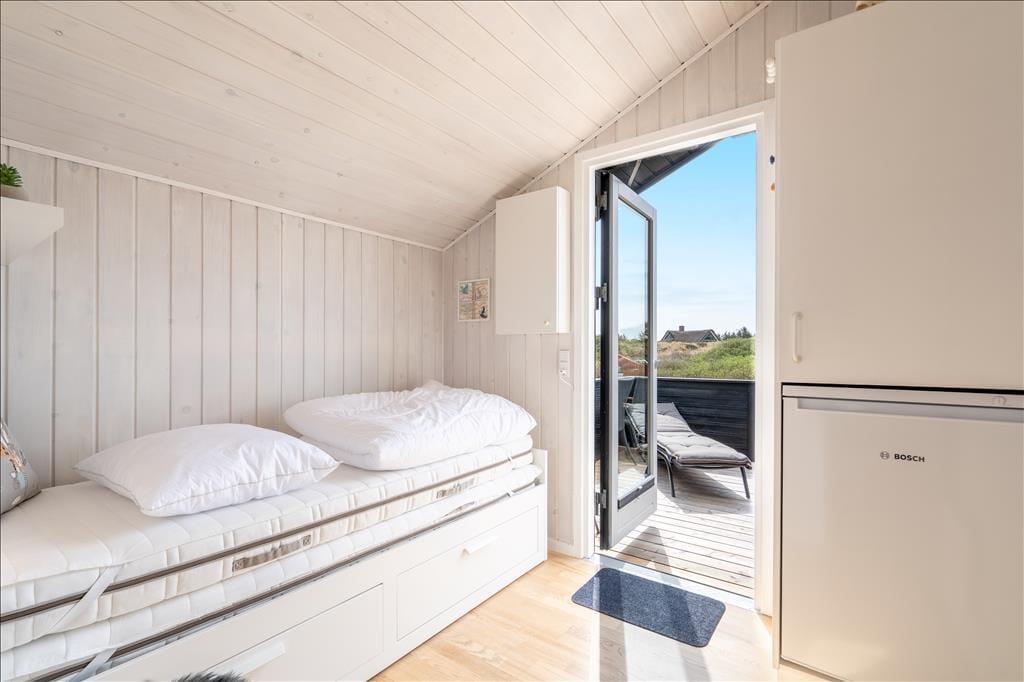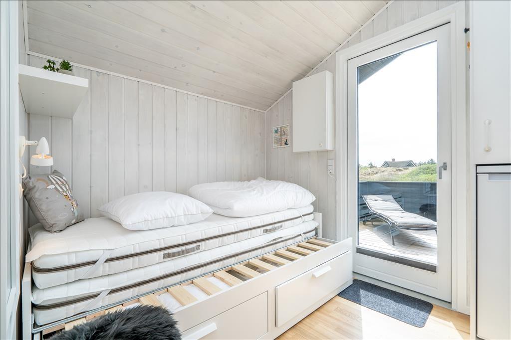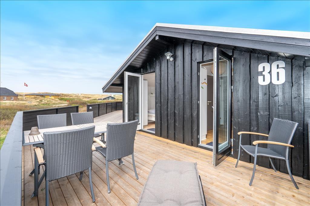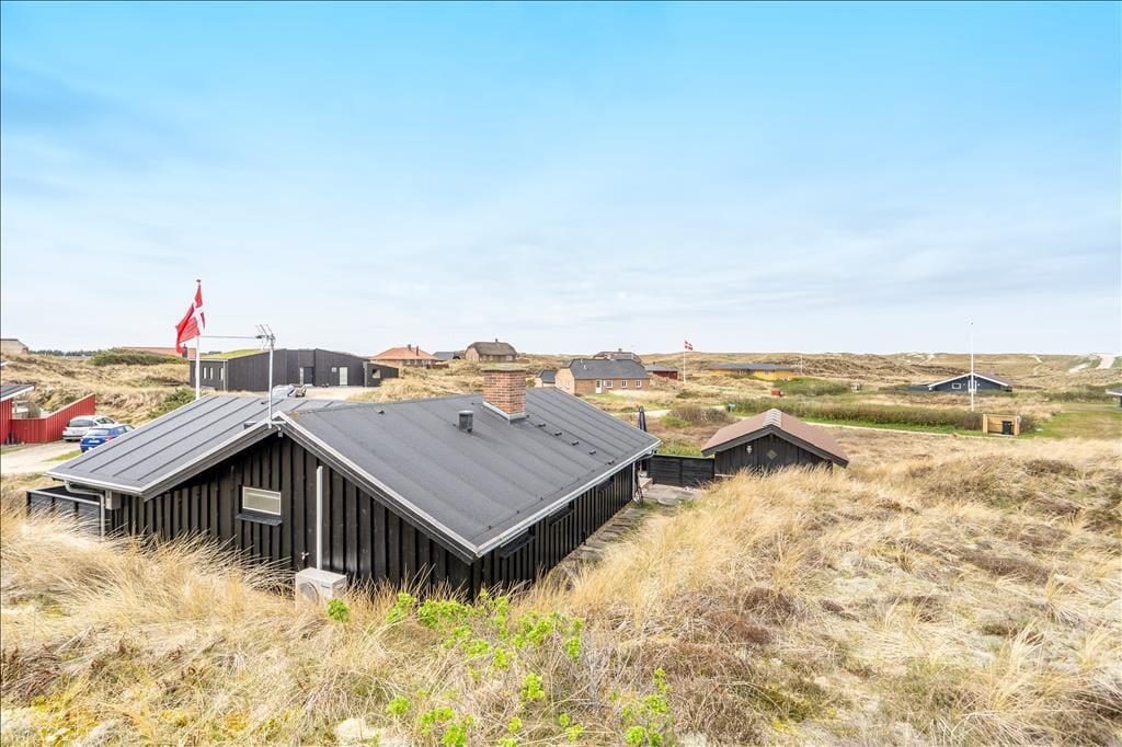 Syd og vest for sommerhuset breder et stort terrassemiljø sig, og I får nemt ved at smutte herud, for I har direkte adgang til det fri fra stuen og to af soveværelserne. Huset ligger højt, så når I sidder her, har I den fineste udsigt til det smukke landskab, og samtidig giver klitterne og afskærmningen jer fornemmelsen af at sidde i ret ugenerede omgivelser. Ved skuret er der for øvrigt et 230 volt stik, hvis I har brug for at oplade elbilen.