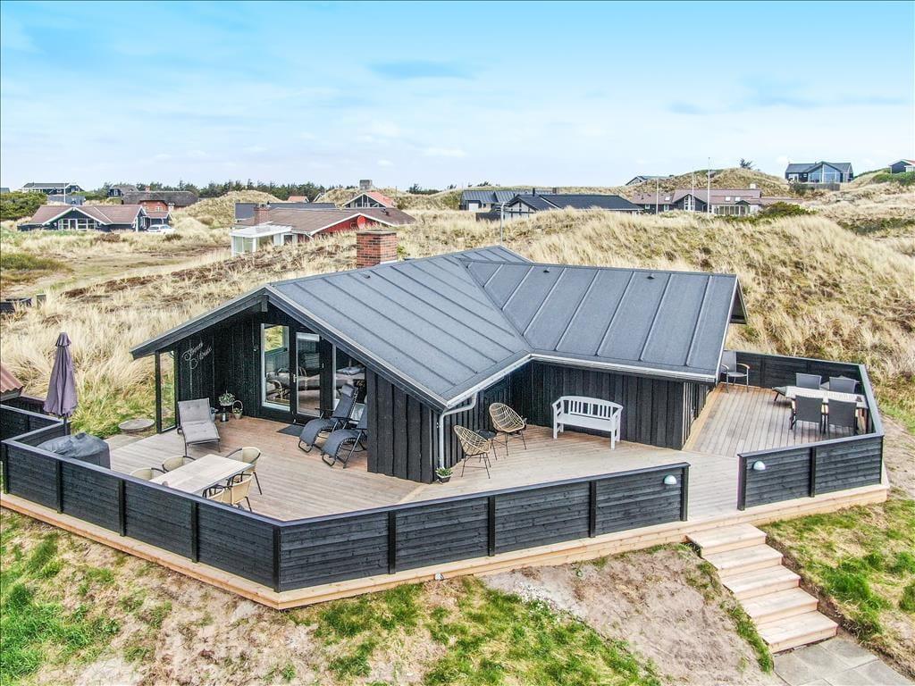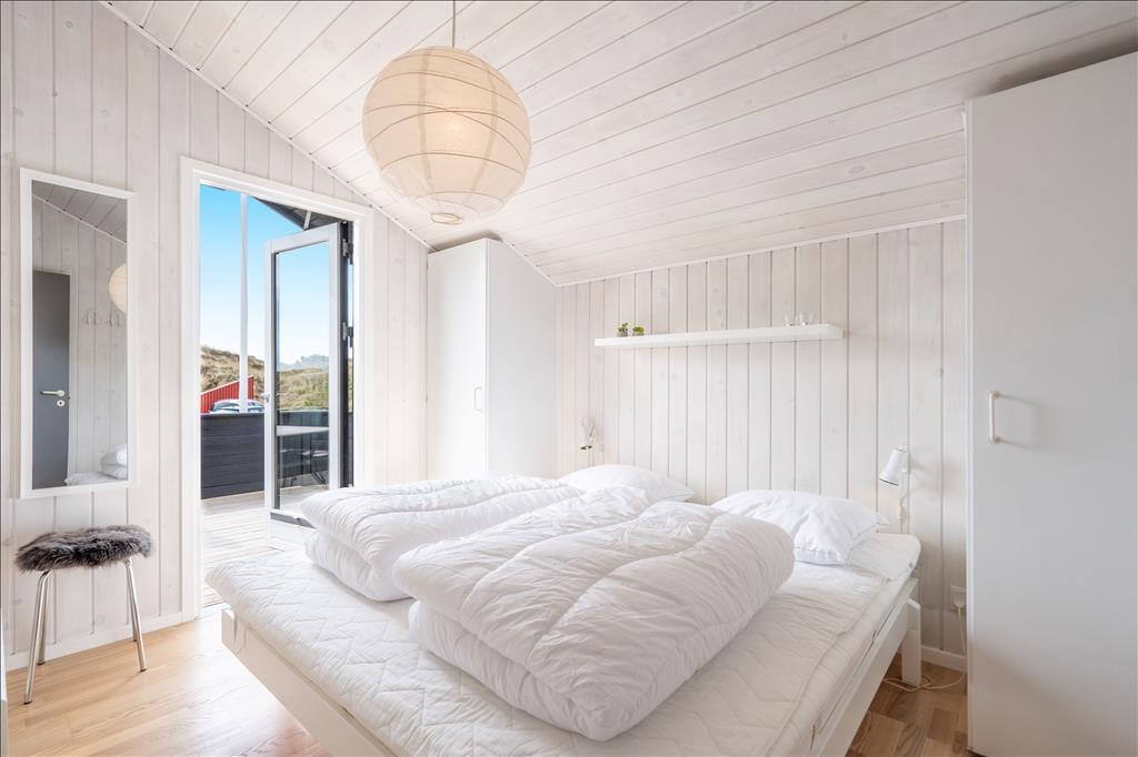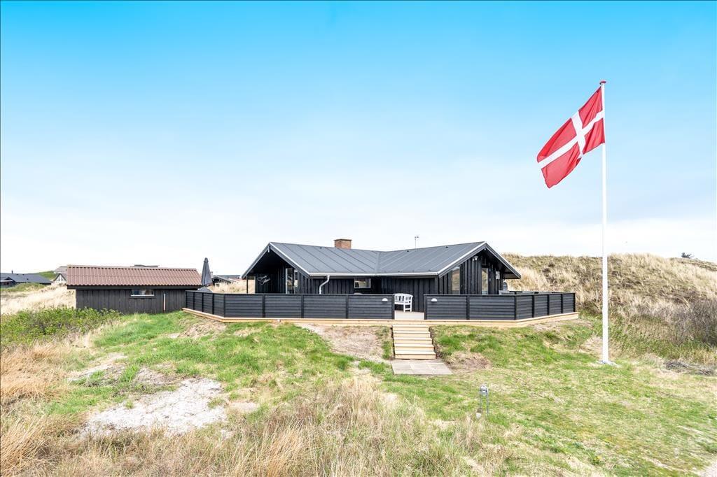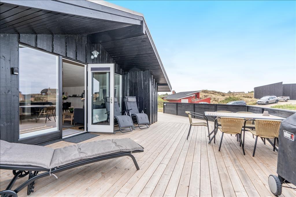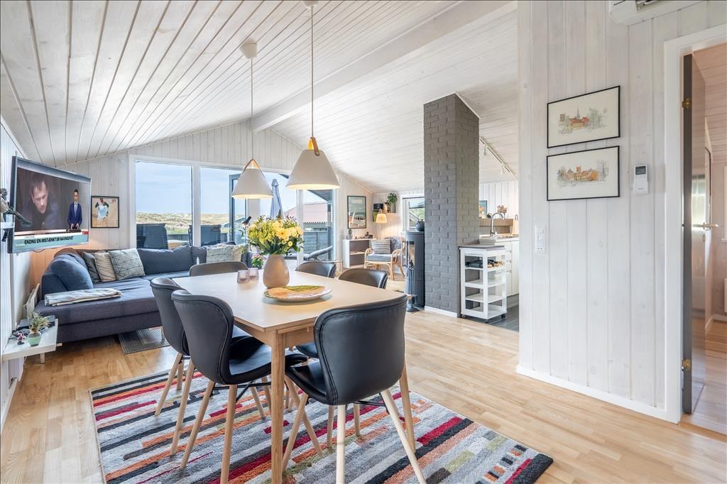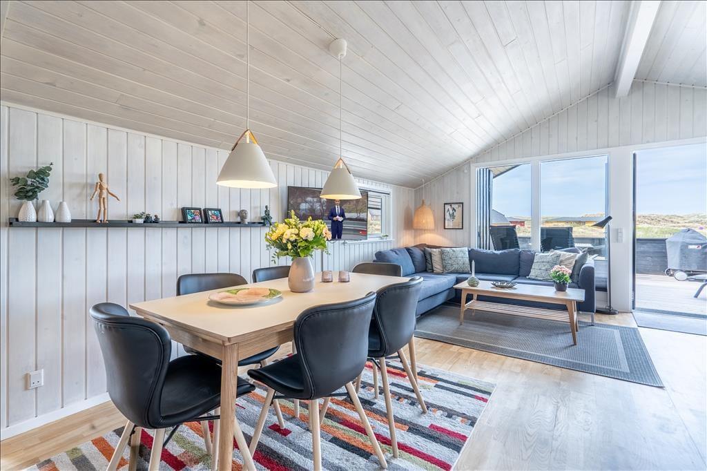Dette dejlige sommerhus, der er blevet totalrenoveret i 2021, ligger højt i det kuperede kystlandskab ud mod Houvig Strand. Vesterhavet venter bare en kort gåtur væk, og derhjemme på terrassen har I den fineste udsigt over områdets marehalmsklædte klitter, når I slapper af i havestolene.