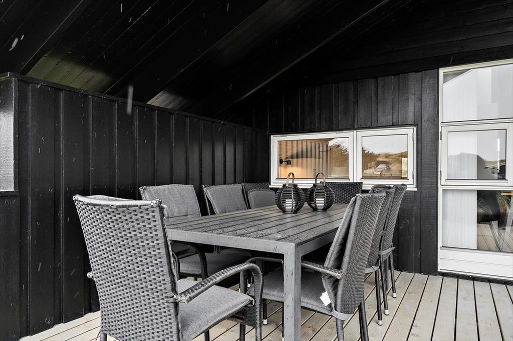 Fra sommerhuset har I direkte adgang til to delvist overdækkede terrasser. Den ene ligger i forlængelse af stuen, så på en solrig sommerdag kan I åbne terrassedøren og lade inde- og udemiljøet smelte sammen. Den sydvendte orientering betyder, at terrassen er dejligt solrig, og så har I tilmed udsigt til et åbent naturareal, der breder sig mellem nabohusene. Afskærmningen mod vest giver jer mulighed for at finde læ, hvis det blæser ind fra havet, og I kan se frem til mange skønne stunder med gode bøger eller lækker mad fra grillen.