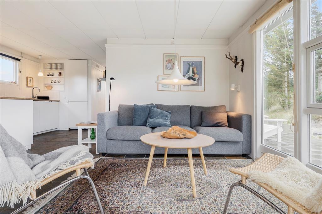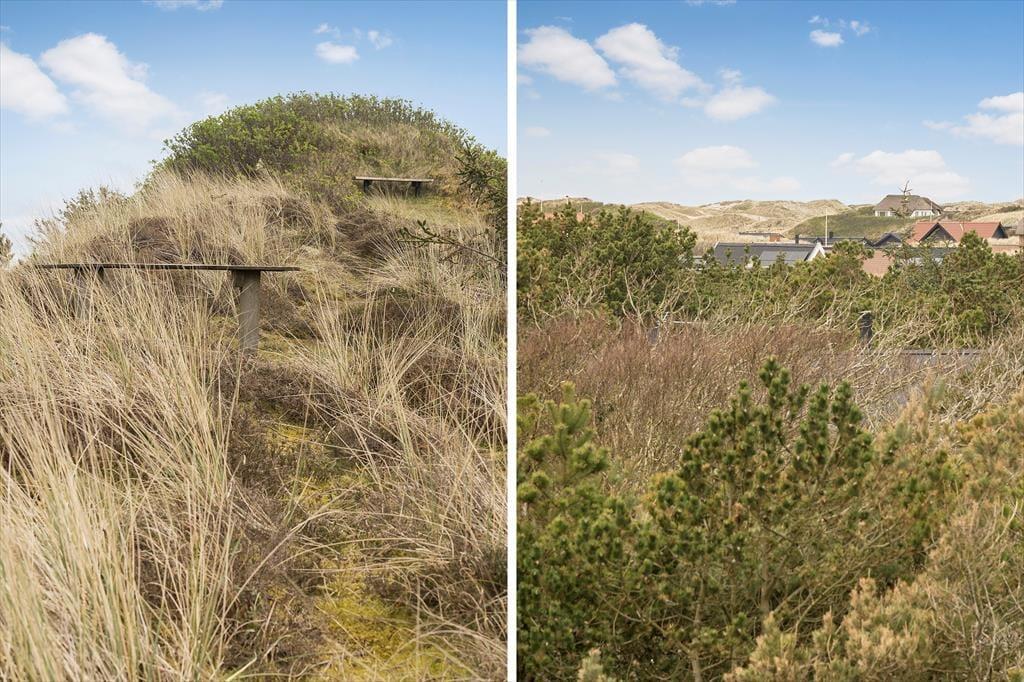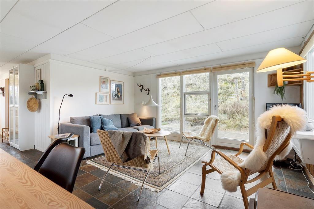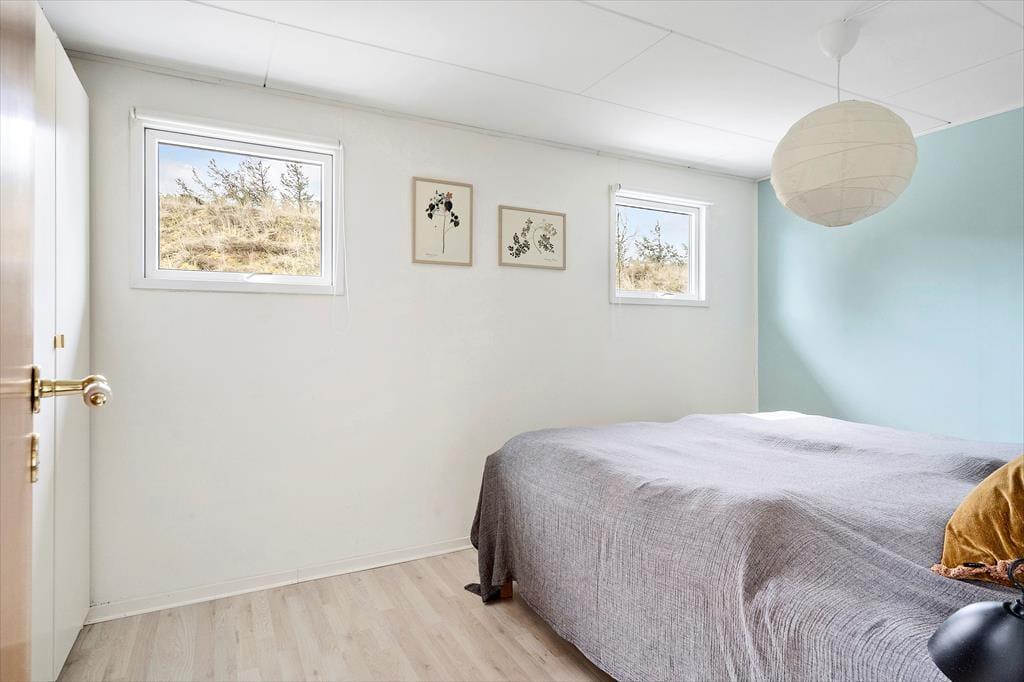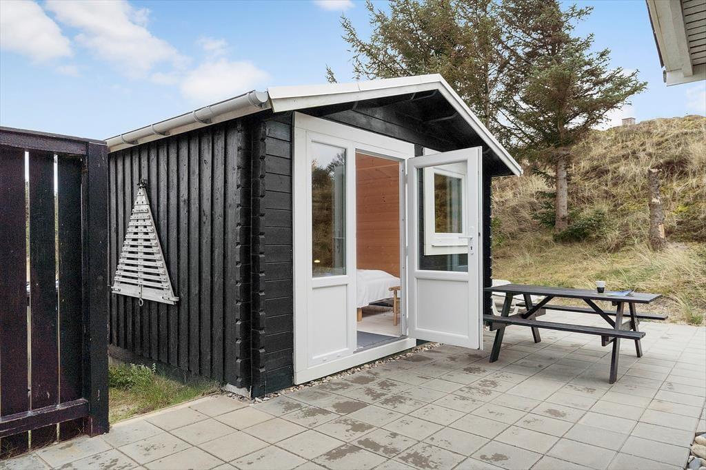 Det udendørs driverliv kommer til at udspille sig i ugenerede omgivelser, for terrassemiljøet skærmes ikke bare af sommerhuset og annekset, men også af naturgrundens klitter. Det giver dig ikke bare læ, men også noget kønt at kigge på, når du åbner øjnene efter dagens middagslur – og hvis du vil trække frisk luft og strække kroppen, kan du tage trinnene op på klittoppen, hvor du kan kigge ud over Houvig, mens du rigtigt vågner. Der er ud mod vejen god plads til at parkere.