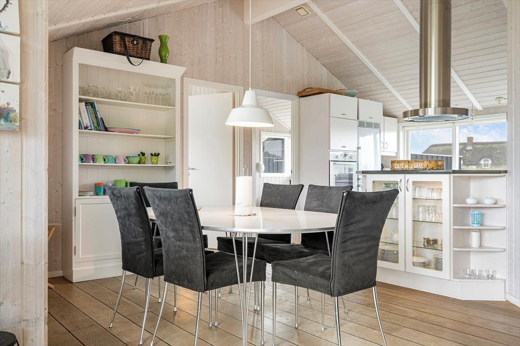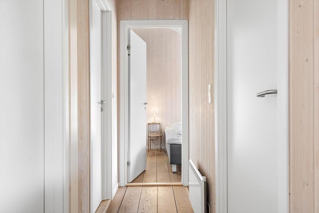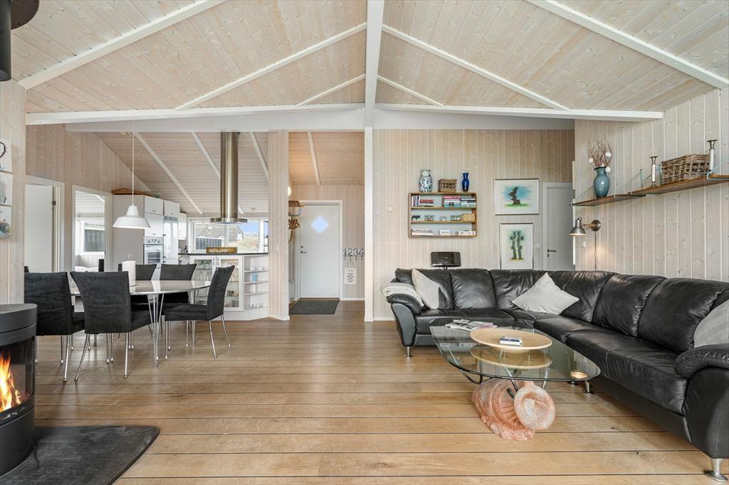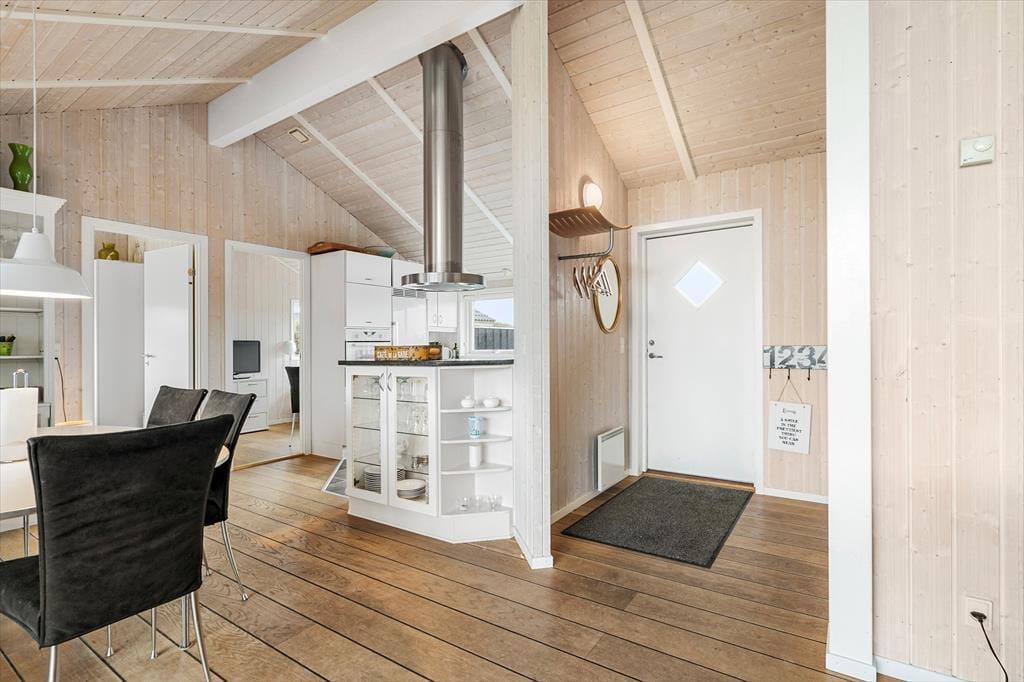 Sommerhuset er opført i 2005, måler 110 m2 og har en velfungerende planløsning til seks personer. Store vinduer inviterer dagslyset indenfor, og det hyggelige møblement, kiploftet og det flotte skibsgulv er alt sammen med til at skabe en rar og indbydende atmosfære. Stuen er udstyret med en brændeovn, og takket være den åbne forbindelse til køkken er det nemt at smutte hen efter en kop kaffe eller flere snacks, når I slapper af i sofaen med en god film. Et praktisk bryggers, et gæstetoilet og et badeværelse ligger i samme ende af huset. Her er badeværelset især værd at bemærke på grund af det lækre spabad, som kan tages i brug, så snart I trænger til wellness og afslapning. Når natten nærmer sig, kan I se frem til at sove godt på de fire fine soveværelser.