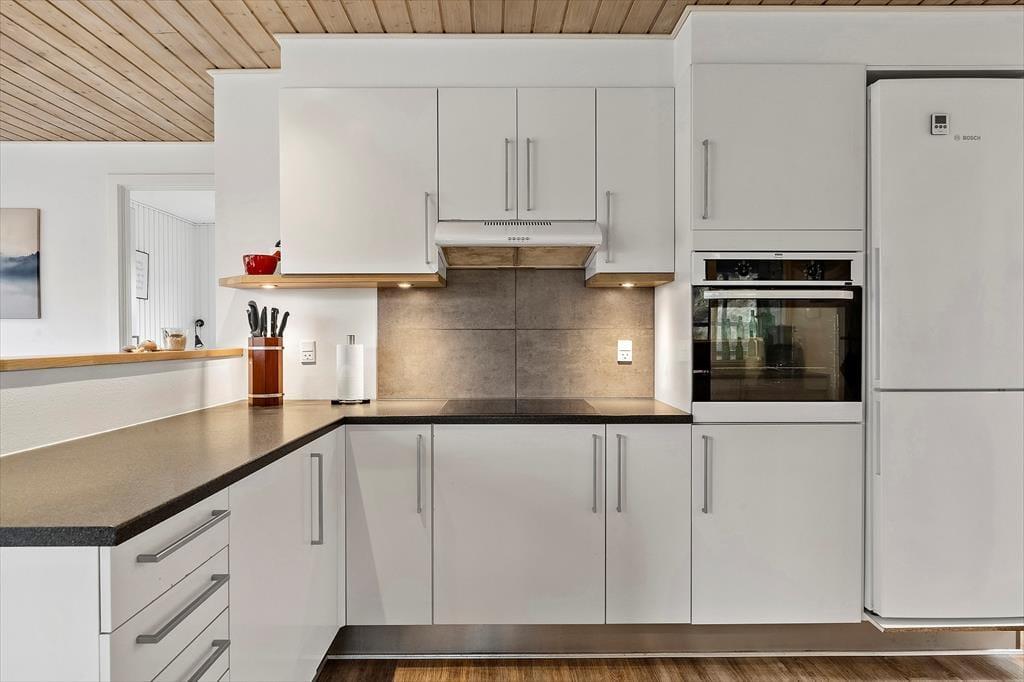 Fra stuen træder du direkte ud på den lukkede terrasse, som fungerer som en skøn forlængelse af opholdsrummet. Her glider inde- og udeliv naturligt sammen, og du kan lade terrassedøren stå åben på lune dage, så den friske havluft strømmer ind. Det er her, morgenkaffen smager lidt bedre, mens du lytter til havets brusen i det fjerne og mærker roen sænke sig.
