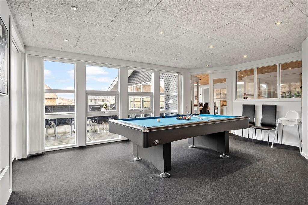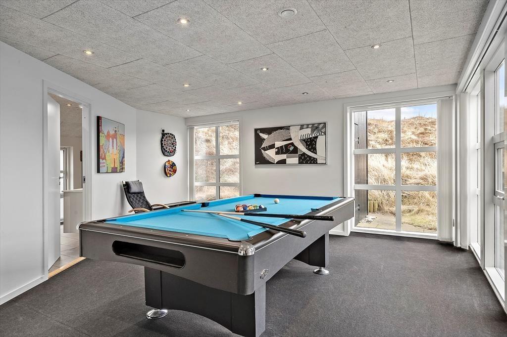 Sommerhusets wellnessafdeling med indendørs spa og sauna er et kapitel for sig. Forestil dig at sænke skuldrene i det varme vand efter en frisk gåtur ved stranden eller lade varmen fra saunaen brede sig i kroppen, mens roen sænker sig. Det er netop sådan en luksus, der løfter ferieoplevelsen fra god til helt særlig. Og som prikken over i’et finder du et aktivitetsrum med billard og dart – et oplagt samlingspunkt, hvor både børn og voksne kan udfordre hinanden og skabe sjove ferieminder.