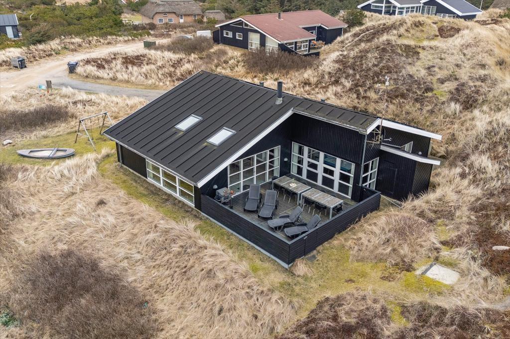 Den lukkede terrasse skaber trygge rammer, hvis du holder ferie med børn. De kan lege i sandkassen eller tage en tur på gyngen, mens du slapper af i havemøblerne. Den kuperede klitgrund omkring sommerhuset i Houvig fuldender oplevelsen af at være midt i den vestjyske natur – med marehalm, små stier og bløde klitter som nærmeste naboer. Når aftenen falder på, og grillen tændes, kan du nyde de lange sommeraftener under åben himmel, mens solens sidste stråler farver klitlandskabet gyldent.