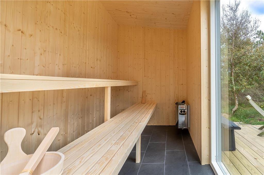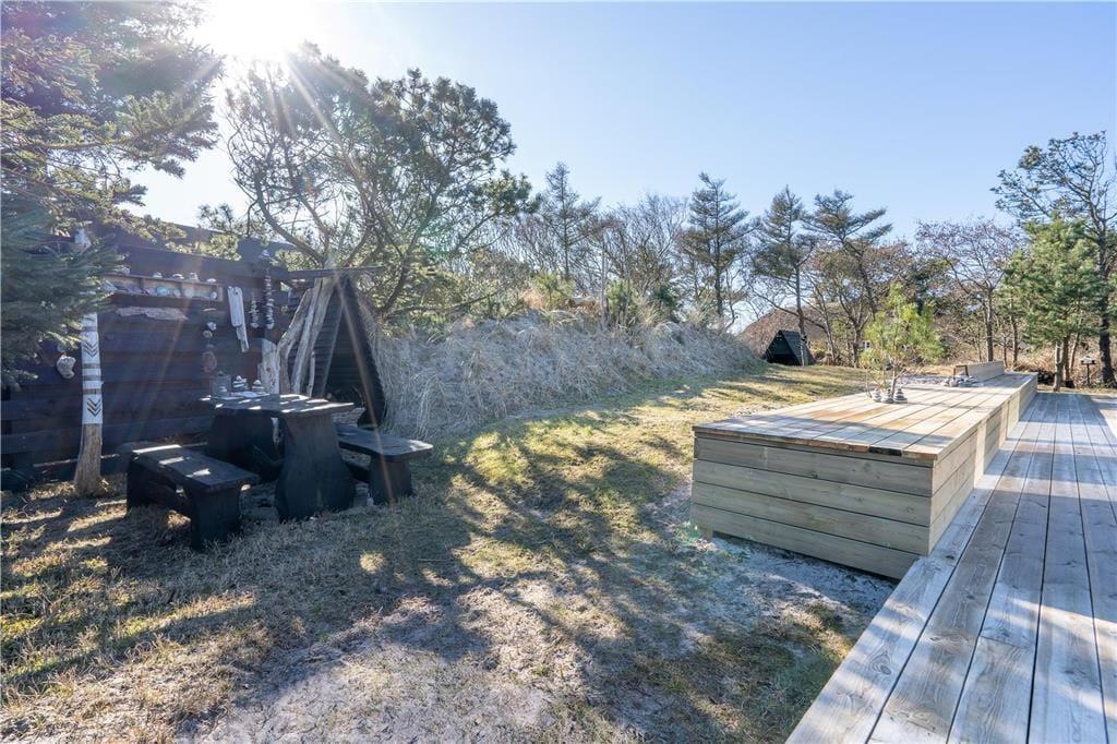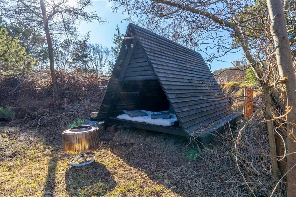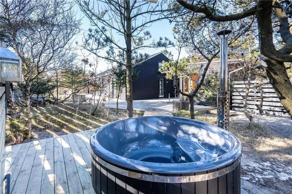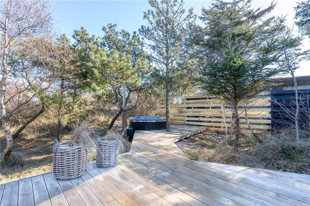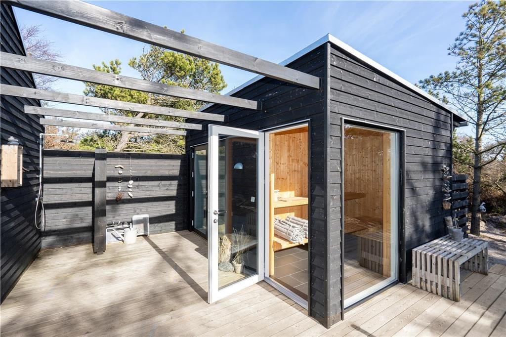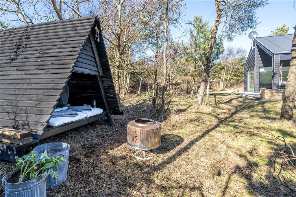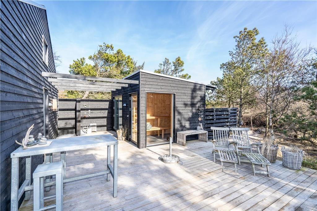 Når vejret er godt, er sommerhusets store naturgrund det ultimative ferieparadis. Børn og barnlige sjæle kan gå på opdagelse mellem de krogede træer og buske, og på græsset såvel som på den delvist overdækkede terrasse har I mange skønne opholdspladser og lækroge at vælge imellem – inklusiv et shelter, hvor I kan tilbringe natten under stjernehimlen, mens Vesterhavet bruser i det fjerne. Det allerbedste er nu næsten terrassens wellness-faciliteter, for i forlængelse af husets badeværelse finder I nemlig en udebruser og en stor sauna med panoramavindue. Mellem træerne står et vildmarksbad, så hvis I ikke er i humør til en frisk havdukkert, kan I læne jer tilbage i det varme vand.