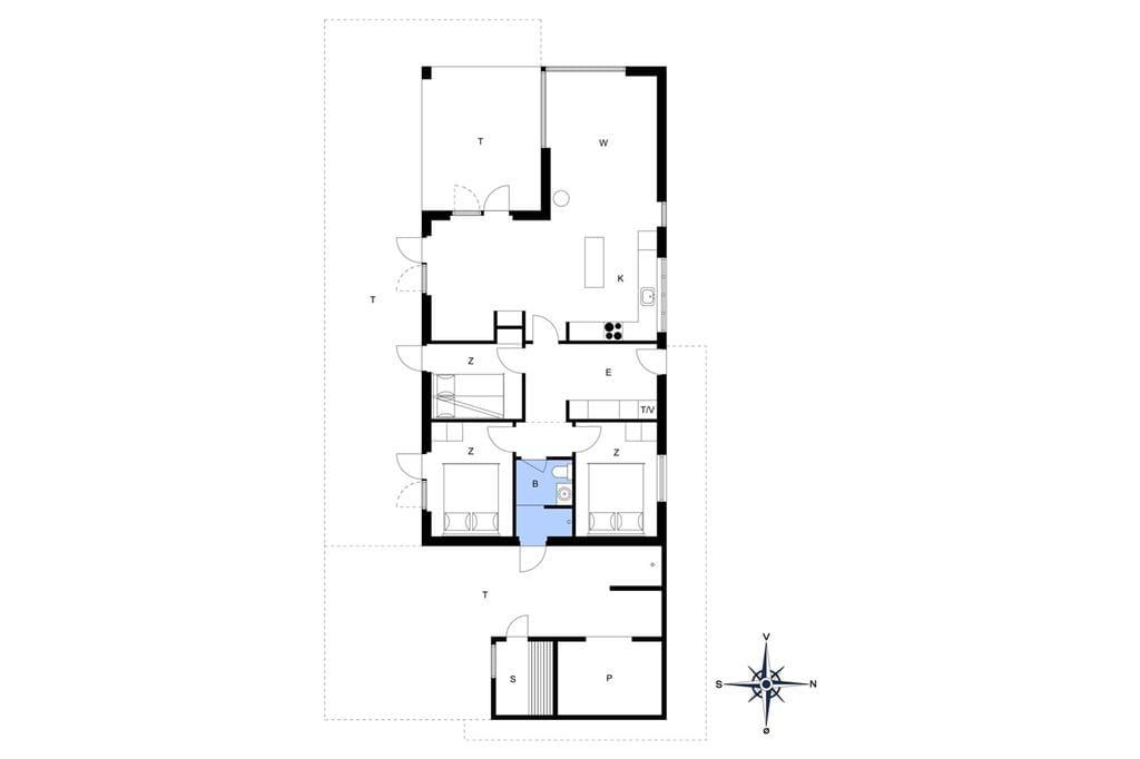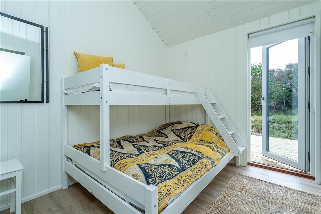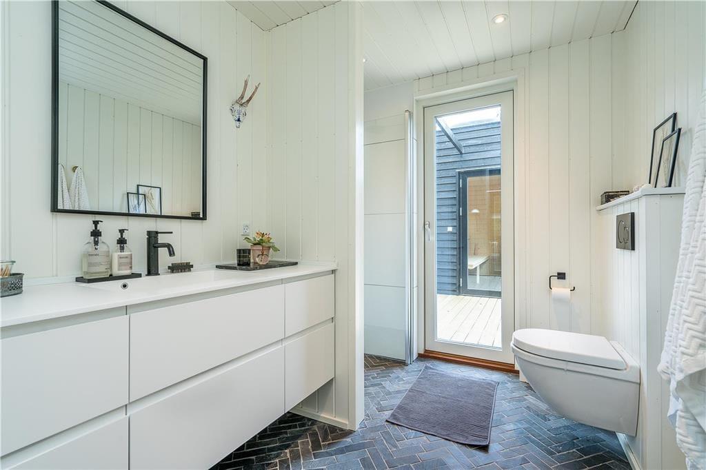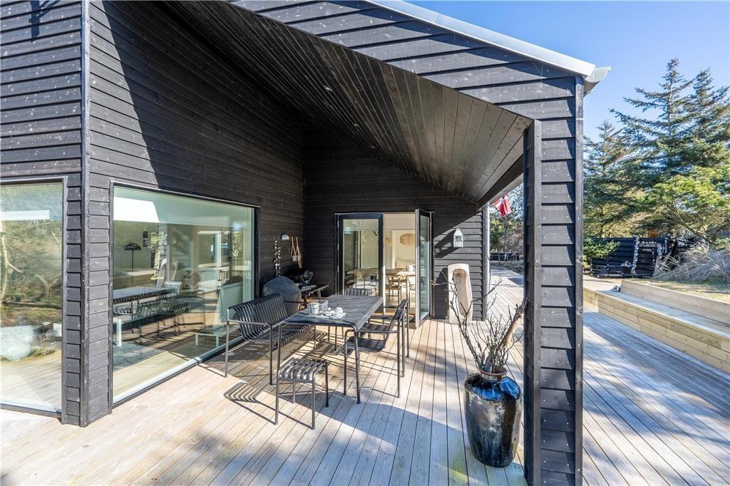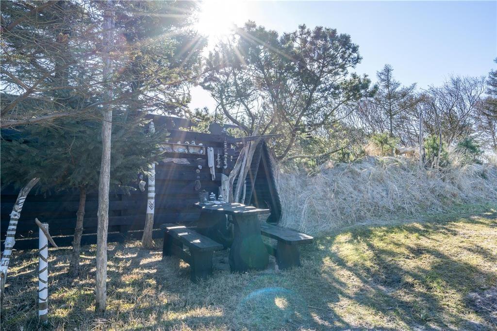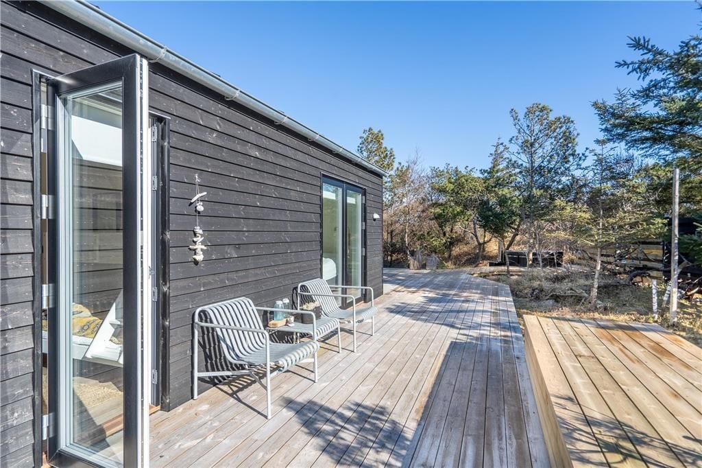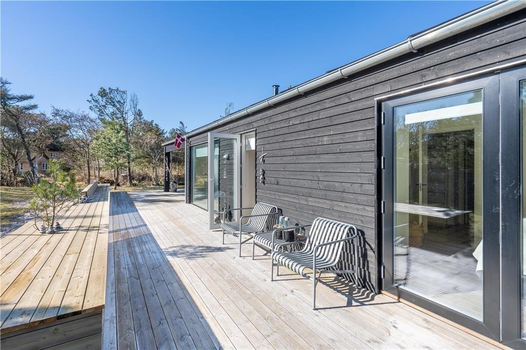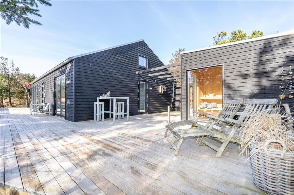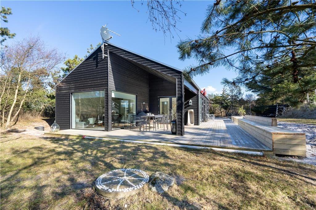 Når vejret er godt, er sommerhusets store naturgrund det ultimative ferieparadis. Børn og barnlige sjæle kan gå på opdagelse mellem de krogede træer og buske, og på græsset såvel som på den delvist overdækkede terrasse har I mange skønne opholdspladser og lækroge at vælge imellem – inklusiv et shelter, hvor I kan tilbringe natten under stjernehimlen, mens Vesterhavet bruser i det fjerne. Det allerbedste er nu næsten terrassens wellness-faciliteter, for i forlængelse af husets badeværelse finder I nemlig en udebruser og en stor sauna med panoramavindue. Mellem træerne står et vildmarksbad, så hvis I ikke er i humør til en frisk havdukkert, kan I læne jer tilbage i det varme vand.