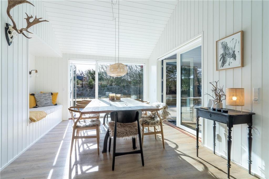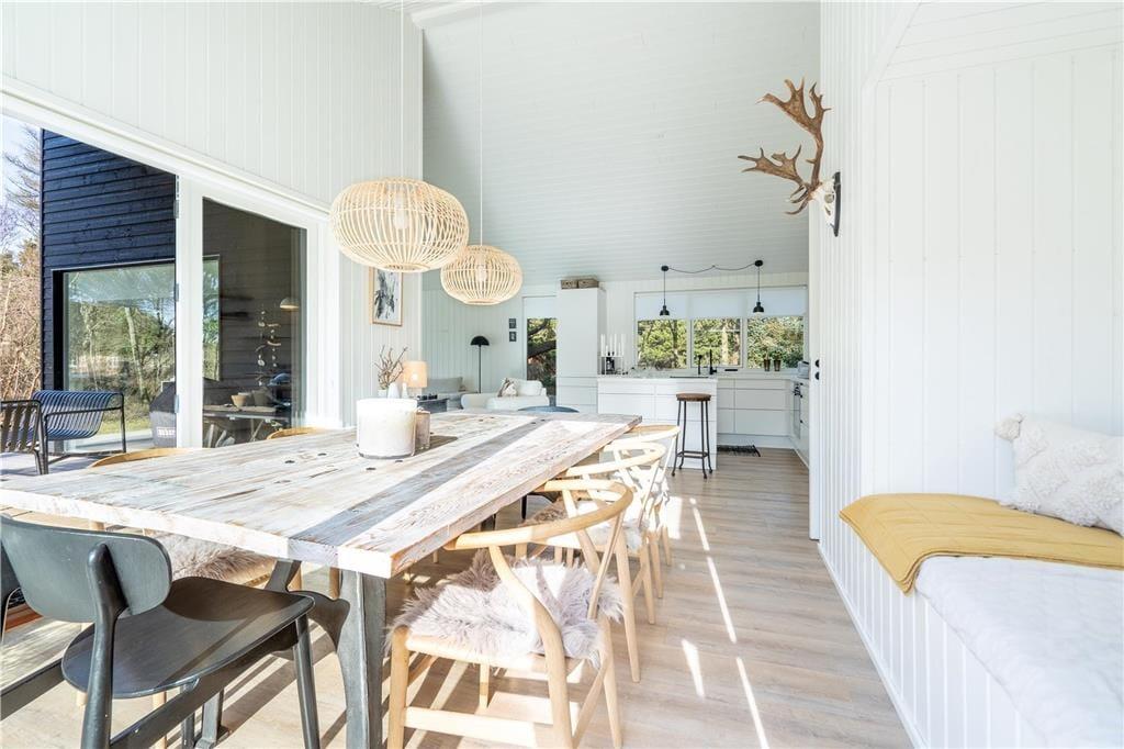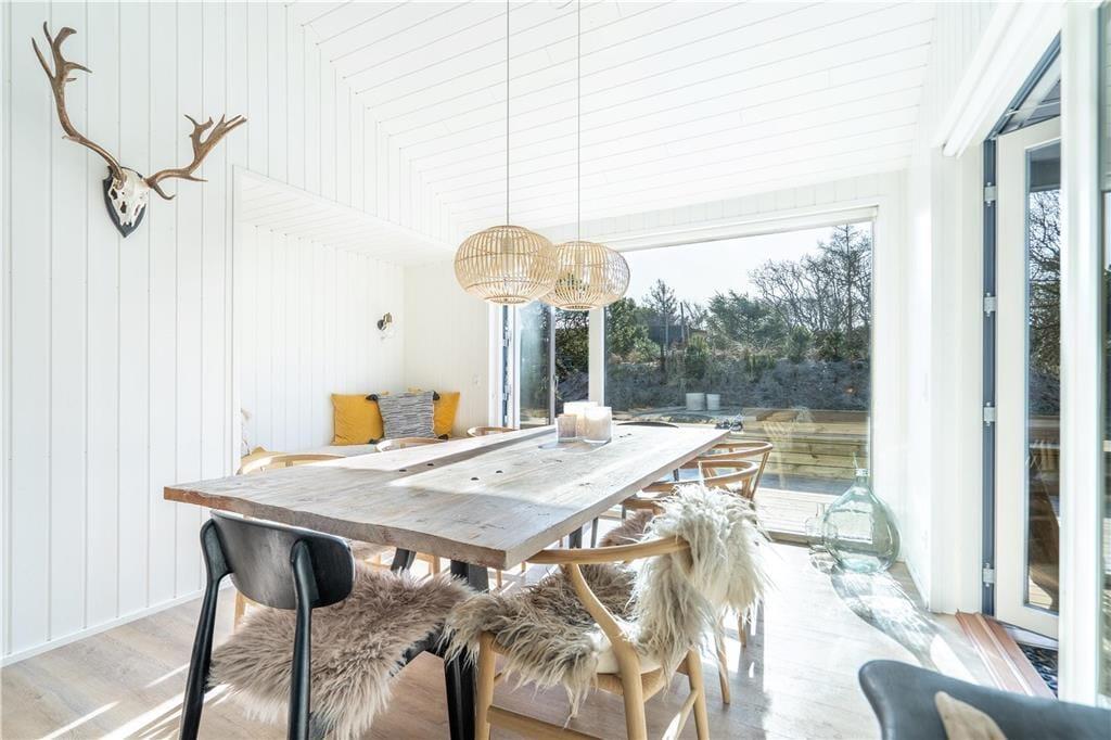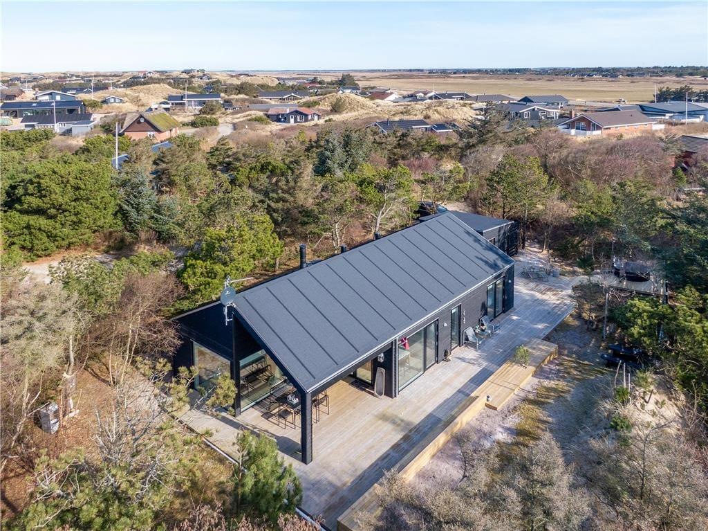 Lækre luksusdetaljer og naturskønne omgivelser er flot forenet på Spættedalen 1 ved Houvig Strand. Dette moderne livsnydersommerhus på 108 m2 har en stilfuld indretning såvel som et dejligt wellnessområde på terrassen, og når I bevæger jer væk fra den skovklædte grund, har I kun fem minutters gang til det mægtige Vesterhav.