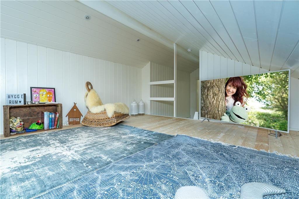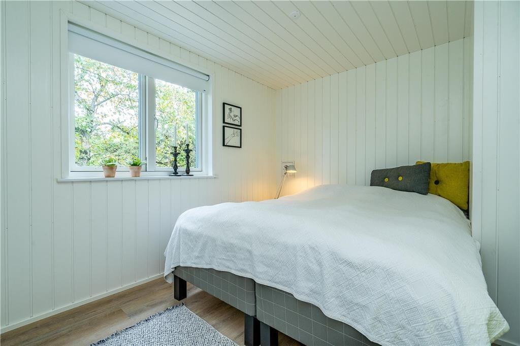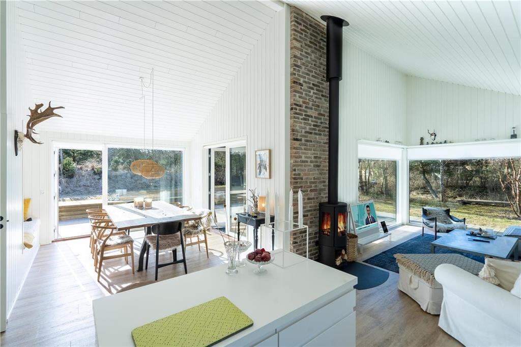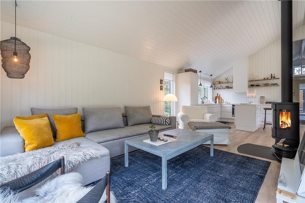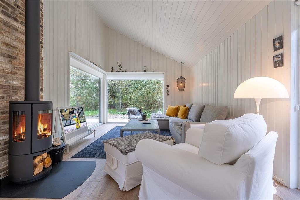 Den høje kvalitet kan mærkes lige fra ankomsten, når I ser sommerhusets elegante, mørke facade mellem naturgrundens træer. Facadens store vinduespartier trækker naturen helt ind i huset, så når I laver mad i det åbne køkken eller slænger jer i stuens sofa nær brændeovnen, har I udsigt til det grønne. Ved opholdsafdelingens spiseafsnit har I en god alkove at hygge jer i, og husets store hems kan sikkert hurtigt blive udnævnt som børnenes foretrukne hule. En rummelig entré og et lækkert brusebadeværelse hører også med til planløsningen, og på de tre soveværelser kan I se frem til en god nats søvn i de komfortable senge.