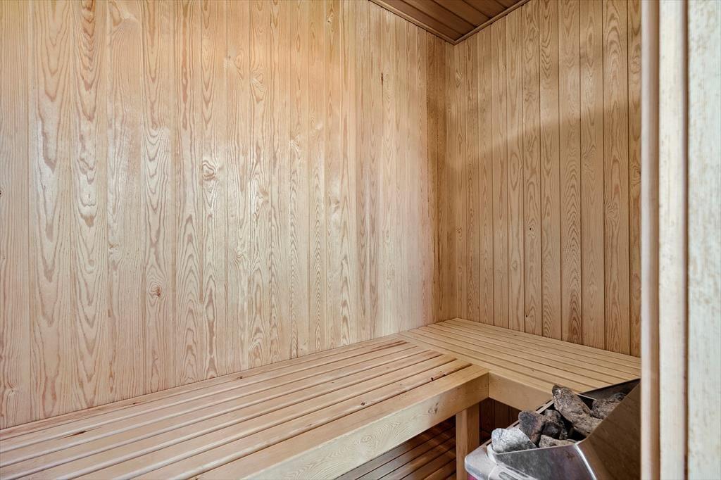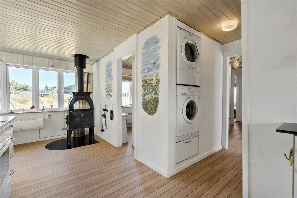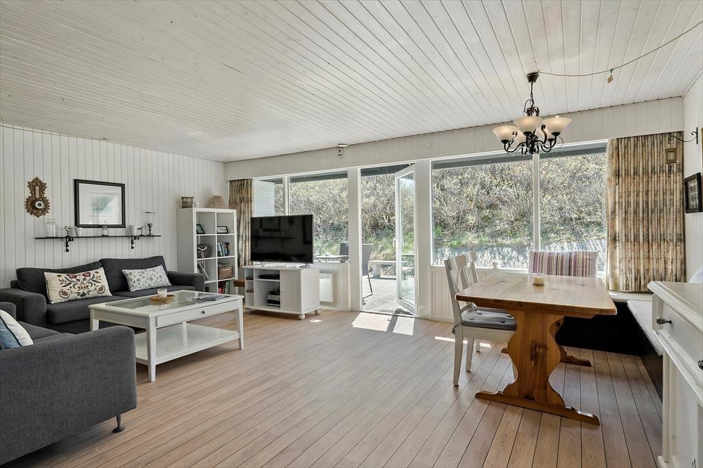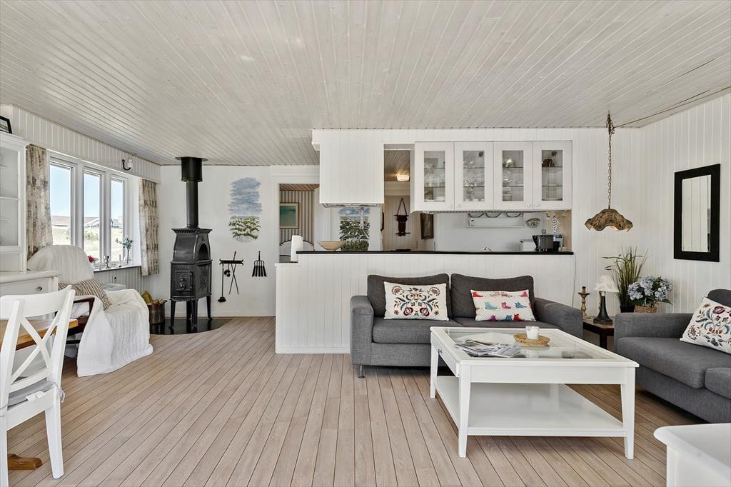 Der hviler en skøn atmosfære over huset – ikke mindst i stuen, der er indrettet med komfortable møbler, brændeovn og stort fladskærms-tv. Det er et dejligt sted at slappe af med en spændende krimi eller et sjovt spil, og det åbne køkken gør det let at gøre madlavningen til en hyggelig fællesaktivitet. Tre gode soveværelser hører med til planløsningen, der også inkluderer et badeværelse med bruseniche og sauna. I gangen er der vaskesøjle, hvis I får brug for at friske feriegarderoben op, og til det alleryngste familiemedlem er der en barneseng og en højstol til rådighed.