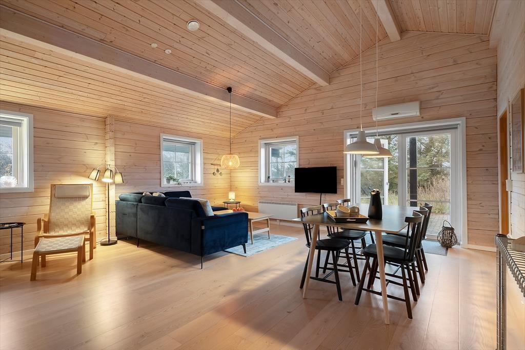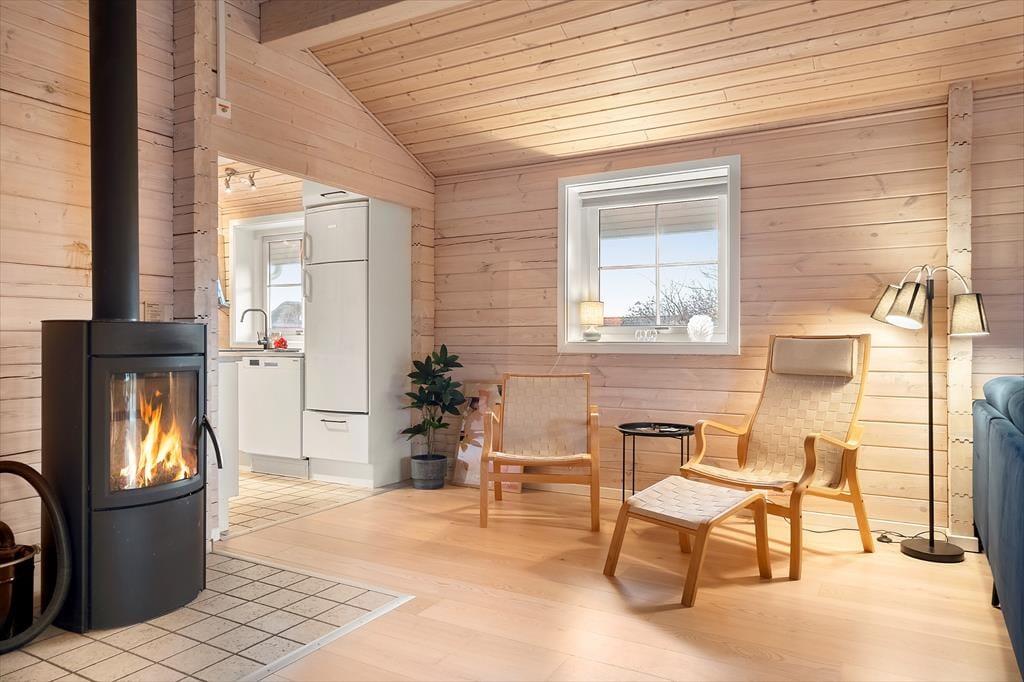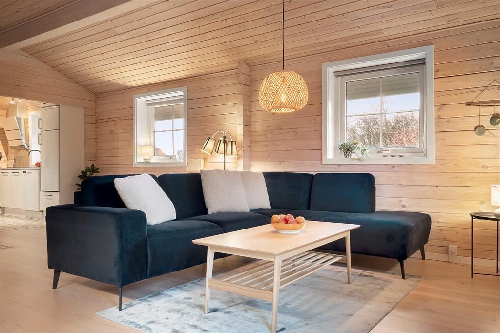 Dette hyggelige bjælkehus fra 2009 ligger i naturskønne omgivelser i Houvig, tæt på Vesterhavet og Houvig Strand. Huset byder på et lyst og venligt interiør med loft til kip, lyse trævægge og en brændeovn i stuen, der skaber en varm og indbydende atmosfære.