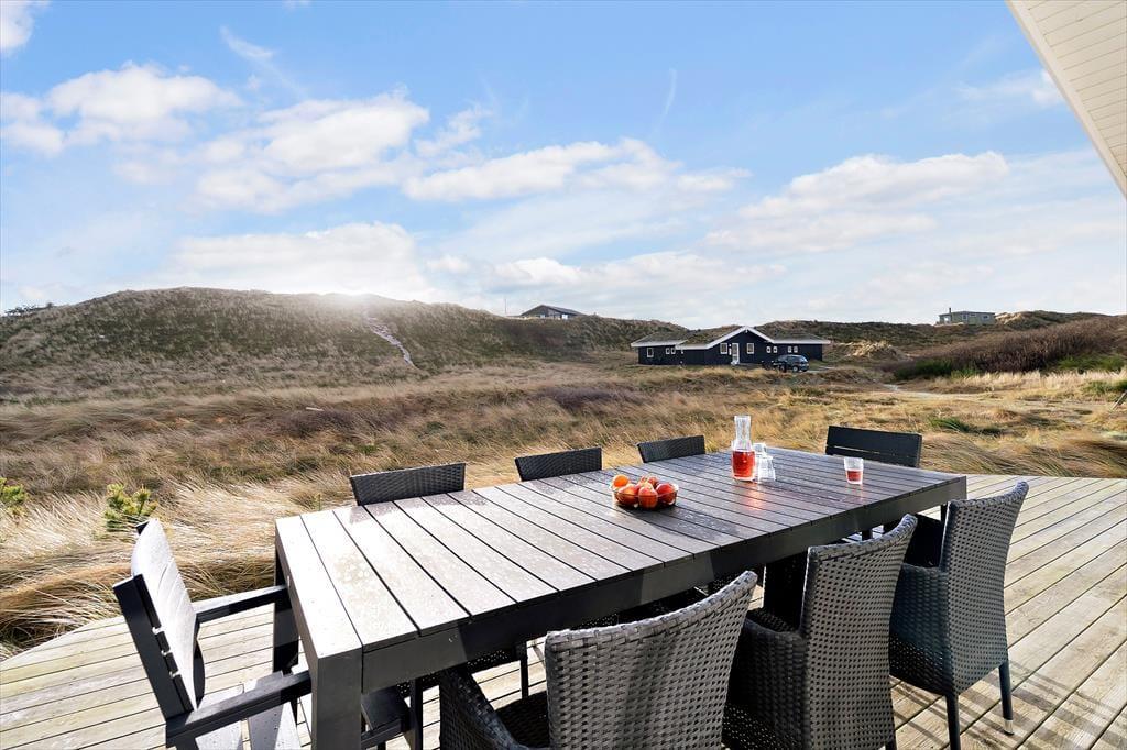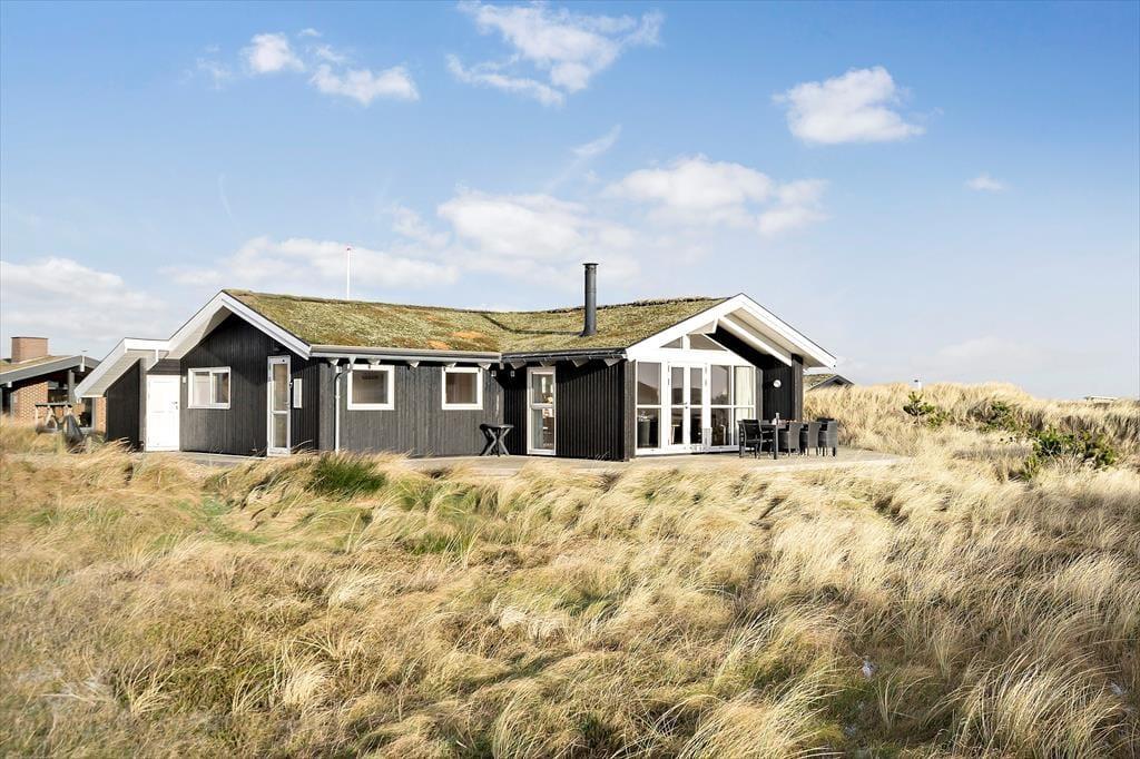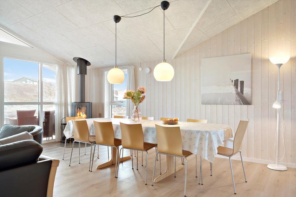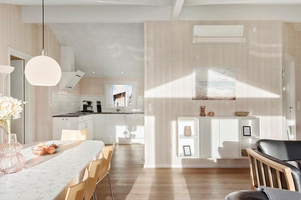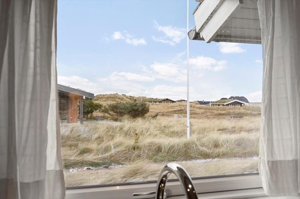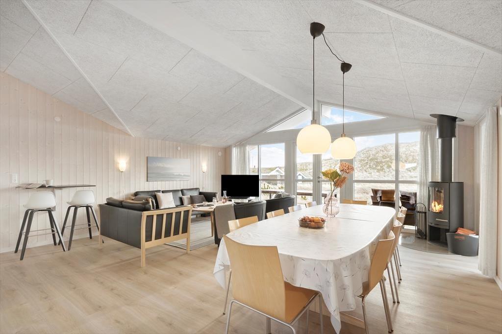 Sommerhuset er bygget i 2017 og overalt fremstår huset velholdt og flot og gennemført i kvalitetsmaterialer. Det dejlige og store kombinerede køkkenalrum og stue er husets hjerte. Her er der lyse trævægge og lofter, der går til kip. Køkkenet er lyst og lækkert indrettet og har alle moderne hjælpemidler bl.a. opvaskemaskine og er godt udstyret så madlavningen bliver nemt. I stuen kan I hygge jer foran brændeovnen og nyde flammerne bag glasset. Et stort fladskærms SMART TV med parabol sørger for underholdningen og en god bog i de komfortable lædermøbler er også dejlig på en blæsevejrs dag. Der er desuden spiseplads og en hyggekrog, hvor du kan sidde og arbejde med din laptop. Fra de store vinduer i stuen har man en fantastisk udsigt over det kuperede terræn og klitterne. De store vinduer giver et godt lys i hele stuen og køkkenet. Der er to badeværelser, begge med bruser, toilet og klinkegulv med gulvvarme. Derudover har det ene badeværelse spa og sauna.