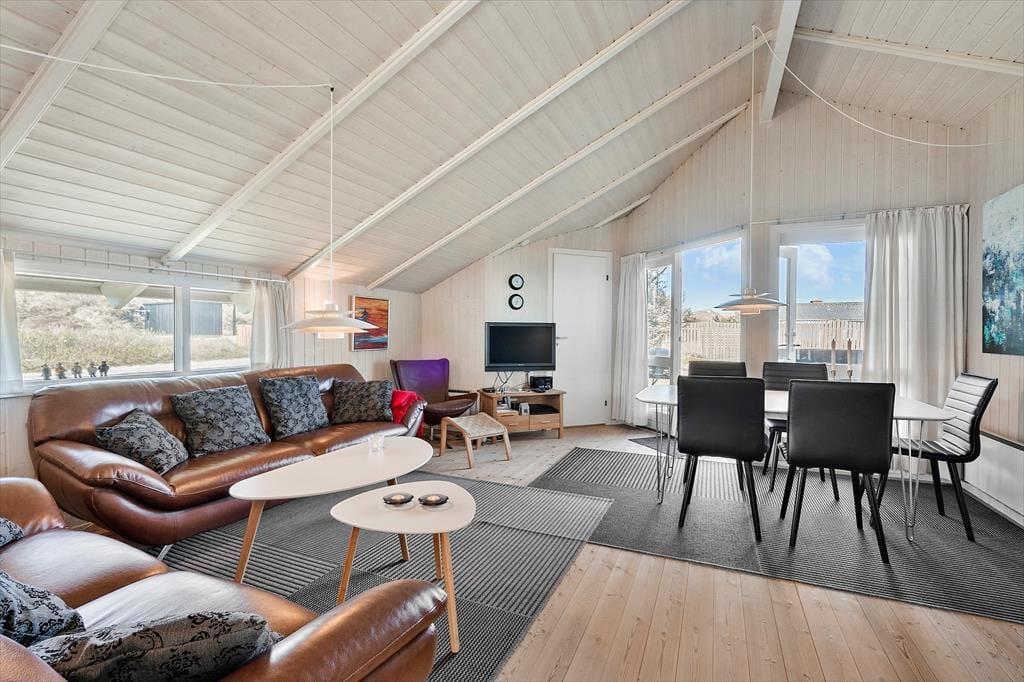 Ude nyder I godt af, at I befinder jer i et kuperet landskab med spredte sommerhuse på små, stille veje. Alt ånder fred og idyl, og klitterne skærmer af mod vinden – og sikrer jer en køn udsigt, når I slapper af på terrassen eller leger på den store naturgrund. Til børnene er der sandkasse og gyngestativ, og uanset om I sidder på den åbne østterrasse eller den delvist overdækkede terrasse mod vest, foregår driverlivet i gode havemøbler. I har også adgang til en grill, og til elbilen findes en ladeboks (type 2-stik, medbring selv kabel).