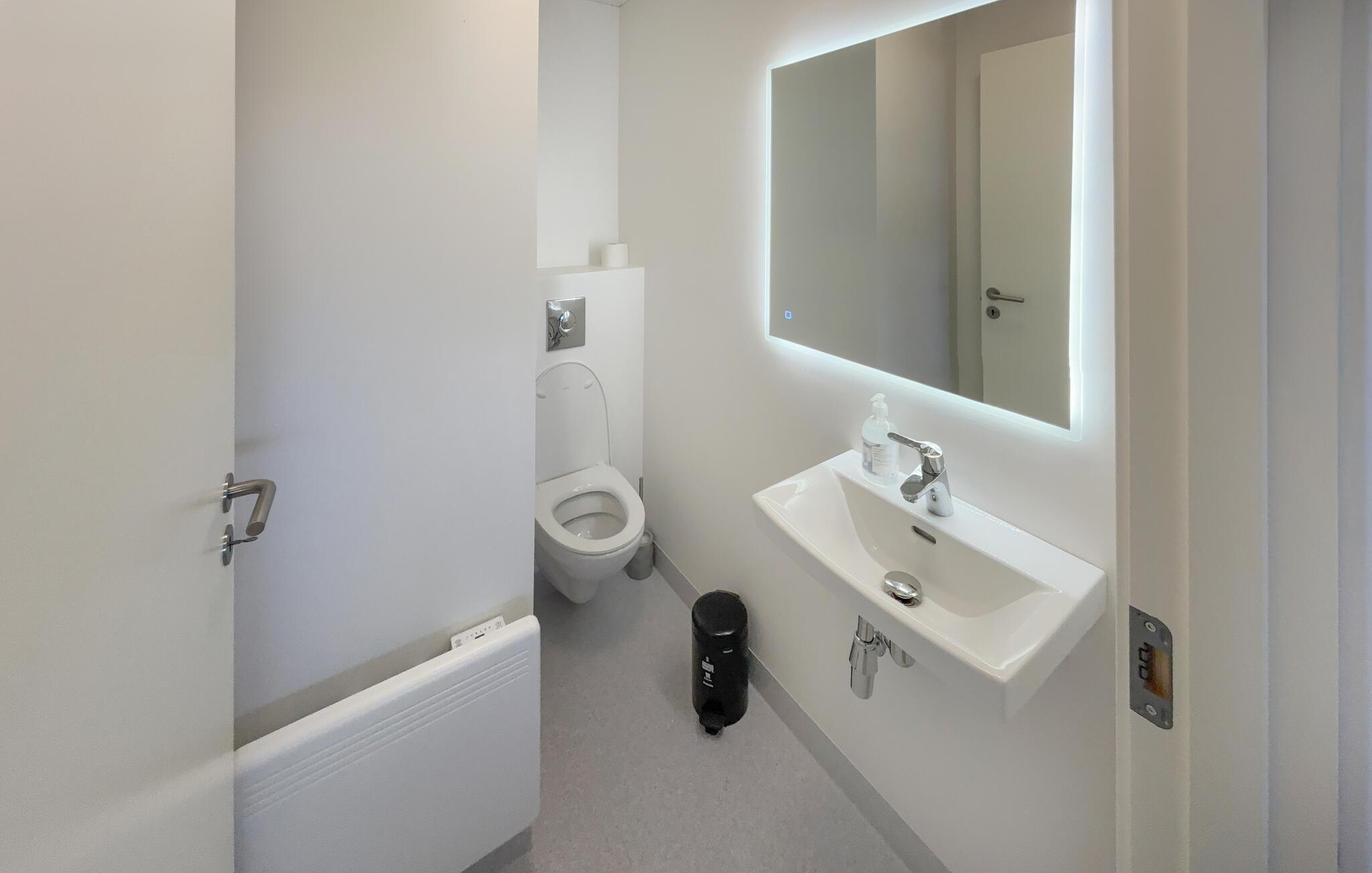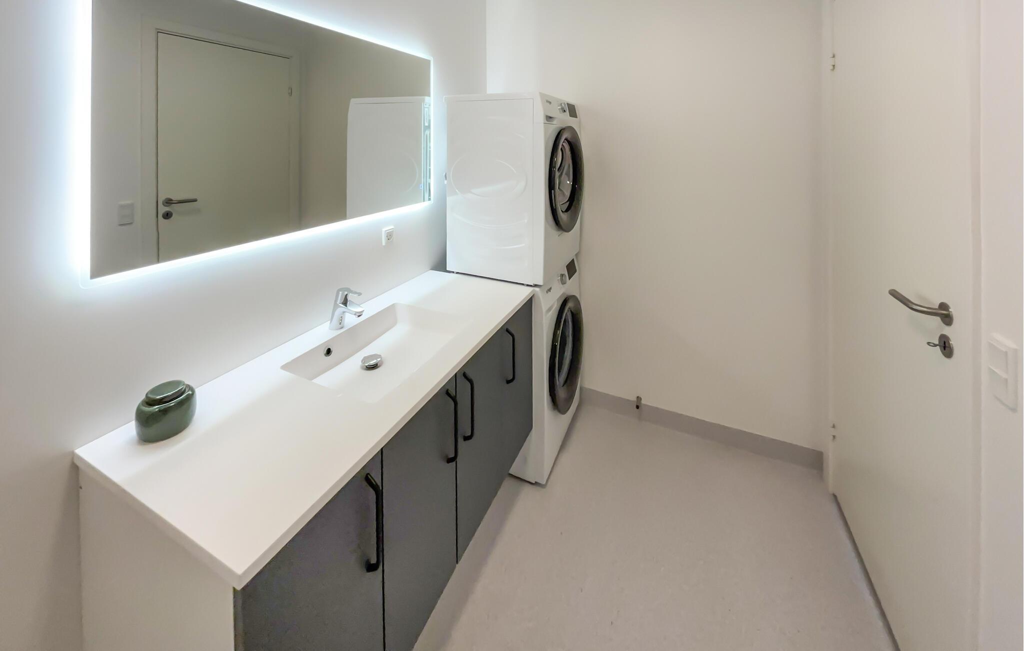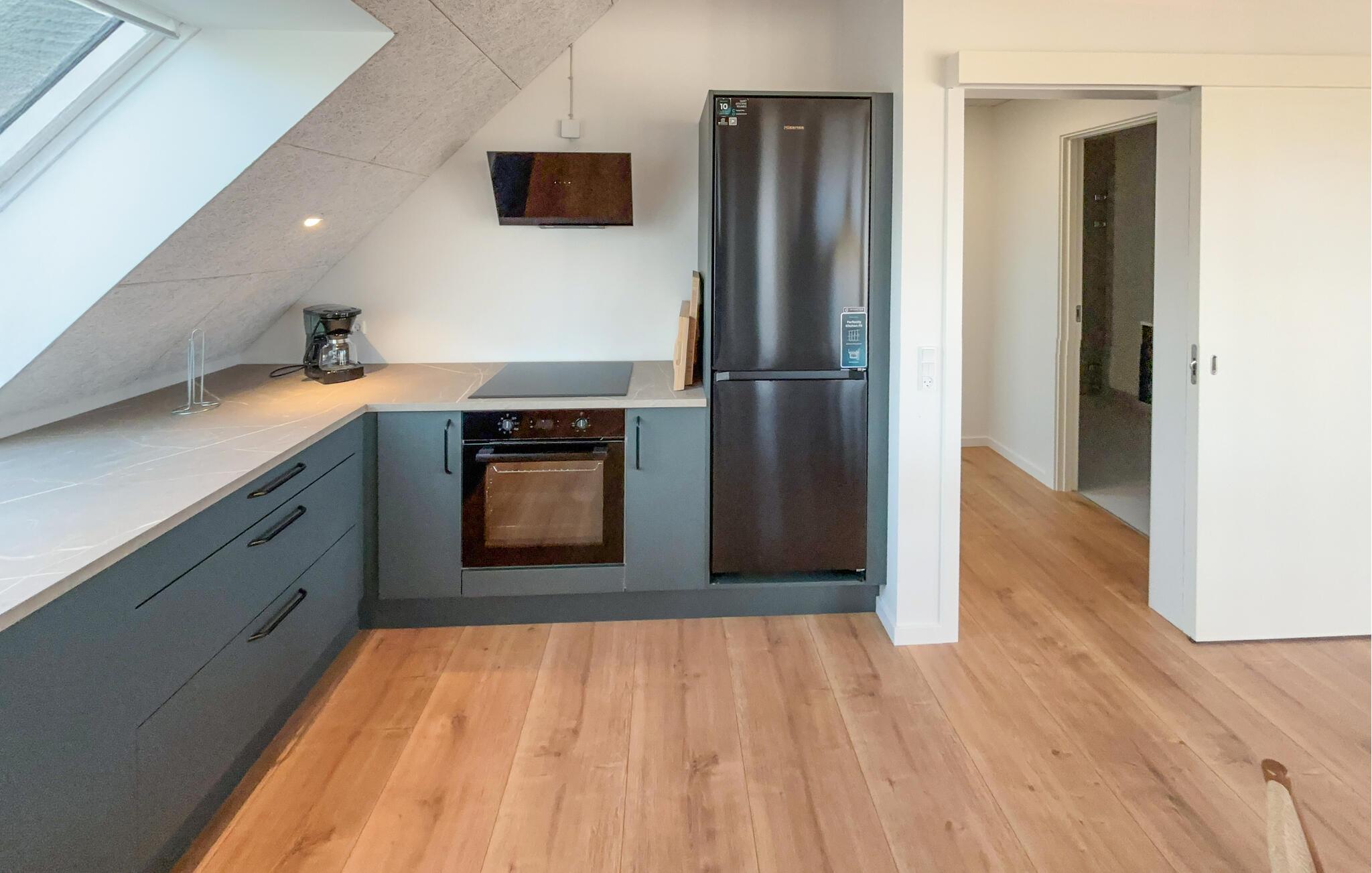 Opholdsstuen har lyse farver og store vinduer, der tilbyder en betagende udsigt over landskabet. Sæt jer godt til rette i de komfortable lænestole og nyd at slappe af i rolige omgivelser. De synlige træbjælker tilføjer et varmt præg og komplementerer det moderne, nordiske design. Find sammen omkring det runde spisebord ved siden af ??det moderne køkken og del hyggelige øjeblikke med venner og familie.